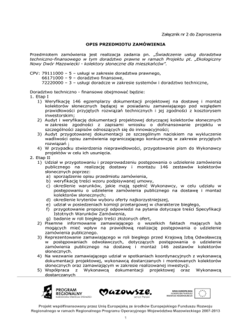 Załącznik nr 2 do Zaproszenia OPIS PRZEDMIOTU ZAMÓWIENIA Przedmiotem zamówienia jest realizacja zadania pn. „Świadczenie usług doradztwa techniczno-finansowego w tym doradztwo prawne w ramach Projektu pt. „Ekologiczny Nowy Dwór Mazowiecki - kolektory słoneczne dla mieszkańców”. CPV: 79111000 – 5 – usługi w zakresie doradztwa prawnego, 66171000 – 9 – doradztwo finansowe, 72220000 – 3 – usługi doradcze w zakresie systemów i doradztwo techniczne, Doradztwo techniczno - finansowe obejmować będzie: 1. Etap I 1) Weryfikację 146 egzemplarzy dokumentacji projektowej na dostawę i montaż kolektorów słonecznych będącej w posiadaniu zamawiającego pod względem prawidłowości przyjętych rozwiązań technicznych i jej zgodności z kosztorysem inwestorskim; 2) Audyt i weryfikację dokumentacji projektowej dotyczącej kolektorów słonecznych w zakresie zgodności z zapisami wniosku o dofinansowanie projektu w szczególności zapisów odnoszących się do innowacyjności; 3) Audyt przygotowanej dokumentacji ze szczególnym naciskiem na wykluczenie wadliwości opisu zamówienia ograniczającego konkurencję w zakresie przyjętych rozwiązań ; 4) W przypadku stwierdzenia nieprawidłowości, przygotowanie pism do Wykonawcy projektów w celu ich usunięcia. 2. Etap II 1) Udział w przygotowaniu i przeprowadzeniu postępowania o udzielenie zamówienia publicznego na realizację dostawy i montażu 146 zestawów kolektorów słonecznych poprzez: a) sporządzenie opisu przedmiotu zamówienia, b) weryfikację treści wzoru podpisywanej umowy, c) określenie warunków, jakie mają spełnić Wykonawcy, w celu udziału w postępowaniu o udzielenie zamówienia publicznego na dostawę i montaż kolektorów słonecznych; d) określenie kryteriów wyboru oferty najkorzystniejszej, e) udział w posiedzeniach komisji przetargowej w charakterze biegłego, f) przygotowanie propozycji odpowiedzi na pytania dotyczące treści Specyfikacji Istotnych Warunków Zamówienia, g) badanie w roli biegłego treści złożonych ofert, 2) Pisemne informowanie zamawiającego o wszelkich faktach mających lub mogących mieć wpływ na prawidłową realizację postępowania o udzielenie zamówienia publicznego. 3) Reprezentowanie zamawiającego w roli biegłego przed Krajową Izbą Odwoławczą w postępowaniach odwoławczych, dotyczących postępowania o udzielenie zamówienia publicznego na dostawę i montaż 146 zestawów kolektorów słonecznych. 4) Na wezwanie zamawiającego udział w spotkaniach koordynacyjnych z wykonawcą dokumentacji projektowej, wykonawcą dostarczanych i montowanych kolektorów słonecznych oraz zamawiającym w zakresie realizowanej inwestycji. 5) Współpraca z Wykonawcą dokumentacji projektowej oraz Wykonawcą dostarczanych Projekt współfinansowany przez Unię Europejską ze środków Europejskiego Funduszu Rozwoju Regionalnego w ramach Regionalnego Programu Operacyjnego Województwa Mazowieckiego 2007-2013 1 i montowanych kolektorów słonecznych w ramach zamiennych projektów wykonawczych i optymalizacji kosztów. Czynność obejmuje w szczególności analizę, opiniowanie i weryfikację zamiennej dokumentacji projektowej. 6) Współpraca i udział w przygotowaniu i organizacji odbioru końcowego inwestycji przez zamawiającego. 7) Wykonywanie w razie potrzeby innych czynności wynikających z zasad prowadzenia projektów, a które są niezbędne do prawidłowej realizacji Projektu w celu szeroko rozumianego zabezpieczenia interesu zamawiającego; 3. Termin realizacji zadania od dnia podpisania umowy do dnia 20 grudnia 2013 roku, przy czym: 1) Etap I – od dnia podpisania umowy do 20.12.2012; 2) Etap II – od dnia 21.01.2012 do dnia 20.12.2013. 4. Świadczenie usług doradztwa techniczno - finansowego będzie realizowane poprzez: Usługi doradztwa świadczone drogą telefoniczną Usługi doradztwa świadczone drogą mailową Spotkania konsultacyjne (nie częściej niż 9 w ciągu roku) pobyty na terenie montażu kolektorów słonecznych (nie częściej niż 3 razy w kwartale) upoważnionych przedstawicieli Wykonawcy, po uprzednim wezwaniu przez Zamawiającego, z co najmniej 2 - dniowym wyprzedzeniem. Pobyty przedstawicieli Wykonawcy będą każdorazowo potwierdzane w karcie usług doradztwa techniczno – finansowego. Projekt współfinansowany przez Unię Europejską ze środków Europejskiego Funduszu Rozwoju Regionalnego w ramach Regionalnego Programu Operacyjnego Województwa Mazowieckiego 2007-2013 2