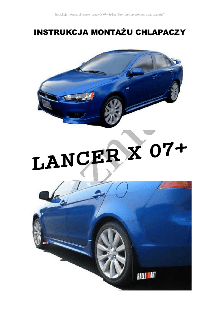 Instrukcja montażu chlapaczy Lancer X 07+ Sedan / Sportback opracowana przez „zezniaa” INSTRUKCJA MONTAŻU CHLAPACZY Instrukcja montażu chlapaczy Lancer X 07+ Sedan / Sportback opracowana przez „zezniaa” WSTĘP Chlapacze powstały na bazie oryginalnych chlapaczy Mitsub ishi przeznaczonych do modelu Lancer Evolution zezn ia. Zostały odpowiednio zmodyfiko wane by pasowały do Lancera X 07+ Sedan / Sportback . Chlapacze 100% pasują do tego modelu sa mochodu i nie wymagają żadnych przeróbek. Mocowane są przy użyciu oryg inalnych sp inek, które posiadasz przy samochodzie oraz kilku elementów dodatkowych. Nie musisz dokony wać żadnych modyfikacji, wiercić otworów itd. Nie niszczysz nadkoli, progó w ani innych elementów samochodu. Chlapacze możesz zdemontować i n ie zosta je żaden ślad po ich instalacji. Montaż jest bezproblemo wy. Trwa w zależności od sprawności osoby instalującej mieczy 20 – 40 minut. Nie musisz podnosić auta na lewarku c zy podnośniku . Nie musisz zdejmować kó ł. Instrukcja montażu chlapaczy Lancer X 07+ Sedan / Sportback opracowana przez „zezniaa” 1. W SKŁAD ZESTAWU WCHODZĄ 2x chlapacze przód + 2x chlapacze ty ł 2x W1 wkręt dłuższy + 2x W2 wkręt krótszy (z podkładkam i) 2x K1 blaszka kątowa mniejsza + 2x K2 blaszka kątowa większa (z nakrętkami blaszanymi) 2. NIEZBĘDNE NARZĘDZIA - wkrętak Phillips PH3 (średnica końcówki ok. 6mm) długości min . 15cm mier ząc bez uchwytu - wkrętak p łaski o ostrej końcówce szerokości 3-5 mm - wkrętak Phillips PH1 lub PH2 krótki (długość całko wita z uch wytem ok . 10cm) - końcówka do wkrętaka Ph illips PH2 wc iśnięta w k lucz płaski nr.6 Instrukcja montażu chlapaczy Lancer X 07+ Sedan / Sportback opracowana przez „zezniaa” 3. PUNKTY MONTAŻOWE: PUNKT MON TAŻOWY WEWNĄTRZ NADKOLA PUNKT MON TAŻOWY OD SPODU AUTA widok z boku auta od spodu auta (tył) Instrukcja montażu chlapaczy Lancer X 07+ Sedan / Sportback opracowana przez „zezniaa” 4. RODZAJE SPINEK MONTAŻOWYCH: Spinka A Używana przy przedn im nadkolu . Rozpięcie spinki polega na podłożeniu ostrego płaskiego śrubokręta międ zy kołnierz spinki a łeb bolca rozp ierającego i wysunięcie bolca o około 5-7mm. Zap ięcie po lega na wciśnięc iu bolca rozpierającego do oporu (us łyszysz kliknięc ie) Spinka B Spinka używana do przymoco wania dolne j częśc i nadkola tylnego do elementu zderzaka / dyfuzora tylnego, od dołu auta. Działan ie tej spinki jest identyczne jak spinki A, spinka ta jest ciaśniej spasowana – mocniej trzyma, dlatego posiada na kołnierzu cztery wpusty , które u łatwiają rozp ięcie, należy z nią postępo wać delikatnie, podważać łebek na zmianę z k ilku stron . Spinka C Używana przy tylnym nadkolu. Spinka ta w odróżnieniu do poprzednich przeznaczona jest do otworu kwadratowego, a nie okrągłego. Łeb bo lca rozpierającego posiada wpust na śrubokręt krzyżakowy. Spinka ta jest ciasno spasowana – mocno trzyma. Rozpięcie jej polega na przekręceniu bolca rozpierającego przy użyciu śrubokręta w lewo (odwrotnie do biegu wskazó wek zegara). Zapięcie po lega na wciśnięciu sp inki do oporu (usłyszysz kliknięcie), przed uprzednim ustawien iem bo lca rozpiera jącego w odpowiednie j pozycji. Należy zwrócić ogromną wagę na dobór śrubokręta krzyżakowego, musi być idealnie dopasowany. Jego końcówka nie może być za mała, gdyż na 100% zniszczysz spinkę, lepiej użyć lekko za dużej końcówki. Należy również skorzystać z możliwie długiego wkrętaka, aby minąć się z oponą (spójrz na zdjęcia niżej) Instrukcja montażu chlapaczy Lancer X 07+ Sedan / Sportback opracowana przez „zezniaa” 5. MONTAŻ PRZEDNIEGO CHLAPACZA Skręć koła w odpo wiednią stronę, aby zrobić sob ie lepszy dostęp . Rozepnij 4 spinki w nadkolu i wyjmij je. Są to spink i typu A (przeczytaj opis spinek). Odegnij lekko czarny plastik nadkola na tyle abyś mógł nałożyć blachonakrętkę B1 na ucho blachy nadkola z otwore m mocujący m w miejscu wska zanym pomarańczową strzałką. Po przyłożeniu chlapacza zapnij 3 sp inki w miejscach wska zanych przez błękitne strzałki, a w punkcie montażo wym wskazanym pomarańczową strza łką dokręć chlapacz poprzez tu leję dystansową T1 przy użyciu wkręta W1 z podkładką. Instrukcja montażu chlapaczy Lancer X 07+ Sedan / Sportback opracowana przez „zezniaa” 6. MONTAŻ TYLNEGO CHLAPACZA Rozepnij 2 spinki tylnego nadkola. Są to spinki typu C (przec zytaj opis spinek). Zwróć uwagę na dobór śrubokręta (długość i rodzaj końcówki). Zły dobór może grozić uszkodzeniem spinki. Rozepnij spinkę mocującą wewnętrzną część nadkola z dolną częścią zderzaka / dyfuzora pod spodem auta. Spinka ta to typ B (przeczytaj op is sp inek). Instrukcja montażu chlapaczy Lancer X 07+ Sedan / Sportback opracowana przez „zezniaa” Podłuż blaszkę kątową K1 pomiędzy oba elementy plastikowe. Po zap ięciu sp inki, wygląda to tak (od spodu). Instrukcja montażu chlapaczy Lancer X 07+ Sedan / Sportback opracowana przez „zezniaa” Po zap ięciu sp inki, wygląda to tak (od strony nadkola). Zapnij spinki tylnego nadkola wc iskając je w zaznaczonym kierunku. Bolec rozpierający spinkę ma lekki luz w osi obroty (na rozpiętej spince), co pozwala na lekki jego obrót w lewo bądź w prawo przy zapinan iu (wciskaniu go). Zwróć uwagą, że aby poprawnie zapiąć sp inkę należy skręcić go leciutko w lewo tak by nie napotkał na skośne prowad zenie służące do rozpinania spinki) Wkrętem W2 pr zy pomocy końcówki wc iśniętej w klucz płaski dokręć chlapacz w trzecim punkcie montażowym do blaszki kontowe j K1 . Instrukcja montażu chlapaczy Lancer X 07+ Sedan / Sportback opracowana przez „zezniaa” Chlapacze wyprodukowane przez „ze zniaa” na bazie projektu opracowanego przez „ze zniaa”. Niniejsza instrukcja opracowana przez „ze zniaa”. Wszystkie prawa 