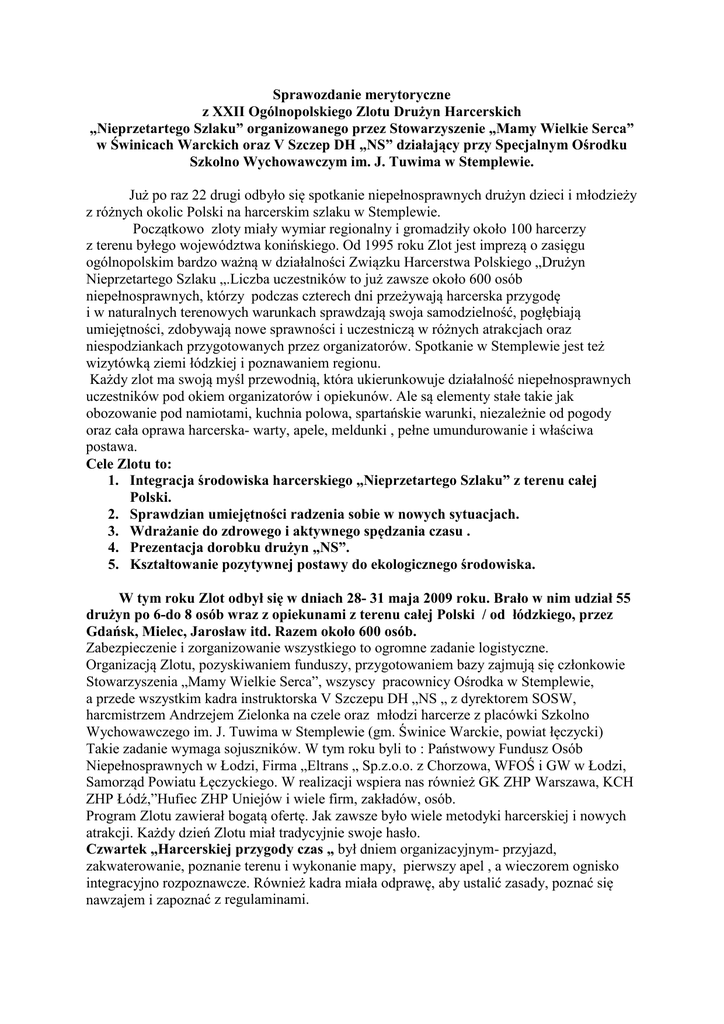 Sprawozdanie merytoryczne z XXII Ogólnopolskiego Zlotu Drużyn Harcerskich „Nieprzetartego Szlaku” organizowanego przez Stowarzyszenie „Mamy Wielkie Serca” w Świnicach Warckich oraz V Szczep DH „NS” działający przy Specjalnym Ośrodku Szkolno Wychowawczym im. J. Tuwima w Stemplewie. Już po raz 22 drugi odbyło się spotkanie niepełnosprawnych drużyn dzieci i młodzieży z różnych okolic Polski na harcerskim szlaku w Stemplewie. Początkowo zloty miały wymiar regionalny i gromadziły około 100 harcerzy z terenu byłego województwa konińskiego. Od 1995 roku Zlot jest imprezą o zasięgu ogólnopolskim bardzo ważną w działalności Związku Harcerstwa Polskiego „Drużyn Nieprzetartego Szlaku „.Liczba uczestników to już zawsze około 600 osób niepełnosprawnych, którzy podczas czterech dni przeżywają harcerska przygodę i w naturalnych terenowych warunkach sprawdzają swoja samodzielność, pogłębiają umiejętności, zdobywają nowe sprawności i uczestniczą w różnych atrakcjach oraz niespodziankach przygotowanych przez organizatorów. Spotkanie w Stemplewie jest też wizytówką ziemi łódzkiej i poznawaniem regionu. Każdy zlot ma swoją myśl przewodnią, która ukierunkowuje działalność niepełnosprawnych uczestników pod okiem organizatorów i opiekunów. Ale są elementy stałe takie jak obozowanie pod namiotami, kuchnia polowa, spartańskie warunki, niezależnie od pogody oraz cała oprawa harcerska- warty, apele, meldunki , pełne umundurowanie i właściwa postawa. Cele Zlotu to: 1. Integracja środowiska harcerskiego „Nieprzetartego Szlaku” z terenu całej Polski. 2. Sprawdzian umiejętności radzenia sobie w nowych sytuacjach. 3. Wdrażanie do zdrowego i aktywnego spędzania czasu . 4. Prezentacja dorobku drużyn „NS”. 5. Kształtowanie pozytywnej postawy do ekologicznego środowiska. W tym roku Zlot odbył się w dniach 28- 31 maja 2009 roku. Brało w nim udział 55 drużyn po 6-do 8 osób wraz z opiekunami z terenu całej Polski / od łódzkiego, przez Gdańsk, Mielec, Jarosław itd. Razem około 600 osób. Zabezpieczenie i zorganizowanie wszystkiego to ogromne zadanie logistyczne. Organizacją Zlotu, pozyskiwaniem funduszy, przygotowaniem bazy zajmują się członkowie Stowarzyszenia „Mamy Wielkie Serca”, wszyscy pracownicy Ośrodka w Stemplewie, a przede wszystkim kadra instruktorska V Szczepu DH „NS „ z dyrektorem SOSW, harcmistrzem Andrzejem Zielonka na czele oraz młodzi harcerze z placówki Szkolno Wychowawczego im. J. Tuwima w Stemplewie (gm. Świnice Warckie, powiat łęczycki) Takie zadanie wymaga sojuszników. W tym roku byli to : Państwowy Fundusz Osób Niepełnosprawnych w Łodzi, Firma „Eltrans „ Sp.z.o.o. z Chorzowa, WFOŚ i GW w Łodzi, Samorząd Powiatu Łęczyckiego. W realizacji wspiera nas również GK ZHP Warszawa, KCH ZHP Łódź,”Hufiec ZHP Uniejów i wiele firm, zakładów, osób. Program Zlotu zawierał bogatą ofertę. Jak zawsze było wiele metodyki harcerskiej i nowych atrakcji. Każdy dzień Zlotu miał tradycyjnie swoje hasło. Czwartek „Harcerskiej przygody czas „ był dniem organizacyjnym- przyjazd, zakwaterowanie, poznanie terenu i wykonanie mapy, pierwszy apel , a wieczorem ognisko integracyjno rozpoznawcze. Również kadra miała odprawę, aby ustalić zasady, poznać się nawzajem i zapoznać z regulaminami. Po przyjeździe wszyscy uczestnicy otrzymali znaczki okolicznościowe, koszulki, czapki , smycze z nadrukiem. Mimo deszczowej i chłodnej pogody / po raz pierwszy w historii zlotu/ wszystkie zadania zrealizowano. Świeczowisko w sali gimnastycznej zamiast ogniska w plenerze było nową atrakcją. Nikogo nie odstraszyły zimne noce. Warta sumiennie pełniła swoja służbę na terenie obozowiska oraz przy bramie wjazdowej. Piątek miał hasło „Każdy harcerz młodym ratownikiem” . Jest to zawsze dzień uroczystej inauguracji- apelu z udziałem wielu honorowych gości, , przedstawicieli władz samorządowych , harcerskich, organizatorów, sponsorów i przyjaciół. Otwarcie uświetnia Orkiestra Dęta ZHP Hufiec Uniejów. Póżniej do pracy . W tym roku bardzo ważny temat zajęć w grupach warsztatowych „ Nie panikuj! RATUJ!” czyli uczyliśmy niepełnosprawnych harcerzy jak udzielać pierwszej pomocy przedmedycznej. 11 stanowisk z praktycznymi ćwiczeniami: • Wzywanie pomocy • Pozycja bezpieczna • Oddechy ratownicze • Uciskanie klatki piersiowej- masaż serca • Resuscytacja • Pierwsza pomoc przy opatrywaniu ran dłoni • Pierwsza pomoc przy opatrywaniu ran łokcia i kolana • Pierwsza pomoc przy opatrywaniu ran głowy • Pierwsza pomoc przy urazach przedramienia • Pierwsza pomoc przy urazach kości i stawów • Transport poszkodowanego Drużyny przeszły przez wszystkie warsztaty. Pomysłodawcą i koordynatorem był druh przewodnik K. Cieślak , a punkty prowadzili przeszkoleni wolontariusze. Wszyscy uczestnicy otrzymali certyfikaty ukończenia szkolenia i zdobycia sprawności młodego ratownika. Goście obserwowali harcerskie zmagania, kupowali pamiątki wykonane przez kadrę SOSW wspólnie z uczniami i zwiedzali obozowisko. Po południu śpiewy, popisy artystyczne, występy małych zaprzyjaźnionych artystów. Wszyscy czekali na wieczór z gwiazdą. Iwona Węgrowska nie zawiodła. Na czas jej występu nawet deszcz przestał padać, uczestnicy świetnie się bawili, a potem zdobywali autografy, których artystka podpisała cierpliwie chyba z 500 sztuk. Wieczorna dyskoteka w plenerze również się udała, a pokaz sztucznych ogni wszystkich zachwycił. Oczywiście wszystkie zasady życia harcerskiego były przestrzegane i posiłki pod stołówkowym namiotem , przy szumiącym deszczu świetnie smakowały. Sobota – „Harcerz na szlaku” to poznanie atrakcji Uniejowa. Ale najpierw poranna msza święta. I gdy w skupieniu modlili się niepełnosprawni uczestnicy zlotu razem z opiekunami i organizatorami widać było jak niebo uśmiecha się pr