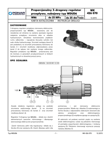 Proporcjonalny 3-drogowy regulator przepływu, nabojowy typ WDUD6 WK 426 070 WN6 do 25 MPa do 25 dm3/min KARTA KATALOGOWA - INSTRUKCJA OBSŁUGI 12.2015 ZASTOSOWANIE 3-drogowy regulator przepływu sterowany elektrycznie, proporcjonalnie typ WDUD6… stosowany jest do niezależnej od ciśnienia na zasilaniu (pompie) regulacji natężenia przepływu strumienia oleju w układzie hydraulicznym. Umożliwia kontrolowanie prędkości ruchu odbiornika – najczęściej tłoczyska cylindra lub wału silnika hydraulicznego. Strumień zasilający (kanał 1) jest podzielony na strumień priorytetowy kierowany do kanału 3 i strumień resztkowy odprowadzany przez kanał 2 do spływu lub zasilania innego odbiornika. Regulator przepływu typ WDUD6… przeznaczony jest do montażu w gniazdach przyłączeniowych w blokach hydraulicznych w dowolnej pozycji pracy. OPIS DZIAŁANIA WDUD6 - 02/20 M1-12 Z4 1 (P) 2 (B) 3 (A) 4 3 1 5 2 Zasada działania regulatora polega na podziale strumienia wejściowego (kanał 1) na strumień priorytetowy kierowany do kanału 3 oraz strumień resztkowy (kanał 2). pomiarową i jest sterowany elektryczne proporcjonalnie. Składa się z dławika (1) wykonanego w formie tłoczka z odpowiednio dobranymi otworami (do zakresu przepływu) oraz elektromagnesu proporcjonalnego (2) współpracującego ze sprężyną (5). Regulator 3-drogowy typ WDUD6… składa się z dwóch elementarnych zaworów: różnicowego i dławiącego (sterowanego elektrycznie proporcjonalnie). W zależności od podanej wartości prądu na zasilanie cewki elektromagnesu ustala się położenie równowagi sił pomiędzy popychaczem elektromagnesu i ściskaną sprężyną (5). Położenie równowagi wyznacza pozycję nastawy dławika (1). Zawór różnicowy pełni rolę regulacyjną i składa się z tłoczka (3) oraz sprężyny (4). Zawór dławiący pełni rolę Typ WDUD6 -1- WK 426 070 12.2015 OPIS DZIAŁANIA Olej hydrauliczny przepływając przez zawór z kanału 1 do 3 wywołuje spadek ciśnienia na dławiku (1), który zależy od nastawy oraz bieżącej wartości przepływu przez dławik (1). Różnica ciśnień przed i za dławikiem (1) oddziałuje na tłoczek (3) i po pokonaniu napięcia wstępnego sprężyny (4) powoduje otwarcie drogi z kanału 1 do kanału 2 umożliwiając przepływ strumienia resztkowego. Jednocześnie tłoczek (3) krawędzią sterującą - od przeciwnej strony - powoduje dławienie przepływającego strumienia oleju do kanału 3. Tłoczek (3) znajdzie się w stanie równowagi w momencie, kiedy spadek ciśnienia na dławiku pomiarowym (1) będzie odpowiadał naciągowi wstępnemu sprężyny (4). Oznacza to, że wielkość strumienia płynącego przez kanał 3 będzie niezależna od ciśnienia na zasilaniu (kanał 1), a zależeć będzie tylko od położenia dławika (1). DANE TECHNICZNE Rodzaj cieczy hydraulicznej Wymagana klasa czystości oleju Lepkość nominalna cieczy hydraulicznej Zakres lepkości cieczy hydraulicznej Zakres temperatury cieczy (w zbiorniku) olej mineralny ISO 4406 klasa 20/18/15 o 37 mm 2 /s w temperaturze 55 C 2,8 do 380 mm2 /s zalecany 40 oC do 55 o C max -20 oC do +70 oC - 20 oC do +50 oC Max ciśnienie pracy 25 MPa Min ciśnienie pracy dla funkcji regulacji przepływu 1,8 MPa Zakres temperatury otoczenia Max przepływ Histereza Max prąd elektromagnesu I max Oporność cewki elektromagnesu w temperaturze 20 C o Regulatory elektroniczne (dostarczane na oddzielne zamówienie) Masa zaworu wartość przepływu wersja zaworu (zakres przepływu) kanał 1 (P) kanał 3 (A) 3 15 dm 3 /min WDUD6.../...15... 40 dm /min 20 dm 3 /min WDUD6.../...20... 40 dm 3 /min WDUD6.../...25... 40 dm3 /min 25 dm 3 /min WDUD6.../...15... 10 % wersja zaworu WDUD6.../... ... 20 8,8 % (zakres przepływu) WDUD6.../...25... 7,5 % 1,5 A 0, 8 A 5,4 Ω 19,5 Ω typ 21RE10 D wg karty _ katalogowej WK 421 810 typ 20RE10 E wg karty katalogowej WK 420 820 typ 20RC10 E wg karty katalogowej WK 427 790 (przy zasilaniu napięciem stabilizowanym 12 do 24V DC ustawić wartość maksymalną prądu I max) 0,8 kg WYMAGANIA MONTAŻU I EKSPLOATACJI 1. Regulator należy użytkować tylko w pełni sprawny. 2. Podczas eksploatacji należy utrzymać zalecaną w niniejszej Karcie Katalogowej - Instrukcji Obsługi lepkość cieczy hydraulicznej. 3. Aby zapewnić bezawaryjną i bezpieczną pracę regulatora należy systematycznie sprawdzać: • stan połączenia elektrycznego • działanie regulatora • czystość cieczy hydraulicznej 4. Ze względu na nagrzewanie się cewki elektromagnesu i korpusu regulatora do wysokiej temperatury regulator powinien być umiejscowiony tak, aby wyeliminować możliwość przypadkowego WK 426 070 12.2015 kontaktu z cewką lub korpusem podczas eksploatacji lub należy przewidzieć odpowiednie osłony zgodnie z wymaganiami norm europejskich: PN - EN ISO 13732 -1 i PN - EN 4413. 5. Dla zapewnienia szczelności przyłącza regulatora do układu hydraulicznego należy przestrzegać wymiarów pierścieni uszczelniających, wartości momentów dokręcenia i parametrów pracy regulatora podanych w niniejszej Karcie Katalogowej - Instrukcji Obsługi. 6. Obsługujący regulator musi być zapoznany z treścią niniejszej Karty Katalogowej - Instrukcji Obsługi. -2- Typ WDUD6 SCHEMATY Symbol graficzny proporcjonalnego regulatora przepływu typ WDUD6... 1 ( P) 3 (A) 2 (B) CHARAKTERYSTYKI o dla lepkości cieczy hydraulicznej v = 41 mm 2 /s i temperatury t = 50 C Charakterystyki zależności przepływu od prądu zasilającego elektromagnes Wykresy charakterystyk zależności przepływu regulowanego Q reg od natężenia prądu I zasilającego elektromagnes dla zaworów typ WDUD6... o różnych zakresach przepływu 30 WDUD6...25... 20 WDUD6...20... 3 Q reg [dm /min] 25 15 WDUD6...15... 10 5 0 0,08 0,15 0,16 0,30 0,24 0,45 Charakterystyki stabilności przepływu 0,32 0,60 0,40 0,75 I [A] 0,48 0,90 0,56 1,05 0,64 1,20 0,72 1,35 0,80 1,50 cewka na I max = 0,8 A cewka na I max = 1,5 A Wykresy charak