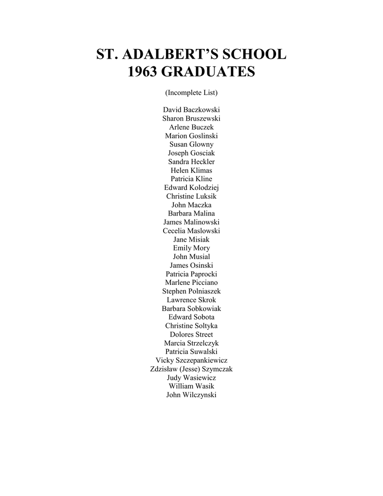 ST. ADALBERT’S SCHOOL 1963 GRADUATES (Incomplete List) David Baczkowski Sharon Bruszewski Arlene Buczek Marion Goslinski Susan Glowny Joseph Gosciak Sandra Heckler Helen Klimas Patricia Kline Edward Kolodziej Christine Luksik John Maczka Barbara Malina James Malinowski Cecelia Maslowski Jane Misiak Emily Mory John Musial James Osinski Patricia Paprocki Marlene Picciano Stephen Polniaszek Lawrence Skrok Barbara Sobkowiak Edward Sobota Christine Soltyka Dolores Street Marcia Strzelczyk Patricia Suwalski Vicky Szczepankiewicz Zdzisław (Jesse) Szymczak Judy Wasiewicz William Wasik John Wilczynski