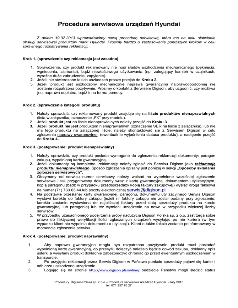 Procedura serwisowa urządzeń Hyundai Z dniem 19.02.2013 wprowadziliśmy nową procedurę serwisową, która ma na celu ułatwienie obsługi serwisowej produktów marki Hyundai. Prosimy bardzo o zastosowanie poniższych kroków w celu sprawnego rozpatrywania reklamacji. Krok 1. (sprawdzenie czy reklamacja jest zasadna) 1. Sprawdzenie, czy produkt reklamowany nie nosi śladów uszkodzenia mechanicznego (pęknięcia, wgniecenia, złamania), bądź niewłaściwego użytkowania (np. zalegający kamień w czajnikach, wyraźne duże zabrudzenie, zapylenie). 2. Jeżeli nie stwierdzono takich uszkodzeń proszę przejść do Kroku 2. 3. Jeżeli produkt jest uszkodzony mechanicznie naprawa gwarancyjna najprawdopodobniej nie zostanie rozpatrzona pozytywnie. Prosimy o kontakt z Serwisem Digison, aby uzgodnić, czy możliwa jest naprawa odpłatna, bądź inna forma pomocy. Krok 2. (sprawdzenie kategorii produktu) 1. Należy sprawdzić, czy reklamowany produkt znajduje się na liście produktów nienaprawialnych (lista w załączniku, oznaczenie „FK” przy modelu). 2. Jeżeli produkt jest na liście nienaprawialnych należy przejść do Kroku 3. 3. Jeżeli produkt nie jest produktem nienaprawialnym (oznaczenie SER na liście z załącznika), lub nie ma tego produktu na załączonej liście, należy skontaktować się z Serwisem Digison w celu zgłoszenia naprawy gwarancyjnej, (ewentualnie wyjaśnienia statusu produktu), a następnie przejść do Kroku 4. Krok 3. (postępowanie: produkt nienaprawialny) 1. Należy sprawdzić, czy produkt posiada wymagane do zgłoszenia reklamacji dokumenty: paragon zakupu, wypełnioną kartę gwarancyjną. 2. Jeżeli dokumenty są kompletne, reklamację należy zgłosić do Serwisu Digison jako reklamację produktu nienaprawialnego. Sposób zgłoszenia opisany jest poniżej w sekcji „Sposoby składania zgłoszeń serwisowych”. 3. Otrzymany od serwisu numer serwisowy należy wpisać na wypełnione wcześniej zgłoszenie serwisowe i tak przygotowany dokumenty wraz z kartą gwarancyjną, dokumentem utylizacyjnym, kopią paragonu (bądź w przypadku przedsprzedaży kopią faktury zakupowej) wysłać drogą faksową na numer (71) 733 63 44 lub poczty elektronicznej [email protected] 4. Na podstawie przesłanej karty gwarancyjnej, paragonu, dokumentu utylizacyjnego Serwis Digison wystawi korektę do faktury zakupu (jeżeli nr faktury zakupu nie został podany przy zgłoszeniu, korekta zostanie wystawiona do najbliższej faktury przed datą sprzedaży produktu na karcie gwarancyjnej lub paragonie) lub też wymieni urządzenie na nowe w przypadku większej liczby serwisów. 5. W przypadku uzasadnionego podejrzenia próby nadużycia Digison Polska sp. z o.o. zastrzega sobie prawo do faktycznej weryfikacji ilości zgłaszanych urządzeń wysyłając po nie kuriera (w tym wypadku klient nie wypełnia dokumentu o utylizacji). Klient o takim fakcie zostanie poinformowany w momencie zgłoszenia serwisu. Krok 4. (postępowanie: produkt naprawialny) 1. 2. 3. Aby naprawa gwarancyjna mogła być rozpatrzona pozytywnie produkt musi posiadać wypełnioną kartę gwarancyjną, do przesyłki dołączyć należało będzie dowód zakupu, dokładny opis usterki a wysyłany produkt dokładnie zabezpieczyć chroniąc go przed ewentualnym uszkodzeniem w transporcie. Po przyjęciu reklamacji przez Serwis Digison w Państwa punkcie sprzedaży pojawi się kurier i odbierze uszkodzone urządzenie. Logując się na stronie http://www.digison.pl/sonline/ będziecie Państwo mogli śledzić status Procedury Digison Polska sp. z o.o.– Procedura serwisowa urządzeń Hyundai – luty 2013 tel. 071 357 70 27 naprawy. Postępowanie w wypadku reklamacji przedsprzedażnych: W przypadku realizacji zgłoszenia reklamacji przedsprzedażnej prosimy o informację, gdzie został zakupiony produkt, jaki jest numer faktury oraz jej przesłanie wraz ze zgłoszeniem reklamacyjnym na adres [email protected] Sposoby składania zgłoszeń serwisowych: a) korzystając z systemu online : http://www.digison.pl/sonline/ b) drogą poczty elektroniczej - w tym wypadku prosimy Państwa o pobranie formularza z adresu http://www.digison.pl/dir_upload/download/thumb/21d1dfc7175359386e9942870df1.pdf oraz dokumentu utylizacyjnego http://www.digison.pl/dir_upload/download/thumb/1f9bda52bab0e66aaef2d1e6fab8.pdf c) drogą telefoniczną / faksową - w tym wypadku prosimy Państwa o pobranie formularza z adresu http://www.digison.pl/dir_upload/download/thumb/21d1dfc7175359386e9942870df1.pdf oraz dokumentu utylizacyjnego http://www.digison.pl/dir_upload/download/thumb/1f9bda52bab0e66aaef2d1e6fab8.pdf i odesłanie go na adres [email protected] lub na nr fax 71 7336344. Mamy nadzieję, że nowa procedura serwisowa pozwoli nam na jeszcze lepszą i szybszą obsługę gwarancyjną produktów Hyundai. Z wyrazami szacunku Serwis Digison Procedury Digison Polska sp. z o.o.– Procedura serwisowa urządzeń Hyundai – luty 2013 tel. 071 357 70 27