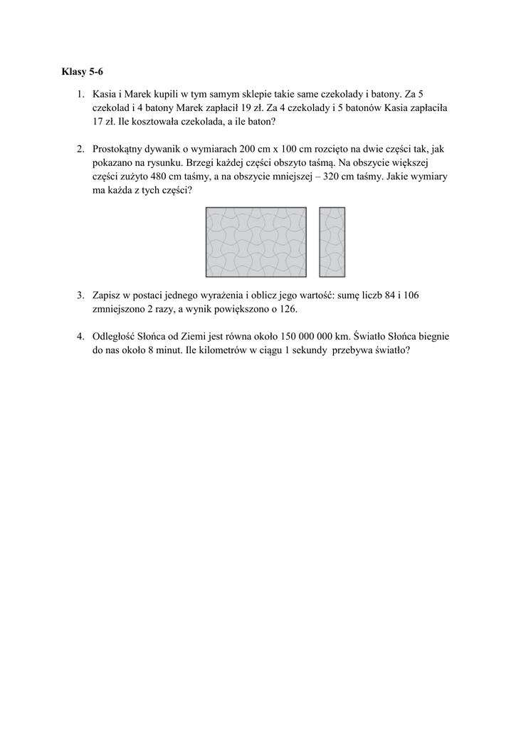 Klasy 5-6 1. Kasia i Marek kupili w tym samym sklepie takie same czekolady i batony. Za 5 czekolad i 4 batony Marek zapłacił 19 zł. Za 4 czekolady i 5 batonów Kasia zapłaciła 17 zł. Ile kosztowała czekolada, a ile baton? 2. Prostokątny dywanik o wymiarach 200 cm x 100 cm rozcięto na dwie części tak, jak pokazano na rysunku. Brzegi każdej części obszyto taśmą. Na obszycie większej części zużyto 480 cm taśmy, a na obszycie mniejszej – 320 cm taśmy. Jakie wymiary ma każda z tych części? 3. Zapisz w postaci jednego wyrażenia i oblicz jego wartość: sumę liczb 84 i 106 zmniejszono 2 razy, a wynik powiększono o 126. 4. Odległość Słońca od Ziemi jest równa około 150 000 000 km. Światło Słońca biegnie do nas około 8 minut. Ile kilometrów w ciągu 1 sekundy przebywa światło?