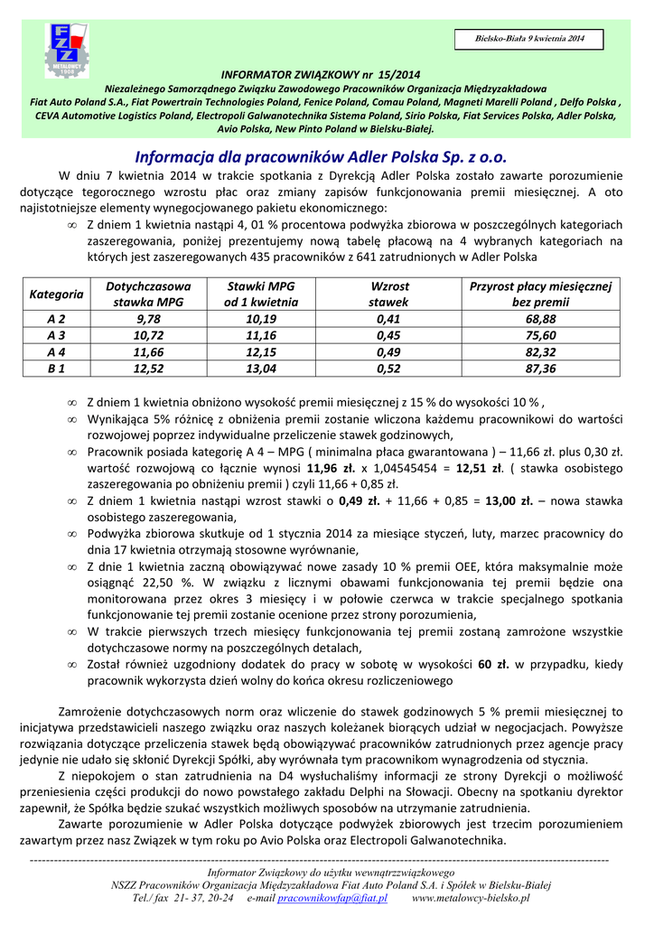 Bielsko-Biała 9 kwietnia 2014 Informator Związkowy 11/2014 -----------------------------------------------------------------------------------------------------------------------------------------------Ć INFORMATOR ZWIĄZKOWY nr 15/2014 Niezależnego Samorządnego Związku Zawodowego Pracowników Organizacja Międzyzakładowa Fiat Auto Poland S.A., Fiat Powertrain Technologies Poland, Fenice Poland, Comau Poland, Magneti Marelli Poland , Delfo Polska , CEVA Automotive Logistics Poland, Electropoli Galwanotechnika Sistema Poland, Sirio Polska, Fiat Services Polska, Adler Polska, Avio Polska, New Pinto Poland w Bielsku-Białej. Informacja dla pracowników Adler Polska Sp. z o.o. W dniu 7 kwietnia 2014 w trakcie spotkania z Dyrekcją Adler Polska zostało zawarte porozumienie dotyczące tegorocznego wzrostu płac oraz zmiany zapisów funkcjonowania premii miesięcznej. A oto najistotniejsze elementy wynegocjowanego pakietu ekonomicznego: • Z dniem 1 kwietnia nastąpi 4, 01 % procentowa podwyżka zbiorowa w poszczególnych kategoriach zaszeregowania, poniżej prezentujemy nową tabelę płacową na 4 wybranych kategoriach na których jest zaszeregowanych 435 pracowników z 641 zatrudnionych w Adler Polska Kategoria A2 A3 A4 B1 • • • • • • • • Dotychczasowa stawka MPG 9,78 10,72 11,66 12,52 Stawki MPG od 1 kwietnia 10,19 11,16 12,15 13,04 Wzrost stawek 0,41 0,45 0,49 0,52 Przyrost płacy miesięcznej bez premii 68,88 75,60 82,32 87,36 Z dniem 1 kwietnia obniżono wysokość premii miesięcznej z 15 % do wysokości 10 % , Wynikająca 5% różnicę z obniżenia premii zostanie wliczona każdemu pracownikowi do wartości rozwojowej poprzez indywidualne przeliczenie stawek godzinowych, Pracownik posiada kategorię A 4 – MPG ( minimalna płaca gwarantowana ) – 11,66 zł. plus 0,30 zł. wartość rozwojową co łącznie wynosi 11,96 zł. x 1,04545454 = 12,51 zł. ( stawka osobistego zaszeregowania po obniżeniu premii ) czyli 11,66 + 0,85 zł. Z dniem 1 kwietnia nastąpi wzrost stawki o 0,49 zł. + 11,66 + 0,85 = 13,00 zł. – nowa stawka osobistego zaszeregowania, Podwyżka zbiorowa skutkuje od 1 stycznia 2014 za miesiące styczeń, luty, marzec pracownicy do dnia 17 kwietnia otrzymają stosowne wyrównanie, Z dnie 1 kwietnia zaczną obowiązywać nowe zasady 10 % premii OEE, która maksymalnie może osiągnąć 22,50 %. W związku z licznymi obawami funkcjonowania tej premii będzie ona monitorowana przez okres 3 miesięcy i w połowie czerwca w trakcie specjalnego spotkania funkcjonowanie tej premii zostanie ocenione przez strony porozumienia, W trakcie pierwszych trzech miesięcy funkcjonowania tej premii zostaną zamrożone wszystkie dotychczasowe normy na poszczególnych detalach, Został również uzgodniony dodatek do pracy w sobotę w wysokości 60 zł. w przypadku, kiedy pracownik wykorzysta dzień wolny do końca okresu rozliczeniowego Zamrożenie dotychczasowych norm oraz wliczenie do stawek godzinowych 5 % premii miesięcznej to inicjatywa przedstawicieli naszego związku oraz naszych koleżanek biorących udział w negocjacjach. Powyższe rozwiązania dotyczące przeliczenia stawek będą obowiązywać pracowników zatrudnionych przez agencje pracy jedynie nie udało się skłonić Dyrekcji Spółki, aby wyrównała tym pracownikom wynagrodzenia od stycznia. Z niepokojem o stan zatrudnienia na D4 wysłuchaliśmy informacji ze strony Dyrekcji o możliwość przeniesienia części produkcji do nowo powstałego zakładu Delphi na Słowacji. Obecny na spotkaniu dyrektor zapewnił, że Spółka będzie szukać wszystkich możliwych sposobów na utrzymanie zatrudnienia. Zawarte porozumienie w Adler Polska dotyczące podwyżek zbiorowych jest trzecim porozumieniem zawartym przez nasz Związek w tym roku po Avio Polska oraz Electropoli Galwanotechnika. -----------------------------------------------------------------------------------------------------------------------------------------------Informator Związkowy do użytku wewnątrzzwiązkowego NSZZ Pracowników Organizacja Międzyzakładowa Fiat Auto Poland S.A. i Spółek w Bielsku-Białej Tel./ fax 21- 37, 20-24 e-mail [email protected] www.metalowcy-bielsko.pl