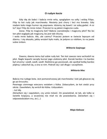 O rudym kocie Gdy idę do babci i babcia mnie wita, spoglądam na sofę i widzę Filipa. Filip to kot rudy jak marchewka. Niestety jest chory i leci mu krewka. Gdy siadam koło niego humor się poprawia. Idziemy się bawić i ze sobą gadać. A co to? Jeju! Filip do mnie mówi. Przecież to są jakieś magiczne cuda. Zaraz. Filip to magiczny kot? Babcia czarodziejka i magiczny płot? No bo ten płot wygląda jak magiczny, bo jest taki śliczny. I woła mnie babcia. Ale, ale czemu? Przecież jestem w świecie lepszym od dżemu. I się okazało, jakby wrażeń było mało, że jedyne co robiłam, to na jawie sobie śniłam. Wiktoria Szajnoga Dawno, dawno temu był sobie rudy kot. Ten kot zawsze rano wchodził na płot. Nagle koparki zaczęły burzyć jego ulubiony płot. Kociak bardzo i to bardzo był smutny i szedł, szedł, szedł. Niektórzy go pocieszali, ale spotkał kotkę bardzo piękną i zakochał się, a ona w nim. Pobrali się i żyli długo i szczęśliwie. Wiktoria Mac Babcia ma rudego kota. Jest pomarańczowy jak marchewka i lubi jak głaszcze się go po brzuszku. Pewnego ciemnego wieczoru wstałam z łóżka. Zobaczyłam, że kot siedzi przy oknie. Zawołałam, by wrócił do łóżka. Usłyszałam: - Już idę. Zdziwiłam się i zapytałam, czy umie mówić. On powiedział, że tak, ale tylko w świetle księżyca, a wcześniej nie miał nic do powiedzenia. Zdziwiłam się i odpowiedziałam mu, że (…) Maja Kałosza Mój dom Mój dom dużo ciepła daje, odpoczynku na kanapie, Rysunki ładne na zielonej ścianie I choinkę przecudną na obrazie. Fajny nasz dom jest, Więc nie uciekaj tylko siedź. Kawę razem z rodzicami wypij oraz jabłecznik zjedz. Weronika Filuś Mój dom to moje życie. Tam jem i piję. To miejsce spotkań z rodziną. Tam się wszystko zaczyna. Tam mieszka moja rodzina. Tam już przeżyłem tyle świąt i tyle chwil. Michał Szatkowski Mój dom Mój dom to ciepłe miejsce na ziemi I miejsce do zabaw. To takie miejsce, w którym nigdy Nie będziesz sam. Z szafą można wesoło pogadać I z biurkiem pogawędzisz. A z ołówkiem pogadasz jak się w szkole pisało. I to tak fajnie jest w domu. Karolina Wodyk Mój dom to ja i moja rodzina. Każdy ma swe sprawy, zajęcia, szkołę. Ten budynek to moje życie, szczęście. Tu jestem od małego. Gdy wszyscy usiądziemy do stołu kolacyjnego, Żartujemy, opowiadamy jak było w szkole, a rodzice w pracy. Dominika Michalak Mój dom Mój dom to ja i moja rodzina. Spędzamy ze sobą dużo czasu. Chodzimy na spacery, bawimy się w berka. Nigdy nie byliśmy smutni, ale zawsze uśmiechnięci.. Wieczorem spotykamy się przy stole, Jemy kolację, popijamy herbatę. Wronika Kossowicz