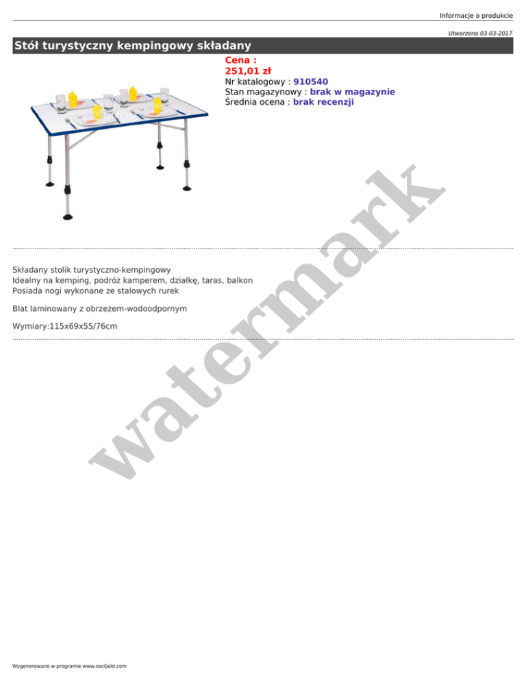 Informacje o produkcie Utworzono 03-03-2017 Stół turystyczny kempingowy składany Cena : 251,01 zł er m ar k Nr katalogowy : 910540 Stan magazynowy : brak w magazynie Średnia ocena : brak recenzji Składany stolik turystyczno-kempingowy Idealny na kemping, podróż kamperem, działkę, taras, balkon Posiada nogi wykonane ze stalowych rurek Blat laminowany z obrzeżem-wodoodpornym w at Wymiary:115x69x55/76cm Wygenerowano w programie www.oscGold.com