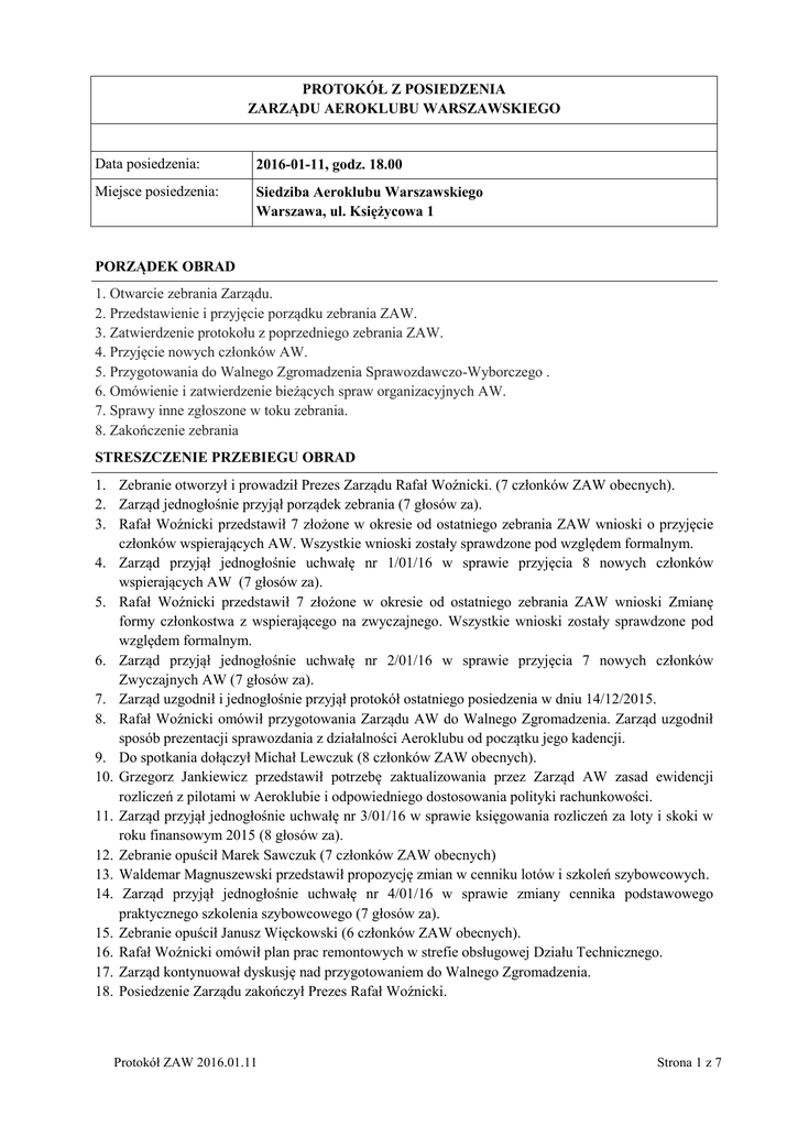 PROTOKÓŁ Z POSIEDZENIA ZARZĄDU AEROKLUBU WARSZAWSKIEGO Data posiedzenia: 2016-01-11, godz. 18.00 Miejsce posiedzenia: Siedziba Aeroklubu Warszawskiego Warszawa, ul. Księżycowa 1 PORZĄDEK OBRAD 1. Otwarcie zebrania Zarządu. 2. Przedstawienie i przyjęcie porządku zebrania ZAW. 3. Zatwierdzenie protokołu z poprzedniego zebrania ZAW. 4. Przyjęcie nowych członków AW. 5. Przygotowania do Walnego Zgromadzenia Sprawozdawczo-Wyborczego . 6. Omówienie i zatwierdzenie bieżących spraw organizacyjnych AW. 7. Sprawy inne zgłoszone w toku zebrania. 8. Zakończenie zebrania STRESZCZENIE PRZEBIEGU OBRAD 1. Zebranie otworzył i prowadził Prezes Zarządu Rafał Woźnicki. (7 członków ZAW obecnych). 2. Zarząd jednogłośnie przyjął porządek zebrania (7 głosów za). 3. Rafał Woźnicki przedstawił 7 złożone w okresie od ostatniego zebrania ZAW wnioski o przyjęcie członków wspierających AW. Wszystkie wnioski zostały sprawdzone pod względem formalnym. 4. Zarząd przyjął jednogłośnie uchwałę nr 1/01/16 w sprawie przyjęcia 8 nowych członków wspierających AW (7 głosów za). 5. Rafał Woźnicki przedstawił 7 złożone w okresie od ostatniego zebrania ZAW wnioski Zmianę formy członkostwa z wspierającego na zwyczajnego. Wszystkie wnioski zostały sprawdzone pod względem formalnym. 6. Zarząd przyjął jednogłośnie uchwałę nr 2/01/16 w sprawie przyjęcia 7 nowych członków Zwyczajnych AW (7 głosów za). 7. Zarząd uzgodnił i jednogłośnie przyjął protokół ostatniego posiedzenia w dniu 14/12/2015. 8. Rafał Woźnicki omówił przygotowania Zarządu AW do Walnego Zgromadzenia. Zarząd uzgodnił sposób prezentacji sprawozdania z działalności Aeroklubu od początku jego kadencji. 9. Do spotkania dołączył Michał Lewczuk (8 członków ZAW obecnych). 10. Grzegorz Jankiewicz przedstawił potrzebę zaktualizowania przez Zarząd AW zasad ewidencji rozliczeń z pilotami w Aeroklubie i odpowiedniego dostosowania polityki rachunkowości. 11. Zarząd przyjął jednogłośnie uchwałę nr 3/01/16 w sprawie księgowania rozliczeń za loty i skoki w roku finansowym 2015 (8 głosów za). 12. Zebranie opuścił Marek Sawczuk (7 członków ZAW obecnych) 13. Waldemar Magnuszewski przedstawił propozycję zmian w cenniku lotów i szkoleń szybowcowych. 14. Zarząd przyjął jednogłośnie uchwałę nr 4/01/16 w sprawie zmiany cennika podstawowego praktycznego szkolenia szybowcowego (7 głosów za). 15. Zebranie opuścił Janusz Więckowski (6 członków ZAW obecnych). 16. Rafał Woźnicki omówił plan prac remontowych w strefie obsługowej Działu Technicznego. 17. Zarząd kontynuował dyskusję nad przygotowaniem do Walnego Zgromadzenia. 18. Posiedzenie Zarządu zakończył Prezes Rafał Woźnicki. Protokół ZAW 2016.01.11 Strona 1 z 7 Nr uchwały Tytuł uchwały Załącznik nr 1/01/15 Uchwała w sprawie przyjęcia nowych Członków Wspierających AW 1 2/01/15 Uchwała w sprawie przyjęcia nowych Członków Zwyczajnych AW 2 3/01/15 Uchwała w sprawie księgowania rozliczeń za loty i skoki w roku finansowym 2015 3 4/01/15 Uchwała w sprawie zmiany cennika podstawowego praktycznego szkolenia szybowcowego 4 W załączeniu: Zał. nr 1 ................................................................................ Uchwała nr 1/01/16 Zał. nr 2 ................................................................................ Uchwała nr 2/01/16 Zał. nr 3 ................................................................................ Uchwała nr 3/01/16 Zał. nr 4 ................................................................................ Uchwała nr 4/01/16 Zał. nr 5 ................................................................................ Lista obecności Warszawa: dnia 11 stycznia 2016 r. Piotr Maciejewski Rafał Woźnicki Sekretarz Zarządu Aeroklubu Warszawskiego Prezes Zarządu Aeroklubu Warszawskiego Protokół ZAW 2016.01.11 Strona 2 z 7 UCHWAŁA ZARZĄDU AEROKLUBU WARSZAWSKIEGO Nr: 1/01/16 z dnia: 11 stycznia 2016 W sprawie: przyjęcia nowych członków wspierających AW Na podstawie §7 ust. 1 Statutu Zarząd Aeroklubu Warszawskiego przyjmuje się w poczet członków wspierających następujące osoby: Lp. 1. 2. 3. 4. 5. 6. 7. 8. Nazwisko i Imię Unrug Krzysztof Parzyszek Dariusz Łaniecki Nikodem Kompowski Adam Konieczek Irmina Majcher Robert Nowakowski Mariusz Krawcewicz Krzysztof Sekcja podstawowa Samolotowa Samolotowa Samolotowa Samolotowa Samolotowa Samolotowa Samolotowa Samolotowa Uchwała wchodzi w życie z dniem podjęcia. Warszawa: dnia 11 stycznia 2016 r. Piotr Maciejewski Rafał Woźnicki Sekretarz Zarządu Aeroklubu Warszawskiego Prezes Zarządu Aeroklubu Warszawskiego Protokół ZAW 2016.01.11 Strona 3 z 7 UCHWAŁA ZARZĄDU AEROKLUBU WARSZAWSKIEGO Nr: 2/01/16 z dnia: 11 stycznia 2016 W sprawie: przyjęcia owych członków zwyczajnych AW Na podstawie §7 ust. 1 Statutu Zarząd Aeroklubu Warszawskiego zmienia status członka wspierającego na członka zwyczajnego następującym osobom: Lp. 1. 2. 3. 4. 5. 6. 7. Nazwisko i Imię Sokalski Arkadiusz Rowicki Artur Artych (Szymańska) Katarzyna Artych Wojciech Naumiuk Maciej Domżała Małgorzata Kołodziejczyk Martyna Sekcja podstawowa Szybowcowa Szybowcowa Spadochronowa Spadochronowa Spadochronowa Spadochronowa Spadochronowa Uchwała wchodzi w życie z dniem podjęcia. Warszawa: dnia 11 stycznia 2016 r. Piotr Maciejewski Rafał Woźnicki Sekretarz Zarządu Aeroklubu Warszawskiego Prezes Zarządu Aeroklubu Warszawskiego Protokół ZAW 2016.01.11 Strona 4 z 7 UCHWAŁA ZARZĄDU AEROKLUBU WARSZAWSKIEGO Nr: 3/01/16 z dnia: 11 stycznia 2016 roku W sprawie: księgowania rozliczeń za loty i skoki w roku finansowym 2015. Porządkowanie ewidencji kontrahentów 1. Zarząd AW zobowiązuje Dyrektora AW do uporządkowania ewidencji kontrahentów w pomocniczych systemach informatycznych do rozliczeń lotów i skoków spadochronowych zgodnie z poniższymi postanowieniami. 2. Za kontrahenta aktywnego uznaje