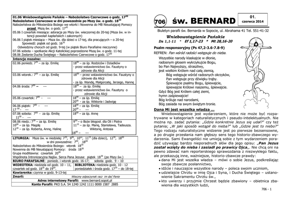 01.06 Wniebowstąpienie Pańskie – Nabożeństwo Czerwcowe o godz. 1730 Nabożeństwo Czerwcowe w dni powszednie po Mszy św. o godz. 1830 Nabożeństwa do Miłosierdzia Bożego we wtorki i Nowenna do MB Nieustającej Pomocy przed Mszą św. o godz. 1745 05.06 I czwartek miesiąca: adoracja po Mszy św. wieczornej do 20-tej (Msza św. w intencji powołań kapłańskich i zakonnych) 06.06 I piątek miesiąca – Msza św. dla dzieci o 17-tej, dla pracujących – o 20-tej Spowiedź: piątek od godz. 1630 Odwiedziny chorych od godz. 9-tej (w piątek Biuro Parafialne nieczynne) 07.06 sobota – spotkanie Akcji Katolickiej poprzedzone Mszą św. o godz. 11-tej 08.06 Zesłanie Ducha Świętego – Nabożeństwo Czerwcowe o godz. 1730 Intencje mszalne: 02.06 poniedz. 730 – za śp. Emilię 1800 – za śp. Rodziców i Dziadków - przez wstawiennictwo św. Faustyny o zdrowie dla Alicji 03.06 wtorek.: 700 – za śp. Emilię 1800 – przez wstawiennictwo św. Faustyny o zdrowie dla Alicji - za śp. Wandę, Małgorzatę, Jerzego, Hannę 04.06 środa: 700 – --1800 – za śp. Emilię - przez wstawiennictwo św. Faustyny o zdrowie dla Alicji 05.06 czwartek: 700 --1800 – za śp. Emilię 2000 - za śp. Wiktorie i Jadwigę 00 06.06 piątek: 7 --1800 – za śp. Emilię 00 17 - --2000 --00 07.06 sobota: 7 - za śp. Emilię 1800 – za śp. Annę 1100 - --08.06 niedz.: 730 – za śp. Emilię 900 – o Boże błogosł. dla Oli i Piotra 00 10 – za śp. Magdę 1115 – za śp. Marię, Stanisława, Tadeusza. 30 12 – za śp. Roberta, Annę, Halinę Wiktorię, Antosia 1800 – --LITURGIA: Msze św. w niedzielę: 730, 900, 10oo, 1115 (dla dzieci), 1230, 1800 w dni powszednie: 700, 1800 Nabożeństwo do Miłosierdzia Bożego: wtorek 1830 Nowenna do MB Nieustającej Pomocy: środa 1830 Grupa modlitewna: czwartek 2000 Wspólnota Intronizacyjna Najśw. Serca Pana Jezusa: piątek 18 30 (po Mszy św.) BIURO PARAFIALNE: poniedz. i wtorek godz. 16-17; sobota godz. 9 – 10 WIDEOTEKA: niedziela od godz. 10 – 11, BIBLIOTEKA: niedziela godz. 10 - 12 czwartek od godz. 1830 do 1900. poniedziałek i środa godz. 1730 – do 18-tej Kawiarenka: czynna w godz. 9-13-tej Zmarli: Wieczny odpoczynek racz im dać Panie Adres internetowy Parafii: www.bernard.sopot.pl Konto Parafii: PKO S.A. 54 1240 1242 1111 0000 1587 2885 706 św. BERNARD 01. czerwca 2014 Biuletyn parafii św. Bernarda w Sopocie, ul. Abrahama 41 Tel. 551-41-32 Wniebowstąpienie Pańskie Dz 1,1-11 * Ef 1,17-23 * Mt 28,16-20 Psalm responsoryjny (Ps 47,2-3.6-7.8-9) REFREN: Pan wśród radości wstępuje do nieba. Wszystkie narody klaskajcie w dłonie, radosnym głosem wykrzykujcie Bogu, bo Pan Najwyższy, straszliwy, jest wielkim Królem nad całą ziemią. Bóg wstępuje wśród radosnych okrzyków, Pan wstępuje przy dźwięku trąby. Śpiewajcie psalmy Bogu, śpiewajcie, śpiewajcie Królowi naszemu, śpiewajcie. Gdyż Bóg jest Królem całej ziemi, hymn zaśpiewajcie! Bóg króluje nad narodami, Bóg zasiada na swym świętym tronie. Dana Mi jest wszelka władza … Wniebowstąpienie jest wydarzeniem, które nie może być rozpatrywane w kategoriach naturalistycznych i pseudo-intelektualnych. Nie można np. zadać pytania: „Gdzie konkretnie Jezus się udał?” czy też pytania; „W jaki sposób wstąpił do nieba?” lub „Gdzie jest to niebo?” Tego rodzaju naturalistyczne widzenie jest po pierwsze bezsensowne, a po drugie przesłania nam głębszy sens tego historio-zbawczego wydarzenia. Sami Ewangeliści nie umieją sobie z tym wydarzeniem poradzić używając bardzo nieporadnych słów dla jego opisu: „Pan Jezus został wzięty do nieba i zasiadł po prawicy Ojca„. Nie chcą oni na pewno zdawać nam reporterskiego sprawozdania z niezwykłego faktu, ale przekazują inne, ważniejsze, historio-zbawcze prawdy: dana Mi jest wszelka władza – mówi o sobie Jezus, podkreślając swoje zbawcze posłannictwo, idźcie i nauczajcie wszystkie narody – poleca swoim uczniom, udzielajcie Chrztu w imię Ojca i Syna, i Ducha Świętego – ustanowienie Sakramentu Chrztu św., kto uwierzy i przyjmie Chrzest będzie zbawiony – obietnica zbawienia dla wszystkich ludzi, 706 - 1 http://kazania.wordpress.com Myśl na każdy dzień DATA Patron dnia 02.06 pn św. męczenników Marcelina i Piotra Na świecie doznacie ucisku, ale miejcie odwagę: Jam zwyciężył świat. J 16.33 03.06 wt św. męczenników Karola Lwangi i Towarzyszy Ja za nimi proszę, nie proszę za światem, ale za tymi, których Mi dałeś, ponieważ są Twoimi. J 17,9 04.06 śr Jak Ty Mnie posłałeś na świat, tak i Ja ich na świat posłałem. J 17,18 05.06 cz św. Bonifacego, biskupa i męczennika Zachowaj mnie, Boże, bo chronię się u Ciebie, mówię do Pana: „Tyś jest Panem moim”. Ps 16,1 06.06 pt św. Norberta, biskupa Duch Święty wszystkiego was nauczy, przypomni wam wszystko, co wam powiedziałem. J 14,26 07.06 so Pan w świętym swoim przybytku, na niebiosach tron Pana. Ps 11,4 Modlitwa codziennego ofiarowania Boże, nasz Ojcze, ofiaruję Ci dzień dzisiejszy: moje modlitwy, myśli, słowa, czyny i cierpienia. Ofiaruję Ci je w łączności z Synem Twoim, Jezusem Chrystusem, który w Eucharystii nieustannie składa się Tobie w ofierze dla zbawienia świata. Niech Duch Święty, który prowadził Jezusa, będzie dzisiaj moim przewodnikiem i moją siłą, bym mógł świadczyć o Twojej miłości. Wraz z Maryją, Matką Jezusa i Kościoła, proszę Cię szczególnie w tych intencjach, które Ojciec Święty poleca wszystkim wierzącym na ten miesiąc. CZERWIEC Duch Święty zstąpi na was – obietnica zesłania i obecności Ducha Świętego, będziecie dokonywać rzeczy niezwykłych - z wiary wypływających, uczcie zachowywać moje przykazania - wiara musi być potwierdzona życiem, wy jesteście moimi świadkami - świadkami zbawczego posłannictwa Jezusa, Jezus został wzięty do nieba – tam skąd przybył, ale ni pytajmy o lokalizację, zasiadł po prawicy Ojc