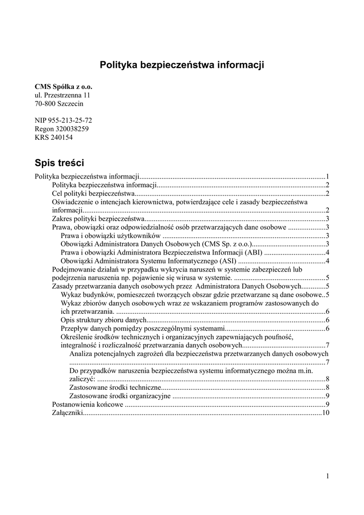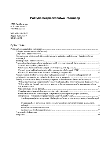 Polityka bezpieczeństwa informacji CMS Spółka z o.o. ul. Przestrzenna 11 70-800 Szczecin NIP 955-213-25-72 Regon 320038259 KRS 240154 Spis treści Polityka bezpieczeństwa informacji.....................................................................................................1 Polityka bezpieczeństwa informacji............................................................................................2 Cel polityki bezpieczeństwa........................................................................................................2 Oświadczenie o intencjach kierownictwa, potwierdzające cele i zasady bezpieczeństwa informacji....................................................................................................................................2 Zakres polityki bezpieczeństwa..................................................................................................3 Prawa, obowiązki oraz odpowiedzialność osób przetwarzających dane osobowe ....................3 Prawa i obowiązki użytkowników ........................................................................................3 Obowiązki Administratora Danych Osobowych (CMS Sp. z o.o.)........................................3 Prawa i obowiązki Administratora Bezpieczeństwa Informacji (ABI) .................................4 Obowiązki Administratora Systemu Informatycznego (ASI) ...............................................4 Podejmowanie działań w przypadku wykrycia naruszeń w systemie zabezpieczeń lub podejrzenia naruszenia np. pojawienie się wirusa w systemie. .................................................5 Zasady przetwarzania danych osobowych przez Administratora Danych Osobowych.............5 Wykaz budynków, pomieszczeń tworzących obszar gdzie przetwarzane są dane osobowe..5 Wykaz zbiorów danych osobowych wraz ze wskazaniem programów zastosowanych do ich przetwarzania. ..................................................................................................................6 Opis struktury zbioru danych.................................................................................................6 Przepływ danych pomiędzy poszczególnymi systemami......................................................6 Określenie środków technicznych i organizacyjnych zapewniających poufność, integralność i rozliczalność przetwarzania danych osobowych.............................................7 Analiza potencjalnych zagrożeń dla bezpieczeństwa przetwarzanych danych osobowych ...........................................................................................................................................7 Do przypadków naruszenia bezpieczeństwa systemu informatycznego można m.in. zaliczyć: ............................................................................................................................8 Zastosowane środki techniczne.........................................................................................8 Zastosowane środki organizacyjne ...................................................................................9 Postanowienia końcowe .............................................................................................................9 Załączniki..................................................................................................................................10 1 Polityka bezpieczeństwa informacji. Polityka bezpieczeństwa informacji jest zbiorem spójnych, precyzyjnych reguł i procedur, według których dana organizacja buduje, zarządza oraz udostępnia zasoby i systemy informacyjne i informatyczne. Cel polityki bezpieczeństwa. Niniejsza Polityka została opracowana dla stworzenia i utrzymania wysokiego poziomu bezpieczeństwa zbioru danych osobowych zgodnie z wymogami rozporządzenia, rozumianego jako zapewnienie poufności, integralności i dostępności zasobów oraz zapewnienia rozliczalności podejmowanych działań. Celem opracowania i wdrożenia niniejszej Polityki jest: • maksymalne ograniczenie ryzyka związanego z nieuprawnionym przetwarzaniem lub utratą danych osobowych, • zagwarantowanie pełnej ochrony danych osobowych posiadanych przez CMS Sp. z o.o. zbiorów bez względu na formę w jakiej zbiór jest przetwarzany, • opracowanie zasad postępowania w sytuacjach kryzysowych, • wdrożenie reguł, praw i procedur zapewniających odpowiedni poziom bezpieczeństwa zarządzania danymi osobowymi będącymi w posiadaniu CMS Sp z o.o. Cele wyznaczone w Polityce Bezpieczeństwa, realizowane są poprzez: • stałe doskonalenie oraz rozwijanie organizacyjnych i technicznych środków ochrony danych osobowych przetwarzanych zarówno w formie tradycyjnej jak i elektronicznej, • podejmowanie wszelkich działań niezbędnych dla ochrony praw jednostki związanych z bezpieczeństwem danych osobowych, • staranny dobór, ocenę i kwalifikację dostawców usług, • stosowanie odpowiednich urządzeń i oprogramowania wykorzystywanych do przetwarzania i zabezpieczania danych osobowych. Oświadczenie o intencjach kierownictwa, potwierdzające cele i zasady bezpieczeństwa informacji. CMS Sp. z o.o. realizując niniejszą Politykę Bezpieczeństwa, dokłada najwyższej staranności w celu ochrony interesów osób, których dane dotyczą, a w szczególności zapewnia, aby dane te były: • przetwarzane zgodnie z prawem, • zbierane dla oznaczonych, zgodnych z prawem celów i nie poddawane dalszemu przetwarzaniu niezgodnemu z tymi celami, • merytorycznie poprawne i adekwatne w stosunku do celów, w jakich są przetwarzane, • przechowywane nie dłużej niż jest to niezbędne do realizacji celów, w których zostały zebrane. 2 Zakres polityki bezpieczeństwa Polityka Bezpieczeństwa odnosi się do wszystkich danych osobowych przetwarzanych: • w sposób tradycyjny, w szczególności w kartotekach, rejestrach, skorowidzach, księgach, wykazach i w innych zbiorach ewidencyjny