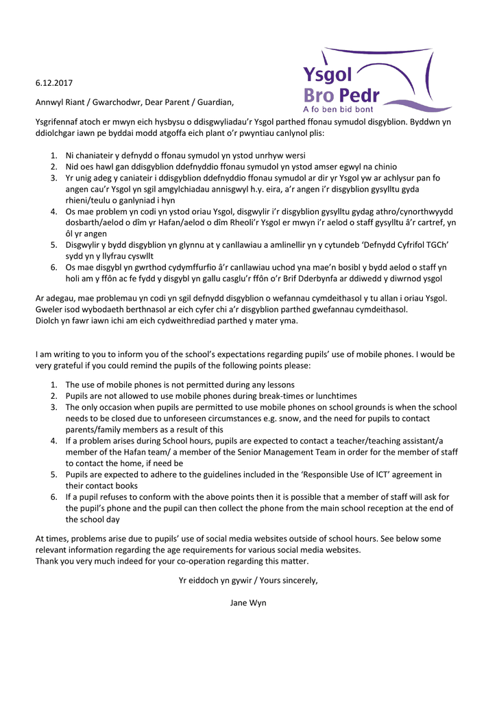 6.12.2017 Annwyl Riant / Gwarchodwr, Dear Parent / Guardian, Ysgrifennaf atoch er mwyn eich hysbysu o ddisgwyliadau’r Ysgol parthed ffonau symudol disgyblion. Byddwn yn ddiolchgar iawn pe byddai modd atgoffa eich plant o’r pwyntiau canlynol plis: 1. Ni chaniateir y defnydd o ffonau symudol yn ystod unrhyw wersi 2. Nid oes hawl gan ddisgyblion ddefnyddio ffonau symudol yn ystod amser egwyl na chinio 3. Yr unig adeg y caniateir i ddisgyblion ddefnyddio ffonau symudol ar dir yr Ysgol yw ar achlysur pan fo angen cau’r Ysgol yn sgil amgylchiadau annisgwyl h.y. eira, a’r angen i’r disgyblion gysylltu gyda rhieni/teulu o ganlyniad i hyn 4. Os mae problem yn codi yn ystod oriau Ysgol, disgwylir i’r disgyblion gysylltu gydag athro/cynorthwyydd dosbarth/aelod o dîm yr Hafan/aelod o dîm Rheoli’r Ysgol er mwyn i’r aelod o staff gysylltu â’r cartref, yn ôl yr angen 5. Disgwylir y bydd disgyblion yn glynnu at y canllawiau a amlinellir yn y cytundeb ‘Defnydd Cyfrifol TGCh’ sydd yn y llyfrau cyswllt 6. Os mae disgybl yn gwrthod cydymffurfio â’r canllawiau uchod yna mae’n bosibl y bydd aelod o staff yn holi am y ffôn ac fe fydd y disgybl yn gallu casglu’r ffôn o’r Brif Dderbynfa ar ddiwedd y diwrnod ysgol Ar adegau, mae problemau yn codi yn sgil defnydd disgyblion o wefannau cymdeithasol y tu allan i oriau Ysgol. Gweler isod wybodaeth berthnasol ar eich cyfer chi a’r disgyblion parthed gwefannau cymdeithasol. Diolch yn fawr iawn ichi am eich cydweithrediad parthed y mater yma. I am writing to you to inform you of the school’s expectations regarding pupils’ use of mobile phones. I would be very grateful if you could remind the pupils of the following points please: 1. The use of mobile phones is not permitted during any lessons 2. Pupils are not allowed to use mobile phones during break-times or lunchtimes 3. The only occasion when pupils are permitted to use mobile phones on school grounds is when the school needs to be closed due to unforeseen circumstances e.g. snow, and the need for pupils to contact parents/family members as a result of this 4. If a problem arises during School hours, pupils are expected to contact a teacher/teaching assistant/a member of the Hafan team/ a member of the Senior Management Team in order for the member of staff to contact the home, if need be 5. Pupils are expected to adhere to the guidelines included in the ‘Responsible Use of ICT’ agreement in their contact books 6. If a pupil refuses to conform with the above points then it is possible that a member of staff will ask for the pupil’s phone and the pupil can then collect the phone from the main school reception at the end of the school day At times, problems arise due to pupils’ use of social media websites outside of school hours. See below some relevant information regarding the age requirements for various social media websites. Thank you very much indeed for your co-operation regarding this matter. Yr eiddoch yn gywir / Yours sincerely, Jane Wyn 6 Lutego, 2017 Drodzy rodzice/Opiekunowie, Piszę do państwa, aby poinformować was o zasadach szkolnych dotyczących używania przez uczniów telefonów komórkowych. Byłabym bardzo wdzięczna, gdyby mógł Pan/Pani przypomnieć uczniom o następujących zasadach: 1. Korzystanie z telefonów komórkowych jest niedozwolone podczas wszelkich zajęć 2. Uczniowie nie mogą korzystać z telefonów komórkowych podczas przerwy śniadaniowej lub w porze obiadowej 3. Jedyna okazja, kiedy uczniowie mogą korzystać z telefonów komórkowych na terenie szkoły, jest, gdy szkoła musi zostać zamknięta z powodu nieprzewidzianych okoliczności, na przykład śnieg, a uczeń musi skontaktować się z rodzicami / członkiem rodziny. 4. W razie wystąpienia problemu podczas zajęć szkolnych, jeśli zajdzie taka potrzeba oczekujemy, że uczniowie skontaktują się z asystentem nauczyciela / nauczycielem / członkiem zespołu Hafan / pracownikiem zespołu zarządzającego, po to, aby skontaktować się z rodziną. 5. Uczniowie zobowiązani są przestrzegać zasad zawartych w ‘Responsible Use of ICT’ które znajdują się w dziennikach ucznia. 6. Jeżeli uczeń nie dostosuje się do powyższych punktów, to jest możliwe, że pracownicy szkoły będą prosić o telefon ucznia, i dopiero na koniec dnia uczeń będzie mógł odebrać telefon z głównej recepcji szkoły. Czasami pojawiają się problemy z powodu używania przez uczniów serwisów społecznościowych poza godzinami lekcyjnymi. Poniżej przedstawione zostały istotne informacje dotyczących wymagań wiekowych dla różnych serwisów społecznościowych. Dziękuję bardzo za współpracę w tej sprawie.Z poważaniem, Jane Wyn (Dyrektor)