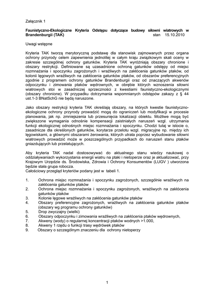 Załącznik 1 Faunistyczno-Ekologiczne Kryteria Odstępu dotyczące budowy siłowni wiatrowych w Brandenburgii (TAK) stan 15.10.2010 Uwagi wstępne Kryteria TAK tworzą merytoryczną podstawę dla stanowisk zajmowanych przez organa ochrony przyrody celem zapewnienia jednolitej w całym kraju związkowym skali oceny w zakresie szczególnej ochrony gatunków. Kryteria TAK wyróżniają obszary chronione i obszary restrykcji. Definiowane są uzasadnione ochroną gatunków odstępy od miejsc rozmnażania i spoczynku zagrożonych i wrażliwych na zakłócenia gatunków ptaków, od kolonii lęgowych wrażliwych na zakłócenia gatunków ptaków, od obszarów preferencyjnych zgodnie z programem ochrony gatunków Brandenburgii oraz od znaczących akwenów odpoczynku i zimowania ptaków wędrownych, w obrębie których wznoszenia siłowni wiatrowych stoi w zasadniczej sprzeczności z kwestiami faunistyczno-ekologicznymi (obszary chronione). W przypadku dotrzymania wspomnianych odstępów zakazy z § 44 ust.1-3 BNatSchG nie będą naruszone. Jako obszary restrykcji kryteria TAK określają obszary, na których kwestie faunistycznoekologiczne ochrony przyrody prowadzić mogą do ograniczeń lub modyfikacji w procesie planowania, jak np. zmniejszenia lub przesunięcia lokalizacji obiektu. Możliwe mogą być zwiększone wymagania odnośnie kompensacji zaistniałych naruszeń wzgl. utrzymania funkcji ekologicznej odnośnych miejsc rozmnażania i spoczynku. Chodzi tutaj w istocie o, zasadnicze dla określonych gatunków, korytarze przelotu wzgl. migracyjne np. między ich lęgowiskami, a głównymi obszarami żerowania, których utrata poprzez wybudowanie siłowni wiatrowych prowadzić może w poszczególnych przypadkach do naruszeń stanu ptaków gniazdujących lub przelatujących. Aby kryteria TAK nadal dostosowywać do aktualnego stanu wiedzy naukowej o oddziaływaniach wykorzystania energii wiatru na ptaki i nietoperze oraz je aktualizować, przy Krajowym Urzędzie ds. Środowiska, Zdrowia i Ochrony Konsumentów (LUGV ) utworzona będzie stała grupa robocza. Całościowy przegląd kryteriów podany jest w tabeli 1. 1. 2. 3. 4. 5. 6. 7. 8. 9. Ochrona miejsc rozmnażania i spoczynku zagrożonych, szczególnie wrażliwych na zakłócenia gatunków ptaków Ochrona miejsc rozmnażania i spoczynku zagrożonych, wrażliwych na zakłócenia gatunków ptaków Kolonie lęgowe wrażliwych na zakłócenia gatunków ptaków Obszary preferencyjne zagrożonych, wrażliwych na zakłócenia gatunków ptaków (obszary wg programu ochrony gatunków) Drop zwyczajny (wielki) Obszary odpoczynku i zimowania wrażliwych na zakłócenia ptaków wędrownych, Akweny (wody) o regularnej koncentracji ptaków wodnych >1.000, Akweny 1 rzędu o funkcji trasy wędrówek ptaków Obszary o szczególnym znaczeniu dla ochrony nietoperzy 1 1. Ochrona miejsc rozmnażania i spoczynku zagrożonych, szczególnie wrażliwych na zakłócenia gatunków ptaków W przypadku niżej podanych podlegających ścisłej ochronie gatunków ptaków należy liczyć się ze znaczącymi naruszeniami ich miejsc rozmnażania i spoczynku przez siłownie wiatrowe, jeżeli są one budowane i uruchamiane w obrębie ich rewiru lęgowego. Czynnikami wyzwalającymi mogą być tutaj z jednej strony bezpośrednie, powodowane przez obracające się obiekty bodźce zakłócające, z drugiej strony istotną rolę odgrywa optymalna dostępność i rozporządzalność obszarów żerowania. Ponieważ zasięg niektórych z tych gatunków może obejmować wiele kilometrów wokół miejsca wylęgu, niezbędne jest, aby w odpowiednim promieniu od granicy zewnętrznej obszaru chronionego zapewnić odnośnym parom lęgowym ważne obszary żerowania i optymalną ich dostępność, wzgl. nie utrzymywać na nich siłowni wiatrowych. Oprócz działania zakłócającego, które powodować może zmianę lub porzucenie miejsca wylęgu, dla wielu z tych gatunków istnieje tutaj znacząco zwiększone ryzyko kolizji. 1.1 Bielik zwyczajny Status ochrony/zagrożenie/stan populacji w Brandenburgii: Zał. I EG-VSRL, gatunek ściśle chroniony wg § 7 ust. 2 nr14 BNatSchG, RL DØ ; RL BB Ø; 2007:143RP, populacja rosnąca Gatunek o bardzo dużej wrażliwości na źródła zakłóceń uwarunkowane antropogenicznie. Obszary żerowania mogą być oddalone do 12 kilometrów od gniazda. Loty żerowiskowe wykonywane są przeważnie w prostej linii od gniazda. Siłownie wiatrowe w korytarzu łączącym między miejscem wylęgu, a obszarami żerowania prowadzić mogą do porzucenia miejsca wylęgu lub kolizji bezpośrednich. Kryteria: - Obszar chroniony: - Obszar restrykcji: Utrzymanie promienia 3.000 m od gniazda; Utrzymanie przeważnie bezpośredniego korytarza łączącego (o szerokości 1.000 m) między gniazdem, a głównym akwenem (akwenami) żerowania w promieniu 6.000 m wokół miejsca wylęgu. 1.2 Orlik krzykliwy Status ochrony/zagrożenie/stan populacji w Brandenburgii: Zał. I EG-VSRL, gatunek ściśle chroniony wg § 7 ust.2 nr14 BNatSchG, RL D 1; RL BB 1; 2009: 23 RP, populacja malejąca W porównaniu do wyposażenia biotopów miejsc wylęgu na głównym obszarze rozprzestrzenienia (kraje bałtyckie), zgodnie z badaniami telemetrycznymi orliki krzykliwe w niemieckiej części obszaru występowania gatunku (Meklemburgia-Pomorze Przednie, Brandenburgia, Saksonia-Anhalt) podlegają już znaczącym ograniczeniom. Orliki niemieckie muszą zatem wykonywać dwa razy dłuższe loty żerowiskowe (6 km), niż orliki bałtyckie (3 km), ponieważ oferta pokarmowa jest odpowiednio mniejsza. Dlatego nie należy zasadniczo zakładać już istnienia rewirów „optymalnych“. Orlik krzykliwy należy do gatunków o maksymalnej wrażliwości na skutki zakłóceń uwarunkowane antropogenicznie (linie napowietrzne, szlaki komunikacyjne, turystyka) w Brandenburgii. Siłownie wiatrowe SA w stanie utrzymywać orlika krzykliwego z dala od obszarów żerowania, a wskutek tego bezpośrednio wpływać na pomyś