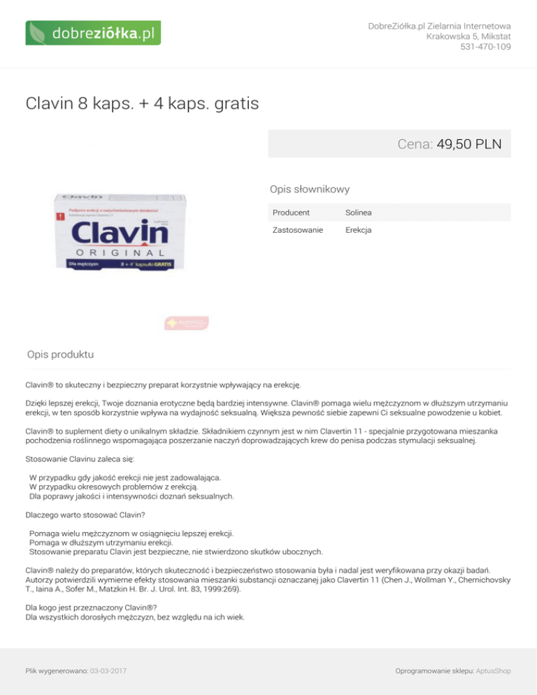 DobreZiółka.pl Zielarnia Internetowa Krakowska 5, Mikstat 531-470-109 Clavin 8 kaps. + 4 kaps. gratis Cena: 49,50 PLN Opis słownikowy Producent Solinea Zastosowanie Erekcja Opis produktu Clavin® to skuteczny i bezpieczny preparat korzystnie wpływający na erekcję. Dzięki lepszej erekcji, Twoje doznania erotyczne będą bardziej intensywne. Clavin® pomaga wielu mężczyznom w dłuższym utrzymaniu erekcji, w ten sposób korzystnie wpływa na wydajność seksualną. Większa pewność siebie zapewni Ci seksualne powodzenie u kobiet. Clavin® to suplement diety o unikalnym składzie. Składnikiem czynnym jest w nim Clavertin 11 - specjalnie przygotowana mieszanka pochodzenia roślinnego wspomagająca poszerzanie naczyń doprowadzających krew do penisa podczas stymulacji seksualnej. Stosowanie Clavinu zaleca się: W przypadku gdy jakość erekcji nie jest zadowalająca. W przypadku okresowych problemów z erekcją. Dla poprawy jakości i intensywności doznań seksualnych. Dlaczego warto stosować Clavin? Pomaga wielu mężczyznom w osiągnięciu lepszej erekcji. Pomaga w dłuższym utrzymaniu erekcji. Stosowanie preparatu Clavin jest bezpieczne, nie stwierdzono skutków ubocznych. Clavin® należy do preparatów, których skuteczność i bezpieczeństwo stosowania była i nadal jest weryfikowana przy okazji badań. Autorzy potwierdzili wymierne efekty stosowania mieszanki substancji oznaczanej jako Clavertin 11 (Chen J., Wollman Y., Chernichovsky T., Iaina A., Sofer M., Matzkin H. Br. J. Urol. Int. 83, 1999:269). Dla kogo jest przeznaczony Clavin®? Dla wszystkich dorosłych mężczyzn, bez względu na ich wiek. Plik wygenerowano: 03-03-2017 Oprogramowanie sklepu: AptusShop DobreZiółka.pl Zielarnia Internetowa Krakowska 5, Mikstat 531-470-109 Jak szybko Clavin® zaczyna działać? Podczas stymulacji efekt erekcji następuje bardzo szybko. Dawkę należy przyjąć za jednym razem, na jedną do czterech godzin przed stosunkiem. Uwaga! Niezbędnym warunkiem osiągnięcia spodziewanego efektu jest stymulacja seksualna! Erekcja i Clavin® Erekcja to wyraz seksualnego podniecenia mężczyzny. Powstanie erekcji warunkuje współdziałanie kilku psychicznych i fizycznych czynników. Każdy przejaw braku równowagi owych pierwiastków składowych może stać się źródłem problemów z erekcją. Clavin® opracowano z myślą o tym, aby wspomóc Twoją erekcję i pewność siebie. Zalecane dawkowanie: Zażywaj 4 kapsułki na raz, najlepiej 1-4 godziny przed stosunkiem. Plik wygenerowano: 03-03-2017 Powered by TCPDF (www.tcpdf.org) Oprogramowanie sklepu: AptusShop