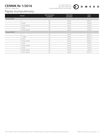 CENNIK Nr 1/2016 ważny od 1 lutego 2016 r. tel. +48 012 262 01 01 faks +48 012 262 02 00 e-mail: [email protected], www.omeko.pl Papier komputerowy Ilość kartonów na palecie Jednostka sprzedaży Cena netto x1 80 karton 59,05 zł x 2 kolor 80 karton 70,00 zł x 2 kolor nadruk 80 karton 70,10 zł x 3 kolor 80 karton 75,00 zł x 3 kolor nadruk 80 karton 75,20 zł x1 80 karton 58,55 zł x 1 (70g) 70 karton 66,35 zł x 2 kolor 80 karton 69,50 zł x 2 kolor nadruk 80 karton 69,60 zł x 3 kolor 80 karton 74,50 zł x 3 kolor nadruk 80 karton 74,70 zł x 4 kolor 80 karton 73,60 zł x 4 kolor nadruk 80 karton 73,80 zł x 5 kolor nadruk 80 karton 85,55 zł Format Format 240x6" Format 240x12" Jeśli nie znalazłeś w naszym cenniku papieru którego szukasz - ZADZWOŃ. Produkujemy wszystkie możliwe rodzaje papieru komputerowego. CENNIK Nr 1/2016 ważny od 1 lutego 2016 r. 1 Rolki Format Ilość kartonów na palecie Jednostka sprzedaży Ilość zgrzewek w kartonie Ilość sztuk w zgrzewce Cena netto za karton Cena netto za 1 sztukę Rolki termiczne 28/20 60 karton 24 10 88,80 zł 0,37 zł 28/23 60 karton 24 10 96,00 zł 0,40 zł 28/25 60 karton 24 10 103,20 zł 0,43 zł 28/30 60 karton 24 10 120,00 zł 0,50 zł 32/30 60 karton 21 10 134,40 zł 0,64 zł 37/23 60 karton 18 10 99,00 zł 0,55 zł 37/25 60 karton 18 10 104,40 zł 0,58 zł 37/30 60 karton 18 10 122,40 zł 0,68 zł 44/30 60 karton 15 10 123,00 zł 0,82 zł 49/23 60 karton 12 10 88,80 zł 0,74 zł 49/30 60 karton 12 10 104,40 zł 0,87 zł 57/05 60 karton 36 10 144,00 zł 0,40 zł 57/15 60 karton 24 10 141,60 zł 0,59 zł 57/20 60 karton 12 10 85,20 zł 0,71 zł 57/23 60 karton 12 10 94,80 zł 0,79 zł 57/25 60 karton 12 10 102,00 zł 0,85 zł 57/30 60 karton 12 10 118,80 zł 0,99 zł 57/40 60 karton 8 10 103,20 zł 1,29 zł 57/60 60 karton 8 10 155,20 zł 1,94 zł 57/80 60 karton 10 5 125,50 zł 2,51 zł 57/100 60 karton 9 4 112,32 zł 3,12 zł 59/30 60 karton 9 10 99,90 zł 1,11 zł 60/30 60 karton 9 10 95,40 zł 1,06 zł 80/30 60 karton 6 10 85,20 zł 1,42 zł 80/72 48 karton 10 5 159,50 zł 3,19 zł 80/80 48 karton 10 5 175,00 zł 3,50 zł 80/90 48 karton 10 5 110/20 60 karton 6 10 98,40 zł 1,64 zł 210/30 294 karton 6 26,94 zł 4,49 zł 3,90 zł Rolki do telefaxu Jeśli nie znalazłeś w naszym cenniku rolki, której szukasz – ZADZWOŃ. Produkujemy wszystkie możliwe rodzaje rolek. CENNIK Nr 1/2016 ważny od 1 lutego 2016 r. 2