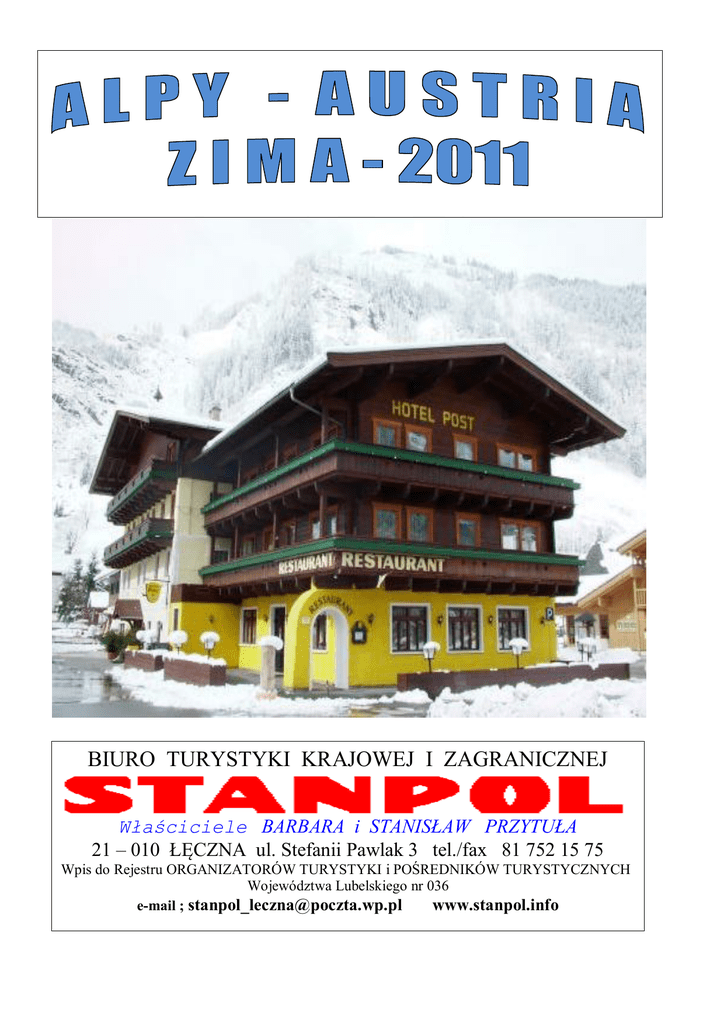 BIURO TURYSTYKI KRAJOWEJ I ZAGRANICZNEJ Właściciele BARBARA i STANISŁAW PRZYTUŁA 21 – 010 ŁĘCZNA ul. Stefanii Pawlak 3 tel./fax 81 752 15 75 Wpis do Rejestru ORGANIZATORÓW TURYSTYKI i POŚREDNIKÓW TURYSTYCZNYCH Województwa Lubelskiego nr 036 e-mail ; [email protected] www.stanpol.info HOTEL „ P O S T ” w FUSCH w samym sercu ALP w Ziemi Salzburskiej k/Kaprun – Zell am See 8 - dniowa WYCIECZKA NARCIARSKA TERMIN i Nr Wycieczki ; 12.03 – 19.03.2011 AZN/010/11 WYŻYWIENIE : śniadania i obiadokolacje + lunch packet TRANSPORT : autokar o podwyższonym standardzie na stok 1 POŁOŻENIE : Hotel „POST” położony w samym centrum uroczej miejscowość Fusch na wys. 811m n.p.m, w sercu parku narodowego Hohe Tauern. Panują tu rewelacyjne warunki do uprawiania sportów zimowych przez cały rok. Niewielka miejscowość z licznymi atrakcjami, w pobliżu źródła lecznicze oraz bardzo znana alpejska wysokogórska droga ”Großglockner Hochalpenstraße”- prowadząca do Grossglocknera - najwyższej góry w Austrii (3.798 m n.p.m.) otoczonej przez lodowce. W Hotelu wybudowanym i umeblowanym w stylu austriackim znajdują się pokoje 2,3,4 osobowe i typu studio, każdy z pełnym węzłem sanitarnym, wszystkie pokoje posiadają telefony i TV Sat z polskimi programami. Do dyspozycji gości j restauracja - serwująca bardzo obfite i smaczne posiłki, ponadto - bar, sala konferencyjna, salon z kominkiem, pokój telewizyjny, tenis stołowy, płatny bilard i sauna. CENA OBEJMUJE : 5. CENA : 1.250,00 PLN - 6 dni pobytu (5 noclegów) zakwaterowanie w pokojach 3,4 osobowych i typu studio, każdy z pełnym węzłem sanitarnym TV SAT i telefonem, - transport autokarem na całej trasie oraz dojazdy na wyciągi narciarskie, - wyżywienie(napoje w cenie posiłków) ; 1 dnia pobytu(13.03.11) obiadokolacja (serwowana), od 2 do 6 dnia pobytu śniadania (szwedzki stół) i obiadokolacje (serwowane) + lunch packet na stok, - ubezpieczenie uczestników od NNW i KL – SKI WARTA, - opiekę pilota biura, - korzystanie ze sprzętu świetlicowego i sal w Ośrodku. CENA NIE OBEJMUJE: - karnetu narciarskiego na SAALBACH- HINTERGLEMM- LEOGANG, - wypożyczenia sprzętu narciarskiego (w sprzęt należy zaopatrzyć się indywidualnie), - imprez fakultatywnych, - posiłków podczas trasy przejazdowej (przewidywany postój na posiłek w drodze dojazdowej w Czechach ( Znojmo), w drodze powrotnej w Polsce k/Cieszyna) PROGRAM RAMOWY: 1 DZIEŃ: – wyjazd w godzinach popołudniowych(godziny odjazdu ustalone zostaną odrębnie dla poszczególnych uczestników na trasach przejazdu autokaru) 2 DZIEŃ: – przyjazd do Hotelu w Austrii w godzinach popołudniowych, zakwaterowanie, obiadokolacja, 3 – 7 DZIEŃ: Codzienna jazda na nartach i snowboardzie ; - od 3 dnia do 7 dnia w godz. 9.30 – 16.00 (karnet 5 dniowy), SAALBACH – HINTERGLEMM - LEOGANG 90 kilometrów tras łatwych 95 kilometrów tras średnio trudnych 15 kilometrów tras trudnych Razem 200 km doskonale przygotowanych tras zjazdowych, 55 nowoczesnych kolejek linowych i wyciągów, 10 km tras biegowych, parki rozrywki, halfpipe’y, trasy wyścigowe, trasy karwingowe i trasy z muldami 21 WYCIĄGÓW ORCZYKOWYCH 18 KOLEJEK KRZESEŁKOWYCH 16 KOLEJEK GONDOLOWYCH SAALBACH- HINTERGLEMM- LEOGANG to największy region narciarski w Austrii. Najnowocześniejsze wyciągi zapewniają szybki wjazd na stoki oraz komfort we wszystkich warunkach pogodowych na ponad 200 km bajkowo przygotowanych tras. Począwszy od stoków z delikatnym spadkiem po czarne trasy mistrzowskie, od parków rozrywki poprzez odcinki wyścigowe na stokach z muldami skończywszy. Natura wspierana jest przez 400 armatek śnieżnych na wszystkich głównych trasach. W całym regionie kulinarne przysmaki oferuje 40 schronisk . W dolinie darmowe, kursujące od godz. 9 do 17 pomiędzy poszczególnymi miejscowościami skibusy odwożą narciarzy z powrotem do punktu wyjścia. 7 – DZIEŃ : - ok. godz. 19.00/20.00 - wyjazd z Hotelu 8 – DZIEŃ : - przyjazd na miejsce wyjazdu, w godzinach popołudniowych, zakończenie imprezy. UWAGA !!! - /*cena imprezy dotyczy wyjazdów z Lublina i okolic, Ceny karnetów 5 dniowych ( zawierają zniżki grupowe): Dorośli ; Młodzież rocznik; 1992 - 1994 Dzieci rocznik ; 1995 - 2004 ok.170,00 EUR ok.127,00 EUR ok. 85,00 EUR UCZESTNICY : - ilość uczestników min 40 max 45 osób - wszystkich obowiązują Ogólne warunki uczestnictwa w imprezach turystycznych organizowanych przez BTKiZ STANPOL ORGANIZATOR : BIURO TURYSTYKI KRAJOWEJ I ZAGRANICZNEJ Właściciele BARBARA i STANISŁAW PRZYTUŁA ZEZWOLENIE ; Wpis do Rejestru ORGANIZATORÓW TURYSTYKI i POŚREDNIKÓW TURYSTYCZNYCH Województwa Lubelskiego Nr 036 SIEDZIBA ; 21-010 Łęczna, ul. Stefanii Pawlak 3, tel./fax 81 752 15 75 e-mail ; [email protected] www.stanpol.info WPŁATY: na konto w PKO BP Oddział 1 Lublin Nr 13 1020 3147 0000 8102 0052 8323 SAALBACH-HINTERGLEMM-LEOGANG