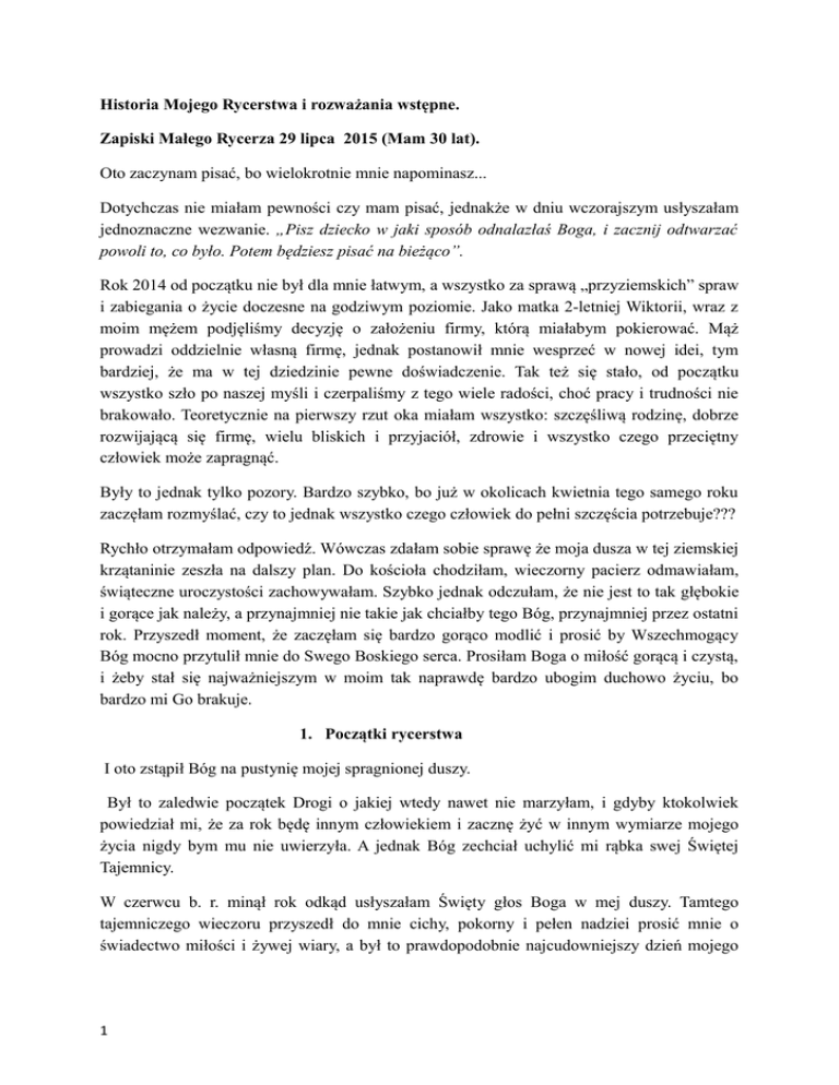 Historia Mojego Rycerstwa i rozważania wstępne. Zapiski Małego Rycerza 29 lipca 2015 (Mam 30 lat). Oto zaczynam pisać, bo wielokrotnie mnie napominasz... Dotychczas nie miałam pewności czy mam pisać, jednakże w dniu wczorajszym usłyszałam jednoznaczne wezwanie. „Pisz dziecko w jaki sposób odnalazłaś Boga, i zacznij odtwarzać powoli to, co było. Potem będziesz pisać na bieżąco”. Rok 2014 od początku nie był dla mnie łatwym, a wszystko za sprawą „przyziemskich” spraw i zabiegania o życie doczesne na godziwym poziomie. Jako matka 2-letniej Wiktorii, wraz z moim mężem podjęliśmy decyzję o założeniu firmy, którą miałabym pokierować. Mąż prowadzi oddzielnie własną firmę, jednak postanowił mnie wesprzeć w nowej idei, tym bardziej, że ma w tej dziedzinie pewne doświadczenie. Tak też się stało, od początku wszystko szło po naszej myśli i czerpaliśmy z tego wiele radości, choć pracy i trudności nie brakowało. Teoretycznie na pierwszy rzut oka miałam wszystko: szczęśliwą rodzinę, dobrze rozwijającą się firmę, wielu bliskich i przyjaciół, zdrowie i wszystko czego przeciętny człowiek może zapragnąć. Były to jednak tylko pozory. Bardzo szybko, bo już w okolicach kwietnia tego samego roku zaczęłam rozmyślać, czy to jednak wszystko czego człowiek do pełni szczęścia potrzebuje??? Rychło otrzymałam odpowiedź. Wówczas zdałam sobie sprawę że moja dusza w tej ziemskiej krzątaninie zeszła na dalszy plan. Do kościoła chodziłam, wieczorny pacierz odmawiałam, świąteczne uroczystości zachowywałam. Szybko jednak odczułam, że nie jest to tak głębokie i gorące jak należy, a przynajmniej nie takie jak chciałby tego Bóg, przynajmniej przez ostatni rok. Przyszedł moment, że zaczęłam się bardzo gorąco modlić i prosić by Wszechmogący Bóg mocno przytulił mnie do Swego Boskiego serca. Prosiłam Boga o miłość gorącą i czystą, i żeby stał się najważniejszym w moim tak naprawdę bardzo ubogim duchowo życiu, bo bardzo mi Go brakuje. 1. Początki rycerstwa I oto zstąpił Bóg na pustynię mojej spragnionej duszy. Był to zaledwie początek Drogi o jakiej wtedy nawet nie marzyłam, i gdyby ktokolwiek powiedział mi, że za rok będę innym człowiekiem i zacznę żyć w innym wymiarze mojego życia nigdy bym mu nie uwierzyła. A jednak Bóg zechciał uchylić mi rąbka swej Świętej Tajemnicy. W czerwcu b. r. minął rok odkąd usłyszałam Święty głos Boga w mej duszy. Tamtego tajemniczego wieczoru przyszedł do mnie cichy, pokorny i pełen nadziei prosić mnie o świadectwo miłości i żywej wiary, a był to prawdopodobnie najcudowniejszy dzień mojego 1 duchowego życia. Nagle usłyszałam w swoim sercu i duszy Głos Boga, przekazany przez człowieka i odczułam pragnienie zostać jednym z Małych Rycerzy Miłosierdzia Bożego. I wziął mnie Miłosierny Jezus w Swe święte i Nieskalane Dłonie jako małą dziecinę na resztę dni mojego życia. Wtedy wszystko się zaczęło. Zostałam powołana do Legionu Małych Rycerzy. Odtąd na nowo oczarowana Bogiem postanowiłam zgłębiać te Świętą Tajemnicę jaką Bóg w swej łaskawości dla mnie przygotował, prawdopodobnie jeszcze zanim mnie powołał na ten świat. Według wskazówek podanych przez Siostrę Zofię Grochowską, założycielkę naszego Legionu, która to przekazała ludowi czego Bóg od niego żąda w ramach rycerskiej posługi, postępowałam przez kilka kolejnych miesięcy zachowując rygorystyczne posty, zanosząc do Boga gorące modlitwy, ofiarując mu wszelkie cierpienia, umartwienia duszy i ciała oraz dobre uczynki jako ofiarę. Wówczas stopniowo zrodziła się miłosierna miłość do Boga i bliźniego. Byłam jednak rycerzem walczącym w pojedynkę, i już po krótkim czasie w mojej duszy zrodziło się pragnienie przynależności do zgromadzenia. Zaczęłam więc szukać. Droga nie była łatwa. Pytałam księży, osób świeckich i szukałam po okolicznych kościołach, gdzie znajdę zgromadzenie Małych Rycerzy Miłosiernego Serca Jezusowego. Niestety okazało się że w moim mieście Nowym Sączu nikt nie wiedział o takim zgromadzeniu, i w żadnym z kościołów sądeckich ono nie zostało do tej pory utworzone. Nie spoczęłam jednak. Pytałam i szukałam nadal. Pewnego październikowego dnia postanowiłam napisać zapytanie do znajomego księdza Wikariusza Marina Chełmeckiego, który właśnie odszedł z naszej Parafii na dalszą posługę. Oto list który do Niego napisałam. Niech będzie pochwalony Jezus Chrystus. Nie sposób wyrazić jak wielka pustka bez Księdza i ks. Sławka. Wiele osób wciąż o Was pyta i bardzo mile wspomina. Jeśli można spytać, dokąd Księży przeniesiono? Jedyną nadzieją jest głęboka wiara w to, że Pan Bóg kieruje naszymi losami. Już On dobrze wie co dla człowieka najlepsze. Zapewne placówka w której pełni ks. swoją posługę w chwili obecnej, jest najbardziej odpowiednim miejscem, a wspólnota wiernych tam zgromadzona potrzebuje Księdza najpilniej. Zdaję sobie sprawę z nawału obowiązków i nowych wyzwań związanych ze zmianą Parafii, jednak głęboko wierzę, że Pan Bóg ześle życzliwych ludzi, którzy szybciutko pomogą się „zaklimatyzować” i wszystko powoli się ustabilizuje. Ja osobiście pragnę bardzo serdecznie podziękować za każdą spowiedź świętą, a w szczególności za tę ostatnią, która miała miejsce w maju b.r. Wówczas przytoczył mi Ks. Wspaniały przykład Matki Teresy, i polecenie – im więcej masz pracy i obowiązków, tym więcej się módl! Na kilka dni po tej spowiedzi, odwiedziła mnie moja teściowa, i poleciła mi niezwykłą książeczkę pt. „ Armia Najdroższej Krwi Jezusa Chrystusa” . Od samego początku pragnęłam przybliżyć sobie jej treść. Postanowiłam, że każdego dnia wieczorem, poświęcę 2 czas by po prostu poczytać po kilka stron, zapoznać się z nią, pomodlić się nieco więcej.