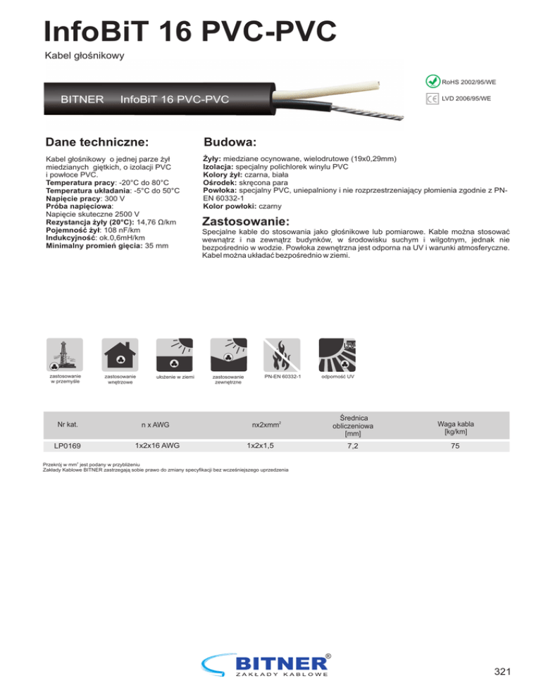 InfoBiT 16 PVC-PVC Kabel głośnikowy RoHS BITNER InfoBiT 16 PVC-PVC RoHS 2002/95/WE LVD 2006/95/WE Dane techniczne: Budowa: Kabel głośnikowy o jednej parze żył miedzianych giętkich, o izolacji PVC i powłoce PVC. Temperatura pracy: -20°C do 80°C Temperatura układania: -5°C do 50°C Napięcie pracy: 300 V Próba napięciowa: Napięcie skuteczne 2500 V Rezystancja żyły (20°C): 14,76 Ω/km Pojemność żył: 108 nF/km Indukcyjność: ok.0,6mH/km Minimalny promień gięcia: 35 mm Żyły: miedziane ocynowane, wielodrutowe (19x0,29mm) Izolacja: specjalny polichlorek winylu PVC Kolory żył: czarna, biała Ośrodek: skręcona para Powłoka: specjalny PVC, uniepalniony i nie rozprzestrzeniający płomienia zgodnie z PNEN 60332-1 Kolor powłoki: czarny Zastosowanie: Specjalne kable do stosowania jako głośnikowe lub pomiarowe. Kable można stosować wewnątrz i na zewnątrz budynków, w środowisku suchym i wilgotnym, jednak nie bezpośrednio w wodzie. Powłoka zewnętrzna jest odporna na UV i warunki atmosferyczne. Kabel można układać bezpośrednio w ziemi. UV zastosowanie w przemyśle zastosowanie wnętrzowe ułożenie w ziemi Nr kat. n x AWG LP0169 1x2x16 AWG zastosowanie zewnętrzne PN-EN 60332-1 odporność UV nx2xmm2 1x2x1,5 Średnica obliczeniowa [mm] Waga kabla [kg/km] 7,2 75 Przekrój w mm jest podany w przybliżeniu Zakłady Kablowe BITNER zastrzegają sobie prawo do zmiany specyfikacji bez wcześniejszego uprzedzenia 2 ® 321