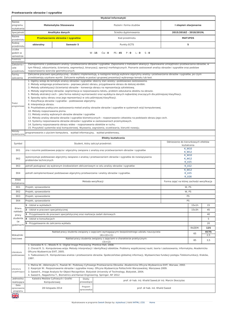 Przetwarzanie obrazów i sygnałów Wydział Informatyki Nazwa programu kształcenia Matematyka Stosowana Poziom i forma studiów I stopień stacjonarne Specjalność Analityka danych Ścieżka dyplomowania 2015/2016Z - 2018/2019L Nazwa przedmiotu Przetwarzanie obrazów i sygnałów Kod przedmiotu MAT1POS Punkty ECTS 5 Rodzaj przedmiotu obieralny Semestr 5 Liczba godzin w semestrze W - 15 Ćw - 0 PS - 45 P - 0 L - 0 S - 0 Przedmioty wprowadzające Założenia i cele przedmiotu Formy zaliczenia Treści programowe Zaznajomienie z podstawami analizy i przetwarzania obrazów i sygnałów. Zapoznanie z metodami akwizycji. Opanowanie umiejętności przetwarzania obrazów, w tym filtracji, odszumiania, ścieniania, segmentacji, binaryzacji, operacji morfologicznych. Poznanie zastosowań analizy obrazów i sygnałów oraz podstaw rozpoznawania wzorców geometrycznych. Zaliczenie pracowni specjalistycznej - studenci implementują, a następnie testują wybrane algorytmy analizy i przetwarzania obrazów i sygnałów, po czym przedstawiają uzyskane wyniki. Zaliczenie wykładu w postaci grupowej prezentacji wybranego tematu lub test. 1. Ogólny wstęp do tematyki analizy obrazów i sygnałów: obecny stan wiedzy i podstawowe zastosowania. 2. Metody wstępnego przetwarzania – poprawa jakości obrazu, przygotowanie obrazu do dalszej obróbki. 3. Metody szkieletyzacji (ścieniania) obrazów – konwersja obrazu na reprezentację szkieletową. 4. Metody segmentacji obrazów: segmentacja w rozpoznawaniu tekstu, problem odszukania obiektu na obrazie. 5. Metody ekstrakcji cech – jako forma redukcji wymiarowości oraz wydobycia danych najbardziej znaczących dla późniejszej klasyfikacji. 6. Sposoby opisu obrazu oraz jego reprezentacji w celu późniejszej klasyfikacji. 7. Klasyfikacja obrazów i sygnałów – podstawowe algorytmy. 8. Interpretacja obrazu. 9. Przykładowe praktyczne zastosowania metod analizy obrazów obrazów i sygnałów w systemach wizji komputerowej. 10. Metody rozpoznawania pisma. 11. Metody analizy wybranych obrazów obrazów i sygnałów 12. Metody analizy obrazów obrazów i sygnałów biometrycznych – rozpoznawanie człowieka na podstawie obrazu jego cech. 13. Systemy rozpoznawania obrazów obrazów i sygnałów w zastosowaniach przemysłowych. 14. Systemy rozpoznawania obrazu wideo – rozpoznawania obiektów w ruchu. 15. Przyszłość systemów wizji komputerowej. Wyzwania, zagrożenia, oczekiwania, kierunki rozwoju. Metody programowanie z użyciem komputera, wykład informacyjny, wykład problemowy, dydaktyczne Efekty kształcenia Symbol Odniesienie do kierunkowych efektów kształcenia Student, który zaliczył przedmiot: K_W10 K_W12 K_W10 K_W12 K_U15 EK1 zna i rozumie podstawowe pojęcia i algorytmy związane z analizą oraz przetwarzaniem obrazów i sygnałów EK2 wykorzystuje podstawowe algorytmy związane z analizą i przetwarzaniem obrazów i sygnałów do rozwiązywania problemów technicznych EK3 potrafi posługiwać się wybranym środowiskiem obliczeniowym w celu analizy obrazów i sygnałów K_U12 potrafi zaimplementować podstawowe algorytmy przetwarzania i analizy obrazów i sygnałów. K_W12 K_U15 K_U16 EK4 Efekt kształcenia Metoda weryfikacji Forma zajęć na której zachodzi weryfikacja EK1 Projekt, sprawozdanie W, PS EK2 Projekt, sprawozdanie W, PS EK3 Projekt, sprawozdanie PS EK4 Projekt, sprawozdanie PS Bilans nakładu pracy studenta (w godzinach) 1 - Udział w wykładach 15x1h 15 2 - Udział w pracowni specjalistycznej 15x3h 45 3 - Przygotowanie do pracowni specjalistycznej oraz realizacja zadań domowych 40 4 - Udział w konsultacjach 5 5 - Przygotowanie do zaliczenia wykładu 20 RAZEM: Wskaźniki ilościowe Literatura podstawowa Literatura uzupełniająca Jednostka realizująca 1. 2. 3. 4. Malina W., Ablemeyko S., Pawlak W.: Podstawy Cyfrowego Przetwarzania Obrazów. Akademicka Oficyna Wydawnicza EXIT, Warsaw, 2002. Kasprzyk W.: Rozpoznawanie obrazów i sygnałów mowy. Oficyna Wydawnicza Politechniki Warszawskiej, Warszawa 2009. Saeed K., Image Analysis for Object Recognition. Bialystok University of Technology, Bialystok, 2004. Saeed K., Nagashima T., Biometrics and Kansei Engineering. Springer, NY 2012 Katedra Mediów Cyfrowych i Grafiki Komputerowej Osoby prowadzące prof. dr hab. inż. Khalid Saeed,dr inż. Marcin Skoczylas 28 listopada 2014 Program opracował(a) prof. dr hab. inż. Khalid Saeed Data opracowania programu 125 ECTS Nakład pracy studenta związany z zajęciami wymagającymi bezpośredniego udziału nauczyciela: 65 2,5 (4)+(2)+(1) Nakład pracy studenta związany z zajęciami o charakterze praktycznym: 85 3,5 (3)+(2) 1. Gonzalez R. C., Woods R. E.: Digital Image Processing. Prentice Hall, 2008. 2. Choraś R. S.: Komputerowa wizja: Metody interpretacji i identyfikacji obiektów. Problemy współczesnej nauki, teoria i zastosowania, informatyka, Akademicka Oficyna Wydawnicza EXIT, 2005. 3. Tadeusiewicz R.: Komputerowa analiza i przetwarzanie obrazów. Społeczeństwo globalnej informacji, Wydawnictwo fundacji postępu Telekomunikacji, Kraków, 1997. Wydrukowane w programie Świerk Design by: styleshout | Valid XHTML | CSS Home