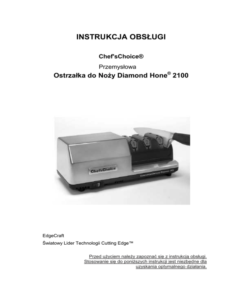 INSTRUKCJA OBSŁUGI Chef'sChoice® Przemysłowa Ostrzałka do NoŜy Diamond Hone® 2100 EdgeCraft Światowy Lider Technologii Cutting Edge™ Przed uŜyciem naleŜy zapoznać się z instrukcją obsługi. Stosowanie się do poniŜszych instrukcji jest niezbędne dla uzyskania optymalnego działania. WAśNE KWESTIE BESPIECZEŃSTWA UŜywanie przyrządów elektrycznych zawsze wymaga przestrzegania podstawowych środków bezpieczeństwa, obejmujących poniŜsze zalecenia: 1. Zapoznaj się ze wszystkimi instrukcjami. 2. Zabezpiecz się przed niebezpieczeństwem poraŜenia prądem, niedozwolone jest zanurzanie elektrycznego silnika Chef’sChoice w wodzie lub innych płynach. 3. Za pomocą Chef’sChoice moŜna ostrzyć jedynie czyste ostrza noŜy. 4. Przed nałoŜeniem lub zdjęciem jakichkolwiek elementów, oraz czyszczeniem, wyjmij wtyczkę z gniazda, kiedy urządzenie nie jest w uŜyciu. przed 5. Unikaj kontaktu z częściami ruchomymi. 6. Nie uŜywaj urządzeń z uszkodzonym przewodem lub wtyczką, w przypadku awarii, upuszczenia lub innego uszkodzenia urządzenia. MoŜesz zwrócić swoją ostrzałkę do fabryki EdgeCraft’s, gdzie wyceniony zostanie koszt naprawy bądź regulacji elektrycznej lub mechanicznej. 6a. (W przypadku klientów spoza Stanów Zjednoczonych). Jeśli uszkodzeniu uległ przewód zasilający, musi zostać wymieniony w wyznaczonym zakładzie naprawczym, poniewaŜ wymaga to uŜycia specjalnego narzędzia. Prosimy o kontakt z lokalnym dystrybutorem Chef’sChoice. 7. Korzystanie z akcesoriów niezalecanych lub nie sprzedawanych przez EdgeCraft Corporation moŜe być przyczyną poŜaru, poraŜenia prądem lub obraŜeń. 8. Chef’sChoice Model 2100 została zaprojektowana do ostrzenia noŜy kuchennych, kieszonkowych oraz większości noŜy sportowych. Urządzenia nie naleŜy wykorzystywać do ostrzenia noŜy, ostrzy siekier, ani Ŝadnych innych ostrzy, które nie mieszczą się łatwo w otworach. 9. Nie pozwól, aby przewód zwisał z krawędzi stołu lub lady, lub dotykał rozgrzanych powierzchni. 10. Kiedy Chef’sChoice jest w pozycji “ON” (włączony), zawsze musi znajdować się na stabilnym stole lub ladzie. 11. OSTRZEśENIE: NOśE NAOSTRZONE ODPOWIEDNIO ZA POMOCĄ CHEF’SCHOICE SĄ OSTRZEJSZE NIś PODEJRZEWASZ. W CELU UNIKNIĘCIA OBRAśEŃ, ZACHOWAJ SZCZEGÓLNĄ OSTROśNOŚĆ PODCZAS ICH UśYWANIA. NIE TNIJ W KIERUNKU DO SIEBIE. NIE PRZESUWAJ PALCA PO OSTRZU NOśA. PRZECHOWUJ W BEZPIECZNYM MIEJSCU. 12. Nie korzystaj z urządzenie na zewnątrz. 13. Korzystanie z urządzenia przez lub w pobliŜu dzieci, w kaŜdym przypadku wymaga niezwykłej ostroŜności i nadzoru. 14. Do Chef’sChoice nie wolno stosować Ŝadnych oleje do honowania, wody, ani Ŝadnych innych środków smarujących. 15. ZACHOWAJ TĘ INSTRUKCJĘ OBSŁUGI. Gratulujemy wyboru Przemysłowej Ostrzałki do NoŜy Chef’sChoice® Model 2100! Przekonasz się, iŜ wykorzystana tu metoda ostrzenia nada wszystkim Twoim noŜom wyjątkowo ostre i trwałe ostrza. Metodę tę wspiera EdgeCraft, Światowy Lider Technologii Cutting Edge. Przemysłowa Diamentowa Ostrzałka do NoŜy Chef‘sChoice® Diamond Hone® Model 2100 łączy w sobie ścierniwo diamentowe oraz zaawansowaną technologię ostrzenia i szlifowania dając najostrzejsze i najtrwalsze ostrza spośród wszystkich dostępnych na rynku ostrzałek. Dzięki temu urządzeniu wszystkie Twoje noŜe będą ostre jak brzytwa. Ponowne zaostrzenie noŜy, raz naostrzonych za pomocą Modelu 2100 zajmuje mniej niŜ minutę. Dlatego teŜ, jeśli Model 2100 znajduje się w dobrze przemyślanym miejscu, podostrzenie noŜy będzie tak łatwe i szybkie, Ŝe tradycyjna osełka stanie się zbędna. ROZPAKOWYWANIE I PRZYGOTOWANIE DO UśYCIA Model 2100 posiada napęd silnikowy oraz odłączalny Moduł Ostrzący, które są pakowane i dostarczane osobno. (Patrz Zdj.1) W celu złoŜenia urządzenia, wsuń Moduł Ostrzący w szyny prowadzące elementu napędowego, (Zdj. 2) i przesuń moduł w kierunku obudowy silnika do momentu zablokowania go we właściwej pozycji. Jeśli elementy nie połączą się łatwo I szybko, stosuj się do instrukcji podanych w rozdziale “Wsuwanie...” tej instrukcji. Zdj. 1 Model 2100: schemat Zdj. 2 Moduł ostrzący mocowany jest na szynach, w celu wyjęcia modułu naleŜy wcisnąć przycisk zwalniający. OPIS – OSTRZAŁKA MODEL 2100 Ostrzałka Model 2100 jest wyposaŜona w nowoczesny 3 stopniowy ostrzący moduł EdgeSelect, który po kolei ostrzy, honuje i ponownie ostrzy Twój nóŜ do perfekcji. W pierwszej fazie nóŜ jest ostrzony przy pomocy w 100% diamentowych ścierniw, a następnie honowany w drugim stopniu delikatnymi, diamentowymi drobinami. Na 3 poziomie ostrze jest ostrzone i polerowane aŜ do uzyskania niebywałej ostrości. Ten opatentowany 3-stopniowy system tworzy gładką potrójnie ostrą powierzchnię ostrza typu Trizor, które pozostaje ostre o wiele dłuŜej niŜ noŜe ostrzone konwencjonalnie. Moduł ostrzący, posiadający wszystkie 3 stopnie, jest niezaleŜną częścią i moŜe być wyjęty z ostrzałki w celu umycia go w zmywarce lub ręcznie. Element ten wyjmuje się bardzo łatwo poprzez wciśnięcie przycisku zwalniającego (zdj. 2) i wysunięcie modułu z części napędowej. Odporny i mocny silnik znajduje się w specjalnej obudowie. Zamontowane na wale napędu silnikowego sprzęgła wielowypustowe oraz Moduł Ostrzący umoŜliwiają ich szybkie włączenie. Na wszystkich poziomach ostrzeniach, krawędź noŜa musi być ostrzona poprzez naprzemienne natarcia prawego i lewego gniazda (zdj. 3). Prowadnice i plastikowe spręŜyny dociskowe stabilizują ostrze noŜa i ustawiają je perfekcyjnie na kaŜdym stopniu. Ruch opadający ostrza w kaŜdym z gniazd jest ograniczony i kontrolowany przez Płytkę Podtrzymującą Ostrze, wykonaną z odpornego polimeru, który odpowiada za optymalne osadzanie krawędzi, nie uszkadzając kształtowanej krawędzi noŜa. Płytki Podtrzymujące Ostrze znajdują się z przodu o