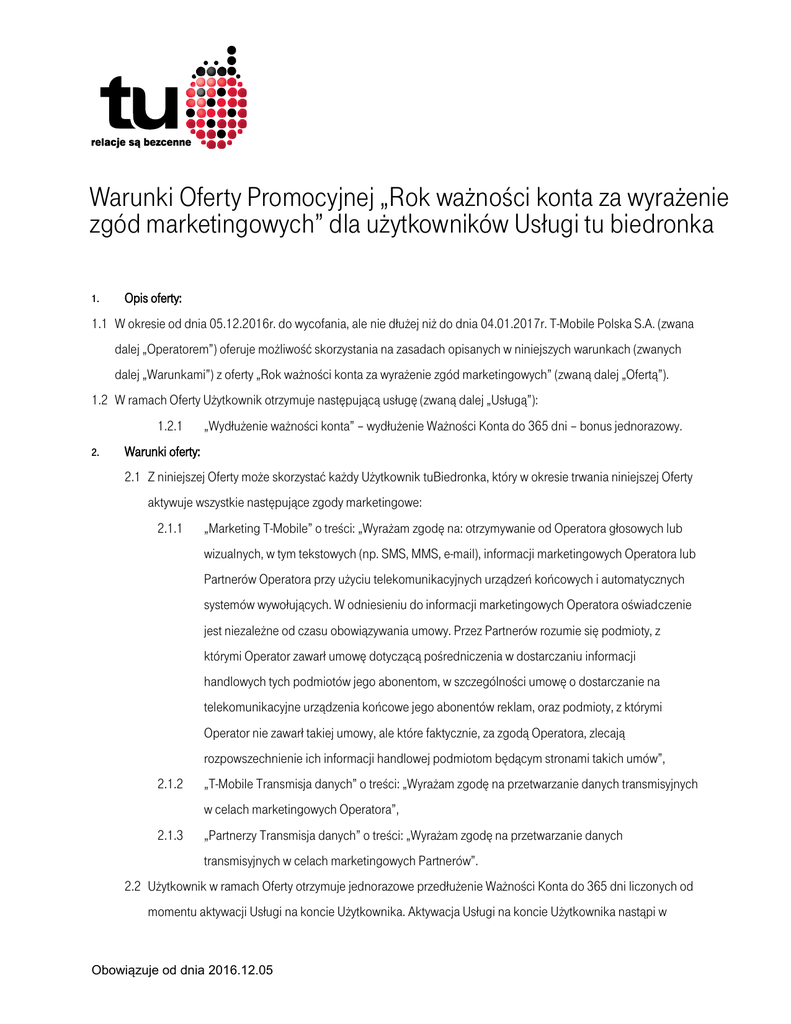 Warunki Oferty Promocyjnej „Rok ważności konta za wyrażenie zgód marketingowych” dla użytkowników Usługi tu biedronka 1. Opis oferty: 1.1 W okresie od dnia 05.12.2016r. do wycofania, ale nie dłużej niż do dnia 04.01.2017r. T-Mobile Polska S.A. (zwana dalej „Operatorem”) oferuje możliwość skorzystania na zasadach opisanych w niniejszych warunkach (zwanych dalej „Warunkami”) z oferty „Rok ważności konta za wyrażenie zgód marketingowych” (zwaną dalej „Ofertą”). 1.2 W ramach Oferty Użytkownik otrzymuje następującą usługę (zwaną dalej „Usługą”): 1.2.1 2. „Wydłużenie ważności konta” – wydłużenie Ważności Konta do 365 dni – bonus jednorazowy. Warunki oferty: 2.1 Z niniejszej Oferty może skorzystać każdy Użytkownik tuBiedronka, który w okresie trwania niniejszej Oferty aktywuje wszystkie następujące zgody marketingowe: 2.1.1 „Marketing T-Mobile” o treści: „Wyrażam zgodę na: otrzymywanie od Operatora głosowych lub wizualnych, w tym tekstowych (np. SMS, MMS, e-mail), informacji marketingowych Operatora lub Partnerów Operatora przy użyciu telekomunikacyjnych urządzeń końcowych i automatycznych systemów wywołujących. W odniesieniu do informacji marketingowych Operatora oświadczenie jest niezależne od czasu obowiązywania umowy. Przez Partnerów rozumie się podmioty, z którymi Operator zawarł umowę dotyczącą pośredniczenia w dostarczaniu informacji handlowych tych podmiotów jego abonentom, w szczególności umowę o dostarczanie na telekomunikacyjne urządzenia końcowe jego abonentów reklam, oraz podmioty, z którymi Operator nie zawarł takiej umowy, ale które faktycznie, za zgodą Operatora, zlecają rozpowszechnienie ich informacji handlowej podmiotom będącym stronami takich umów”, 2.1.2 „T-Mobile Transmisja danych” o treści: „Wyrażam zgodę na przetwarzanie danych transmisyjnych w celach marketingowych Operatora”, 2.1.3 „Partnerzy Transmisja danych” o treści: „Wyrażam zgodę na przetwarzanie danych transmisyjnych w celach marketingowych Partnerów”. 2.2 Użytkownik w ramach Oferty otrzymuje jednorazowe przedłużenie Ważności Konta do 365 dni liczonych od momentu aktywacji Usługi na koncie Użytkownika. Aktywacja Usługi na koncie Użytkownika nastąpi w Obowiązuje od dnia 2016.12.05 okresie do 14 dni liczonych od momentu spełnienia warunków określonych w pkt 2.1 i zostanie potwierdzona wiadomością SMS. 2.3 Wyrażenie zgód marketingowych może odbyć się w dowolny dopuszczony przez Operatora sposób, w tym: 2.3.1 Dla zgody „Marketing T-Mobile” – poprzez wysłanie kodu ekspresowego *140*200*1# 2.3.2 Dla zgody „T-Mobile Transmisja danych” – poprzez wysłanie kodu ekspresowego *140*200*2# 2.3.3 Dla zgody „Partnerzy Transmisja danych” – poprzez wysłanie kodu ekspresowego *140*200*3# 2.4 Operator zastrzega sobie prawo do zmiany niniejszej Oferty w każdym czasie, co nie będzie naruszać praw nabytych Użytkowników. 2.5 Użytkownik może sprawdzić datę Ważności Konta kodem ekspresowym *101# Obowiązuje od dnia 2016.12.05
