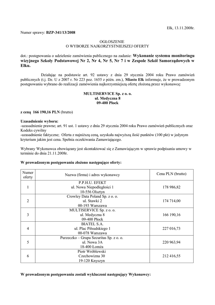 Ełk, 13.11.2008r. Numer sprawy: BZP-341/13/2008 OGŁOSZENIE O WYBORZE NAJKORZYSTNIEJSZEJ OFERTY dot.: postępowania o udzielenie zamówienia publicznego na zadanie: Wykonanie systemu monitoringu wizyjnego Szkoły Podstawowej Nr 2, Nr 4, Nr 5, Nr 7 i w Zespole Szkół Samorządowych w Ełku. Działając na podstawie art. 92 ustawy z dnia 29 stycznia 2004 roku Prawo zamówień publicznych (t.j. Dz. U z 2007 r. Nr 223 poz. 1655 z późn. zm.), Miasto Ełk informuje, że w prowadzonym postępowaniu wybrano do realizacji zamówienia najkorzystniejszą ofertę złożoną przez wykonawcę: MULTISERVICE Sp. z o. o. ul. Medyczna 8 09-400 Płock z ceną 166 190,16 PLN (brutto) Uzasadnienie wyboru: -uzasadnienie prawne; art. 91 ust. 1 ustawy z dnia 29 stycznia 2004 roku Prawo zamówień publicznych oraz Kodeks cywilny -uzasadnienie faktyczne; Oferta z najniższą ceną, uzyskała najwyższą ilość punktów (100 pkt) w jedynym kryterium jakim jest cena. Spełnia oczekiwania Zamawiającego. Wybrany Wykonawca obowiązany jest skontaktować się z Zamawiającym w sprawie podpisania umowy w terminie do dnia 21.11.2008r. W prowadzonym postępowaniu złożono następujące oferty: Numer oferty 1 2 3 4 5 6 Nazwa (firma) i adres wykonawcy P.P.H.U. EFEKT ul. Nowa Niepodległości 1 10-556 Olsztyn Crowley Data Poland Sp. z o. o. ul. Stawki 2 00-193 Warszawa MULTISERVICE Sp. z o. o. ul. Medyczna 8 09-400 Płock BIATEL S.A. ul. Plac Piłsudskiego 1 00-078 Warszawa Purzeczko – Grupa Securitas Sp. z o. o. ul. Nowa 3A 18-400 Łomża Piotr Wróblewski Czechowizna 30 19-120 Knyszyn W prowadzonym postępowaniu zostali wykluczoni następujący Wykonawcy: Cena PLN (brutto) 178 986,82 174 714,00 166 190,16 227 016,73 220 963,94 212 416,55 Lp. Numer oferty Nazwa (firma) wykonawcy 1 1 P.P.H.U. EFEKT, ul. Nowa Niepodległości 1, 10-556 Olsztyn 2 5 Purzeczko – Grupa Securitas Sp. z o. o., ul. Nowa 3A, 18-400 Łomża Oferta Nr 1 Uzasadnienie prawne: Art. 24 ust. 2 pkt 3 ustawy Prawo zamówień publicznych, Uzasadnienie faktyczne: Wykonawca P.P.H.U. Efekt został wezwany do uzupełnienia dokumentów potwierdzających spełnianie warunków określonych w SIWZ, a także do wyjaśnień treści oferty. Wykonawca nie dokonał w/w czynności w wyznaczonym terminie w związku z tym podlega on wykluczeniu na podstawie art. 24 ust. 2 pkt 3 ustawy Prawo zamówień publicznych, a ofertę jego traktuje się jako odrzuconą. Oferta Nr 2 Uzasadnienie prawne: Art. 24 ust. 2 pkt 3 ustawy Prawo zamówień publicznych, Wykonawca Purzeczko – Grupa Securitas Sp. z o. o. (lider konsorcjum) wezwany do wyjaśnień i uzupełnienia dokumentów potwierdzających spełnianie warunków określonych w SIWZ, Wykonawca nie dokonał w/w czynności w wyznaczonym terminie w związku z tym podlega on wykluczeniu na podstawie art. 24 ust. 2 pkt 3 ustawy Prawo zamówień publicznych, a ofertę jego traktuje się jako odrzuconą. W prowadzonym postępowaniu odrzucone zostały następujące oferty: Na podstawie art. 24 ust. 4 ustawy Prawo zamówień publicznych, ofertę wykonawcy wykluczonego ( t. j. P.P.H.U. Efekt i Purzeczko – Grupa Securitas Sp. z o. o.) uznaje się za odrzuconą, Punktacja przyznana ofertom spełniającym wszystkie wymagania zawarte w SIWZ: Numer Liczba pkt w kryterium Nazwa (firma) i adres wykonawcy oferty (cena – 100 pkt) 2 Crowley Data Poland Sp. z o. o., ul. Stawki 2, 00-193 Warszawa 95,12 3 MULTISERVICE Sp. z o. o., ul. Medyczna 8, 09-400 Płock 100,00 4 BIATEL S.A., ul. Plac Piłsudskiego 1, 00-078 Warszawa 73,21 6 Piotr Wróblewski, Czechowizna 30, 19-120 Knyszyn 78,24 Środki ochrony prawnej Od niniejszej decyzji przysługują środki ochrony prawnej określone w ustawie z dnia 29 stycznia 2004 roku Prawo zamówień publicznych – dział VI „Środki ochrony prawnej”. „Wobec treści ogłoszenia o zamówieniu, czynności podjętych przez zamawiającego w toku postępowania oraz w przypadku zaniechania przez zamawiającego czynności, do której jest obowiązany na podstawie ustawy, można wnieść protest do zamawiającego. Przepisy art. 27 ust. 1-3 stosuje się odpowiednio. Protest wnosi się w terminie 7 dni od dnia, w którym powzięto lub można było powziąć wiadomość o okolicznościach stanowiących podstawę jego wniesienia. Protest uważa się za wniesiony z chwilą, gdy dotarł on do zamawiającego w taki sposób, że mógł zapoznać się z jego treścią". „Odwołanie przysługuje od rozstrzygnięcia protestu dotyczącego: - wyboru trybu negocjacji bez ogłoszenia, zamówienia z wolnej ręki i zapytania o cenę; - opisu sposobu oceny spełniania warunków udziału w postępowaniu; - wykluczenia wykonawcy z postępowania o udzielenie zamówienia; - odrzucenia oferty. Odwołanie wnosi się do Prezesa Urzędu w terminie 5 dni od dnia doręczenia rozstrzygnięcia protestu lub upływu terminu rozstrzygnięcia protestu, jednocześnie przekazując kopię treści odwołania zamawiającemu. Złożenie odwołania w placówce pocztowej operatora publicznego jest równoznaczne z jego wniesieniem do Prezesa Urzędu.” Zastępca Prezydenta Miasta Włodzimierz Szelążek