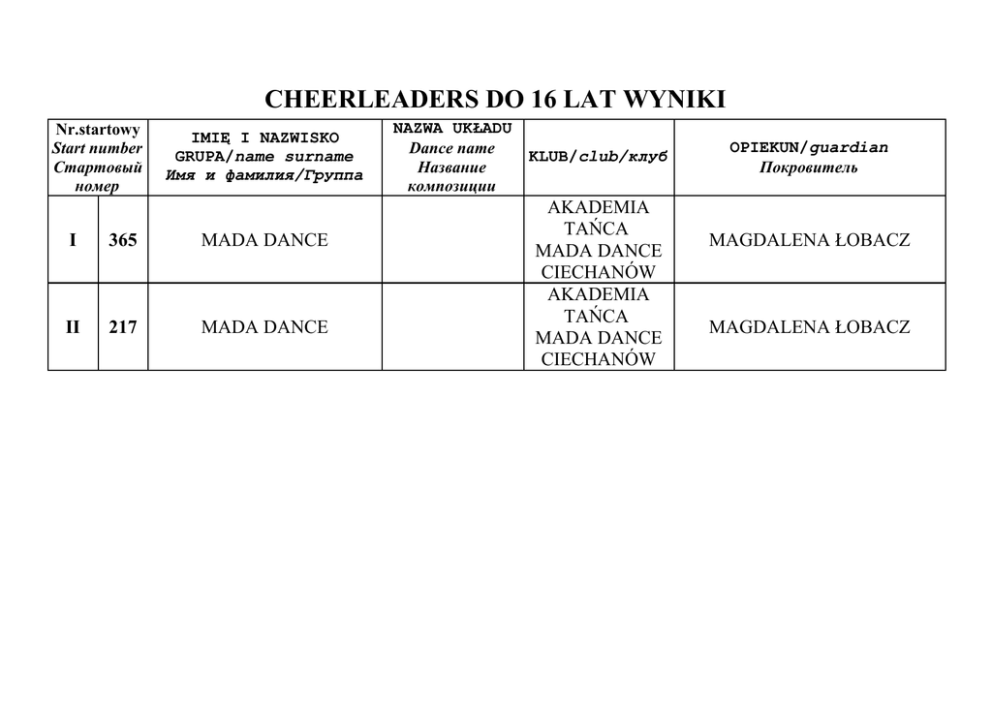 CHEERLEADERS DO 16 LAT WYNIKI Nr.startowy Start number Стартовый номер IMIĘ I NAZWISKO GRUPA/name surname Имя и фамилия/Группа I 365 MADA DANCE II 217 MADA DANCE NAZWA UKŁADU Dance name Название композиции KLUB/club/клуб AKADEMIA TAŃCA MADA DANCE CIECHANÓW AKADEMIA TAŃCA MADA DANCE CIECHANÓW OPIEKUN/guardian Покровитель MAGDALENA ŁOBACZ MAGDALENA ŁOBACZ DISCO DANCE DUETY DO LAT 11 WYNIKI Nr.startowy Start number Стартовый номер V 181 II 291 I 311 III 65 VI 91 IV 227 IMIĘ I NAZWISKO GRUPA/name surname Имя и фамилия/Группа JUSTYNA KONDRACIUK MARTYNA OLĘDZKA SOŁOWIEJ EMILIA WERONIKA KURZĄDKOWSKA NATALIA SIELWONCZUK GABRYSIA KRAUZE JULIA CZABAJ PATRYCJA ŁOJEWSKA OLA BOGUS JAKUB LUL ADRIANNA SKRZYPKOWSKA JUSTYNA ROMBALSKA NAZWA UKŁADU Dance name KLUB/club/клуб Название композиции OPIEKUN/guardian Покровитель ELŻBIETA OŻLAŃSKA STS HOKUS JOANNA FILIPCZUK STS HOKUS JOANNA FILIPCZUK GMINNY OŚRODEK KULTURY WIĄZOWNA ANNA CHWALCZUK STS HOKUS JOANNA FILIPCZUK ELŻBIETA OŻLAŃSKA DISCO DANCE DUETY DO LAT 15 WYNIKI Nr.startowy Start number Стартовый номер V 228 I 40 IMIĘ I NAZWISKO GRUPA/name surname Имя и фамилия/Группа GABRIELA OLĘDZKA ANGELIKA PODDUBIK WIOLETA SKARDZIŃSKA GABRYSIA LESZCZYŃSKA II 131 OLIWIA KILIŃSK JULIA BUCZYŃSKA VII 130 ANNA KOPCZYŃSKA HELENA VOSS VI 129 IV 39 III 426 KAMILA KLIMOWICZ NATALIA ŚWISŁOCKA KATARZYNA ANIKIEJ WERONIKA SŁYSZEWSKA NATALIA CIĄĆKA JUSTYNA JEDLAK NAZWA UKŁADU Dance name Название композиции KLUB/club/клуб DISCO OPIEKUN/guardian Покровитель ELŻBIETA OŻLAŃSKA STS HOKUS BIAŁOBŁOCKI OŚRODEK KULTUTY GMINNY OŚRODEK KULTURY WIĄZOWNA STS HOKUS JOANNA FILIPCZUK ANDRZEJ KIEROŃSKI ANNA CHWALCZUK JOANNA FILIPCZUK ELŻBIETA OŻLAŃSKA GMINNY OŚRODEK KULTURY WIĄZOWNA ANNA CHWALCZUK DISCO DANCE FORMACJE DO LAT 11 WYNIKI Nr.startowy Start number Стартовый номер IMIĘ I NAZWISKO GRUPA/name surname Имя и фамилия/Группа I 134 FIGO EXTRA II 233 HOKUSIK NAZWA UKŁADU Dance name Название композиции KLUB/club/клуб OPIEKUN/guardian Покровитель SZKOŁA TAŃCA I WDZIEKU EWA PUKIS S.C.OLSZTYN STS HOKUS JOANNA FILIPCZUK DISCO DANCE FORMACJE DO LAT 15 WYNIKI Nr.startowy Start number Стартовый номер I 312 IMIĘ I NAZWISKO GRUPA/name surname Имя и фамилия/Группа TAKT NAZWA UKŁADU KLUB/club/клуб Dance name Название композиции FOREVER IN DANCE GMINNY OŚRODEK KULTURY WIĄZOWNA OPIEKUN/guardian Покровитель ANNA CHWALCZUK DISCO DANCE MINI FORMACJE DO LAT 11 WYNIKI Nr.startowy Start number Стартовый номер IMIĘ I NAZWISKO GRUPA/name surname Имя и фамилия/Группа II 231 HOKUS MINI 1 I 132 RYTM III 411 HOKUS MINI 2 NAZWA UKŁADU Dance name Название композиции KLUB/club/клуб W BLASKU DISCO DANCE STS HOKUS GMINNY OŚRODEK KULTURY WIĄZOWNA STS HOKUS OPIEKUN/guardian Покровитель JULIA DUBIŁO ANNA CHWALCZUK JULIA DUBIŁO DISCO DANCE MINI FORMACJE DO LAT 15 WYNIKI Nr.startowy Start number Стартовый номер I II 133 232 IMIĘ I NAZWISKO GRUPA/name surname Имя и фамилия/Группа NAZWA UKŁADU Dance name Название композиции KLUB/club/клуб OPIEKUN/guardian Покровитель HOKUS JUNIORKI STS HOKUS DOMINIKA BAŃKOWSKA TAKT-BIS GMINNY OŚRODEK KULTURY WIĄZOWNA ANNA CHWALCZUK W RYTMIE DISCO DANCE DISCO DANCE MINI FORMACJE POWYŻEJ LAT 15 WYNIKI Nr.startowy Start number Стартовый номер I 42 IMIĘ I NAZWISKO GRUPA/name surname Имя и фамилия/Группа SZAG NAZWA UKŁADU KLUB/club/клуб Dance name Название композиции OPIEKUN/guardian Покровитель INOWROCŁAW ELENA KWIATKOWSKA DISCO DANCE SOLO DO LAT 11 Nr.startowy Start number Стартовый номер IMIĘ I NAZWISKO GRUPA/name surname Имя и фамилия/Группа NAZWA UKŁADU Dance name Название композиции TAŃCZĄCA NATALIA IV 31 NATALIA SIENKIEWICZ I 225 JULITA BUCZYŃSKA V 401 INGA BALBUZA II 32 ZUZANNA MIKLIŃŚKA VI 122 JULIA PRZYWOŹNA III VII 35 1 SYLWIA GACKO ALEKSANDRA BOGUS TAŃCZĄCA INIA WYNIKI KLUB/club/клуб SZKOŁA TAŃCA I WDZIEKU S.C.OLSZTYN BIAŁOBŁOCKI OŚRODEK KULTURY SZKOŁA TAŃCA I WDZIEKU S.C.OLSZTYN GMINNY OŚRODEK KULTURY WIĄZOWNA GMINNY OŚRODEK KULTURY WIĄZOWNA STS HOKUS STS HOKUS OPIEKUN/guardian Покровитель EWA PUKIS ANDRZEJ KIEROŃSKI EWA PUKIS ANNA CHWALCZUK ANNA CHWALCZUK JOANNA FILIPCZUK JOANNA FILIPCZUK DISCO DANCE SOLO DO LAT 15 WYNIKI Nr.startowy Start number Стартовый номер IMIĘ I NAZWISKO GRUPA/name surname Имя и фамилия/Группа V 126 ALEKSANDRA PULIŃSKA I 62 WIOLETA SKARDZIŃSKA VII 64 ILONA TWARDOWSKA II 82 OLIWIA KILIŃSKA IV 226 JUSTYNA JEDLAK III 125 NATALIA CIĄĆKA VI 81 JULIA KOCON NAZWA UKŁADU Dance name Название композиции OLA KLUB/club/клуб SZKOŁĄ TAŃCA I WDZIEKU S.C OLSZTYN STS HOKUS GMINNY OŚRODEK KULTURY WIĄZOWNA BIAŁOBŁOCKI OŚRODEK KULTURY GMINNY OŚRODEK KULTURY WIĄZOWNA GMINNY OŚRODEK KULTURY WIĄZOWNA GMINNY OŚRODEK KULTURY WIĄZOWNA OPIEKUN/guardian Покровитель EWA PUKIS JOANNA FILIPCZUK ANNA CHWALCZUK ANDRZEJ KIEROŃSKI ANNA CHWALCZUK ANNA CHWALCZUK ANNA CHWALCZUK DISCO DANCE SOLO POWYŻEJ LAT 15 Nr.startowy Start number Стартовый номер 405 IMIĘ I NAZWISKO GRUPA/name surname Имя и фамилия/Группа JULIA DUBIŁO NAZWA UKŁADU Dance name KLUB/club/клуб Название композиции STS HOKUS OPIEKUN/guardian Покровитель FREESTYLE FORMACJE DO LAT 8 WYNIKI Nr.startowy Start number Стартовый номер IMIĘ I NAZWISKO GRUPA/name surname Имя и фамилия/Группа NAZWA UKŁADU 