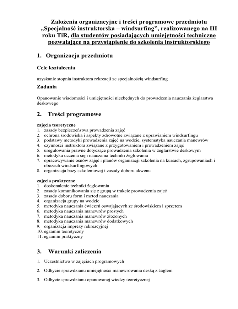 Założenia organizacyjne i treści programowe przedmiotu „Specjalność instruktorska – windsurfing”, realizowanego na III roku TiR, dla studentów posiadających umiejętności techniczne pozwalające na przystąpienie do szkolenia instruktorskiego 1. Organizacja przedmiotu Cele kształcenia uzyskanie stopnia instruktora rekreacji ze specjalnością windsurfing Zadania Opanowanie wiadomości i umiejętności niezbędnych do prowadzenia nauczania żeglarstwa deskowego 2. Treści programowe zajęcia teoretyczne 1. zasady bezpieczeństwa prowadzenia zajęć 2. ochrona środowiska i aspekty zdrowotne związane z uprawianiem windsurfingu 3. podstawy metodyki prowadzenia zajęć na wodzie, systematyka nauczania manewrów 4. czynności instruktora związane z przygotowaniem i prowadzeniem zajęć 5. uregulowania prawne dotyczące prowadzenia szkolenia w żeglarstwie deskowym 6. metodyka uczenia się i nauczania techniki żeglowania 7. opracowywanie osnów zajęć i planów organizacji szkolenia na kursach, zgrupowaniach i obozach windsurfingowych 8. organizacja bazy szkoleniowej i zasady doboru akwenu zajęcia praktyczne 1. doskonalenie techniki żeglowania 2. zasady komunikowania się z grupą w trakcie prowadzenia zajęć 3. zasady doboru form i metod nauczania 4. organizacja grupy na wodzie 5. metodyka nauczania ćwiczeń oswajających ze środowiskiem i sprzętem 6. metodyka nauczania manewrów prostych 7. metodyka nauczania manewrów złożonych 8. metodyka nauczania manewrów dodatkowych 9. organizacja imprezy rekreacyjnej 10. egzamin teoretyczny 11. egzamin praktyczny 3. Warunki zaliczenia 1. Uczestnictwo w zajęciach programowych 2. Odbycie sprawdzianu umiejętności manewrowania deską z żaglem 3. Odbycie sprawdzianu opanowanej wiedzy teoretycznej 4. Opracowanie konspektu i przeprowadzenie wykładu na zadany temat 5. Przygotowanie osnowy i przeprowadzenie zajęć praktycznych dotyczących nauczania zadanego manewru 4. 1. 2. 3. 4. 5. Literatura Gadacz L. i wsp. 2001, Vademecum żeglarza deskowego Deka Kraków Jankowiak P. 1983: Żeglowanie na desce, Sport i Turystyka, Warszawa Kalczyński L.1982 Żeglarstwo deskowe - nauczanie elementarne, skrypt WSP, Szczecin Marchaj C. 1970 Teoria żeglowania, Sport i Turystyka, Warszawa Parnicki F. 1996 Podstawy teorii i metodyki żeglarstwa deskowego, AWF Biała Podlaska