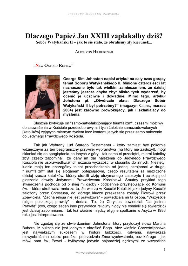 INSTYTUT DOBREGO PASTERZA Dlaczego Papież Jan XXIII zapłakałby dziś? Sobór Watykański II – jak to się stało, że obraliśmy zły kierunek... ALICE VON HILDEBRNAD „NEW OXFORD REVIEW” George Sim Johnston napisł artykuł na cały czas gorący temat Soboru Watykańskiego II. Minione czterdziesci lat naznaczone było tak wielkim zamieszaniem, że dzisiaj jesteśmy jeszcze chyba zbyt blisko tych wydarzeń, by ocenić je uczciwie i dokładnie. Mimo tego, artykuł Johstona pt. „Otwórzcie okna: Dlaczego Sobór Watykański II był potrzebny?” (magazyn CRISIS, marzec 2004) jest zarówno prowokujacy, jak i skłaniający do myślenia. Słusznie krytykuje on "samo-satysfakcjonujący triumfalizm", czasami możliwy do zauważenia w Kościele przedsoborowym, i tych żałośnie samozadowolonych [katolików] żyjących miernym życiem lecz kontentujących się przez samo należenie do Jedynego Prawdziwego Kościoła. Tak jak Wybrany Lud Starego Testamentu - który zamiast być pokornie wdzięcznym za ten bezgraniczny przywilej wybraństwa (na który nie zasłużył), mógł skłaniać się do spoglądania na innych z góry - tak samo ci przeciętni, mierni katolicy zbyt często zapominali, że dany im dar należenia do Jedynego Prawdziwego Kościoła nie usprawiedliwiał ich uczucia wyższości w stosunku do innych. Niestety, ludzie mają ten szczególny talent przechodzenia od jednej skrajności w drugą. "Triumfalizm" stał się sloganem potępiającym, czego rezultatem są niezliczone dzisiaj rzesze katolików, którzy stracili wizję otrzymanego zaszczytu i uciekają od głoszenia chwały Jedynemu Prawdziwemu Kościołowi. Smutny przykład tego stwierdzenia pochodzi od bliskiej mi osoby - codziennie przystępującej do Komunii św. - która strofowała mnie za to, że wierzę w Kościół Katolicki jako jedyny Kościół założony przez Chrystusa, do którego klucze przekazane zostały Piotrowi przez Zbawiciela. "Żadna religia nie jest prawdziwa" - powiedziała mi ta osoba. "Wszystkie religie poszukują prawdy" - dodała. To, że Chrystus powiedział: "Ja jestem Prawdą" (coś, czego żaden inny przywódca religijny nigdy nie ośmielił się stwierdzić) jest dzisiaj zapomniane. I tak też właśnie międzyreligijne spotkanie w Asyżu w 1986 roku jest interpretowane. Nie zgodzę się ze stwierdzeniem Johnstona, który przytoczył słowa Martina Bubera, iż sukces nie jest jednym z określeń Boga. Ależ właśnie Chrześcijaństwo jest największym sukcesem w historii ludzkości. Kalwaria, największa niewyobrażalna ludzka porażka, poprzedzała Zmartwychwstanie, bez którego - jak mówi nam św. Paweł - bylibyśmy jedynie najbardziej nędznymi ze wszystkich www. www.pastorbonus.pl pastorbonus.pl 1 INSTYTUT DOBREGO PASTERZA stworzeń. Budzi zdziwienie, że w swojej odpowiedzi na krytycyzm wobec przytoczenia stwierdzenia Bubera, Johnston mówi, że Kalwaria "była momentem definiującym Chrześcijaństwo". Ale nic nie wspomina on o Zmartwychwstaniu! Patrząc z daleka na historię chrześcijan, widzimy, że jest ona nieustannymi ludzkimi porażkami, które poprzedzają wspaniałe supernaturalne zwycięstwa. Św. Paweł wyraził tę prawdę w swoim Drugim Liście do Koryntian: „znosimy cierpienia, lecz nie poddajemy się zwątpieniu [...] obalają nas na ziemię, lecz nie giniemy." (4:8-9). To jest niewątpliwie sukces, ale sukces ten może wyjaśnić tylko sam Bóg. Johnston mówi nam, że papież Jan XXIII chciał wyciągnąć Kościół ze swej „Trydenckiej skorupy”, aby aktywnie zaangażować się we współczesny świat. Ale to właśnie Sobór Trydencki przyniół największy plon świętych i największy urodzaj zgromadzeń religijnych, utworzonych z intencją, by roznosić światło Ewangelii światu, czy to poprzez kontemplacyjne życie zakonne czy aktywne zaangażowanie. Św. Franciszek Salezy, św. Jeanne Francoise d'Ars, św. Jan Bosco (jeden z największych nauczycieli wszystkich czasów), św. Teresa z Lisieux (apostoł misji) byli właśnie odżywiani tą „skorupą” Soboru Trydenckiego. Johnston pisze, że celem Soboru Watykańskiego II było otwarcie Kościoła na świat i że dzisiejszy posoborowy Kościół jest już „dla tego świata”. Ale samo słowo "świat" jest bardzo dwuznaczne. Kiedy ktoś czyta Ewangelię św. Jana, rozdział 14-16, to uderza go jak często słowo „świat” jest wymieniane. Chrystus mówi nam, że świat nienawidzi Go i że On nie z tego świata pochodzi. Mówi On swoim Apostołom, że tak jak świat nienawidzi Go, tak i ich nienawidzić będzie. Choćby przez to, że właśnie Szatan nazywany jest "księciem tego świata", nie można wymyślić wyraźniejszej przyczyny odrzucenia "tego świata". Ale jest też religijny i metafizyczny dualizm pomiędzy Bogiem a "Księciem tego świata" i ten dualizm będzie trwał aż do końca czasów, kiedy to Wielki Zły będzie pokonany. Ten, kto kocha Chrystusa, musi nienawidzić świata ze swoją pompą, ponieważ świat jest królestwem szatana. Podczas chrztu zobowiązani jesteśmy do odrzucenia tego świata. Papież Paweł VI lamentował, że „otwarcie [Kościoła po Soborze Watykańskim II] na świat, przyczyniło się do faktycznej inwazji Kościoła przez myślenie pochodzące z tego świata” (23 listopada 1973 roku) Słowo "świat" ma także i inne znaczenie. Odnosi się do świata, które Bóg stworzył z niczego: widzialny świat, który odzwierciedla piękno Boga, świat zamieszkany przez Jego dzieci, miejsce gdzie albo osiągną one swój cel, albo daną im boską misję zdradzą. To, że Chrześcijanin powinien aktywnie zaangażować się w ten świat, wynika z Chrystusowego zawołania: „Idźcie i nauczajcie wszystkie narody.” Prawdziwie odnosi się to także do tych, którzy wezwani są do czysto kontemplacyjnego życia - nie uciekającego jednak do zapomnienia o tym świecie życia modlitwą, ofiarą, pokutą za braci ze świata. Niestety, od czasu Soboru Watyka
