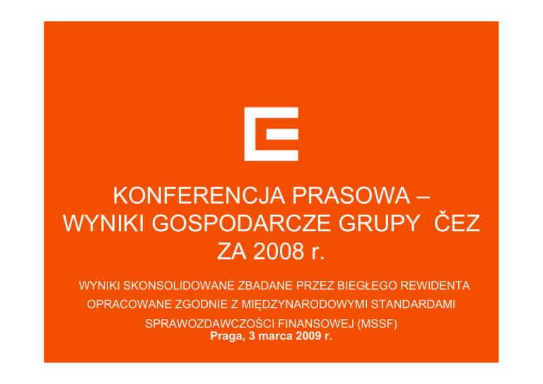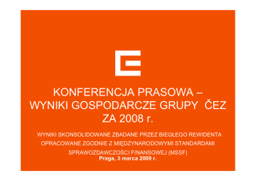KONFERENCJA PRASOWA – WYNIKI GOSPODARCZE GRUPY ČEZ ZA 2008 r. WYNIKI SKONSOLIDOWANE ZBADANE PRZEZ BIEGŁEGO REWIDENTA OPRACOWANE ZGODNIE Z MIĘDZYNARODOWYMI STANDARDAMI SPRAWOZDAWCZOŚCI FINANSOWEJ (MSSF) Praga, 3 marca 2009 r. PROGRAM Główne wyniki i wydarzenia w Grupie ČEZ w 2008 r. Martin Roman, Dyrektor Generalny Wyniki gospodarcze Martin Novák, Dyrektor Pionu Finansowego Pozycja handlowa Grupy ČEZ Michal Skalka, Dyrektor Odcinka Tradingu 1 GŁÓWNE WYNIKI W 2008 r. I OCZEKIWANIA DOTYCZĄCE WYNIKÓW W 2009 r. Zysk operacyjny przed amortyzacją (EBITDA) wzrósł w stosunku do ubiegłego roku o 16 % (o 11,9 mld CZK), osiągając 87,2 miliarda CZK. Zysk operacyjny (EBIT) wzrósł w stosunku ubiegłego roku o 22 % (o 12,0 mld CZK) do 65,2 miliarda CZK. Zysk netto wzrósł w stosunku do ubiegłego roku o 11 % (o 4,6 mld CZK), osiągając 47,4 miliarda CZK. Rentowność kapitału własnego wzrosła w stosunku do ubiegłego roku z 22,7 % do 27,0 %. Cena akcji na BCPP oraz GPW na dzień 27.2.2009 r. wynosiła 670,80 CZK. W 2009 r. oczekuje się EBITDA w wysokości 90,3 miliarda CZK (wzrost o 8 % w porównaniu z 2008 r.), oczekiwany zysk netto wynosi 50,2 miliarda CZK (wzrost o 6 % w porównaniu z 2008 r.). 2 POMIMO KRYZYSU FINANSOWEGO UDAŁO NAM SIĘ WYPRACOWAĆ ZYSK NETTO ZGODNY Z OCZEKIWANIAMI mld CZK EBITDA 100 90 80 70 60 50 40 30 20 10 0 + 16 % 75,3 2007 87,2 87,0 E2008 2008 + 23 % 70 60 50 40 EBIT 30 20 53,2 65,0 65,2 E2008 2008 10 0 2007 + 11 % 60 ZYSK NETTO 50 40 30 20 42,8 48,6 47,4 2007 E2008 2008 10 0 Pozytywne działania… optymalizacja konserwacji oraz oszczędności w zakresie innych kosztów operacyjnych pozytywny wpływ celnej strategii sprzedaży energii elektrycznej oraz obrotu towarami (tradingu), który został wyeliminowany przez spadek cen hurtowych pod koniec roku nieduży wzrost produkcji w elektrowniach jądrowych Grupy ČEZ …kompensują negatywne oddziaływania na poziomie zysku operacyjnego… awaria w I bloku elektrowni jądrowej Temelín w IV kwartale negatywny wpływ związany z umacnianiem się kursu korony czeskiej w 2008 r. (który jednak udało się w większej części wyeliminować dzięki dobrej strategii zabezpieczeń) …jednak na zysk netto rzutuje zastosowanie nowych zasad MSSF (jednorazowa amortyzacja przy rekultywacji) konserwatywna wycena zakupu akcji i należności wobec spółki MOL zwiększenie zysku netto za 2007 r. o ok. 3 miliardy CZK w wyniku oddziaływań nadzwyczajnych w postaci zmiany stawki stosowanej w obliczeniach podatku odroczonego 3 ZYSK NETTO GRUPY ČEZ KSZTAŁTUJE SIĘ ODPOWIEDNIO DO INWESTYCJI WNIESIONYCH PRZEZ SKARB PAŃSTWA REPUBLIKI CZESKIEJ I AKCJONARIUSZY Zysk netto j ako % aktywów (2 0 0 7 r .) T-M obil e ČR Škoda Auto O KD Gr upa ČEZ 20 0 8 Sokol ovska uhel ná Phil ip M or r is CR Tel efonica O 2 ČR 0% 10% Źródło: ČEZ, raporty roczne poszczególnych spółek 20% 3 0% 4 FILAR STRATEGICZNY – PROGRAM PT. "EFEKTYWNOŚĆ“, ZORIENTOWANY NA PODNOSZENIE NASZEJ EFEKTYWNOŚCI WEWNĘTRZNEJ, PRZYNOSI PIERWSZE REZULTATY Obszary docelowe programu pt. „Efektywność“: Rezultaty osiągnięte w 2008 r.: szczupła struktura organizacyjna centrali obniżenie kosztów ogólnego zarządu w centrali nowy dostawca usług ICT (fuzja ČEZnet i ČEZData) wprowadzenie odczytów liczników co 3 miesiące w Bułgarii centrum usług współdzielonych w Polsce większa moc i skrócenie odstawienia elektrowni większa efektywność działalności operacyjnej i inwestycyjnej koncentracja na czynnościach zasadniczych (core) lepsze parametry produkcji Korzyści wynikające z programu pt. "Efektywność“: Wzrost EBITDA Dukovany 24,0 25,6 2012 2013 18,8 [mld CZK] 13,2 7,3 3,7 Udział programu w EBITDA w 2008 r. 3,7 mld CZK 2008 2009 2010 2011 Za punkt wyjścia przyjęto 2006 r. 5 AKCJE ČEZ, A. S. W DNIU 27.2.2009 r. ZAMKNĘŁY SIĘ NA 670,80 CZK 150% 10. 12. 2007 1 423 CZK 130% 02. 01. 2007 27. 2. 2009 991 CZK 670,80 CZK 110% 90% 70% 27. 10. 2008 581 CZK 50% 30% 07 07 07 07 07 07 07 07 07 07 07 07 08 08 08 08 08 08 08 08 08 08 08 08 09 09 20 20 20 20 j 20 20 20 20 20 20 20 20 20 20 20 20 j 20 20 20 20 20 20 20 20 20 20 ń ty c ń a ń ty c ń a ń ty c c ń ń ik d ń c c ń ń ik d ń ze lu rze cie m wie ipie pie sie rn pa zie cze lu rze cie m wie ipie pie sie rn pa zie cze lu c o o e e r r d d l a l a e r e e e r i i t t y e z e z ty ty e e m wi m wi st si wr źdz lis gru s si wr źdz lis gru s k cz k cz a a p p Bloomberg Utilities Index PX ČEZ, a. s. 6 W 2008 r. GRUPA ČEZ POCZYNIŁA DOTYCHCZAS NAJWIĘKSZE POSTĘPY W ZAKRESIE EKSPANSJI ZAGRANICZNEJ Najważniejsze zagraniczne projekty Grupy ČEZ zapoczątkowane w 2008 r. Budowa nowej elektrowni jądrowej w miejscowości Jaslovské Bohunice na Słowacji. Budowa największego parku elektrowni wiatrowych w Europie – Fântânele i Cogealac w Rumunii (600 MW). Wejście na rynek turecki – zrealizowano akwizycję tureckiego przedsiębiorstwa dystrybucyjnego SEDAŞ i nawiązano partnerstwo z turecką Grupą Akkök (przystąpienie do spółki Akenerji). Zgodnie z planem kontynuowane są projekty wspólnego przedsiębiorstwa z Grupą MOL. Projekt budowy elektrowni gazowej w Galaţi w Rumunii. Inne projekty (np. trwają negocjacje dotyczące kontynuacji budowy bloków nr III i IV elektrowni jądrowej Cernavodă, udziały mniejszościowe w Skawinie lub dystrybucja w Albanii). Aktywa energetyczne Działalność handlowa Kraje, którymi interesujemy się warunkowo Aktywne jednostki zależne W 2009 r. będziemy konsolidować swoje pozycje, skoncentrujemy się (ale nie tylko) na rozwoju działalności w krajach, w których posiadamy już aktywa W dalszym ciągu będziemy starannie wybierali spośród projektów te, które wiążą się z przyrostem wartości dla naszych inwestorów. Skoncentrujemy się na regionie Europy Środkowej i PołudniowoWschodniej, szczególnie na krajach, w których działamy już obecnie. Odchodzimy od monitoringu regionów związanych z naszym obszarem docel