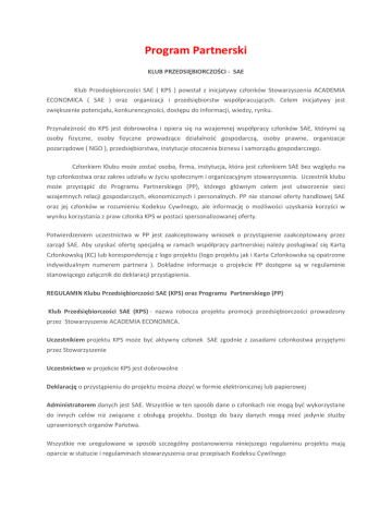 Program Partnerski KLUB PRZEDSIĘBIORCZOŚCI - SAE Klub Przedsiębiorczości SAE ( KPS ) powstał z inicjatywy członków Stowarzyszenia ACADEMIA ECONOMICA ( SAE ) oraz organizacji i przedsiębiorstw współpracujących. Celem inicjatywy jest zwiększenie potencjału, konkurencyjności, dostępu do informacji, wiedzy, rynku. Przynależność do KPS jest dobrowolna i opiera się na wzajemnej współpracy członków SAE, którymi są osoby fizyczne, osoby fizyczne prowadzące działalność gospodarczą, osoby prawne, organizacje pozarządowe ( NGO ), przedsiębiorstwa, instytucje otoczenia biznesu i samorządu gospodarczego. Członkiem Klubu może zostać osoba, firma, instytucja, która jest członkiem SAE bez względu na typ członkostwa oraz zakres udziału w życiu społecznym i organizacyjnym stowarzyszenia. Uczestnik klubu może przystąpić do Programu Partnerskiego (PP), którego głównym celem jest utworzenie sieci wzajemnych relacji gospodarczych, ekonomicznych i personalnych. PP nie stanowi oferty handlowej SAE oraz jej członków w rozumieniu Kodeksu Cywilnego, ale informację o możliwości uzyskania korzyści w wyniku korzystania z praw członka KPS w postaci spersonalizowanej oferty. Potwierdzeniem uczestnictwa w PP jest zaakceptowany wniosek o przystąpienie zaakceptowany przez zarząd SAE. Aby uzyskać ofertę specjalną w ramach współpracy partnerskiej należy posługiwać się Kartą Członkowską (KC) lub korespondencją z logo projektu (logo projektu jak i Karta Członkowska są opatrzone indywidualnym numerem partnera ). Dokładne informacje o projekcie PP dostępne są w regulaminie stanowiącego załącznik do deklaracji przystąpienia. REGULAMIN Klubu Przedsiębiorczości SAE (KPS) oraz Programu Partnerskiego (PP) Klub Przedsiębiorczości SAE (KPS) - nazwa robocza projektu promocji przedsiębiorczości prowadzony przez Stowarzyszenie ACADEMIA ECONOMICA. Uczestnikiem projektu KPS może być aktywny członek SAE zgodnie z zasadami członkostwa przyjętymi przez Stowarzyszenie Uczestnictwo w projekcie KPS jest dobrowolne Deklarację o przystąpieniu do projektu można złożyć w formie elektronicznej lub papierowej Administratorem danych jest SAE. Wszystkie w ten sposób dane o członkach nie mogą być wykorzystane do innych celów niż związane z obsługą projektu. Dostęp do bazy danych mogą mieć jedynie służby uprawnionych organów Państwa. Wszystkie nie uregulowane w sposób szczególny postanowienia niniejszego regulaminu projektu mają oparcie w statucie i regulaminach stowarzyszenia oraz przepisach Kodeksu Cywilnego Operator PP - Operatorem Programu Partnerskiego jest Stowarzyszenie ACADEMIA ECONOMICA Organizator PP - Organizatorem Programu Partnerskiego jest Stowarzyszenie ACADEMIA ECONOMICA Partner - Członek Stowarzyszenia ACADEMIA ECONOMICA, który jest uczestnikiem programu na podstawie zatwierdzonej przez zarząd SAE deklaracji przystąpienia. Karta Członkowska (KC) - plastikowa karta, zawierająca na awersie: numer ewidencyjny karty / uczestnika projektu, Logo Projektu, oraz opcjonalnie na rewersie: wyciąg z regulaminu oraz podpis członka. Właścicielem karty jest operator. Koszt wydruku i produkcji karty ponosi użytkownik karty. Aktualny cennik znajduje się na stronie internetowej projektu. Wydruk i dystrybucja kart nie ma charakteru działalności gospodarczej w celach zarobkowych. Logo Projektu (LP): Indywidualny znak graficzny projektu, który umieszczany jest na dokumentach i elementach ruchomości i nieruchomości uczestników projektu. Użytkowanie w korespondencji LP musi być opatrzone indywidualnym numerem ewidencyjnym uczestnika projektu. Preferencyjne warunki dla uczestników projektu umieszczane w materiałach informacyjnych i promocyjnych mają charakter poglądowy i nie stanowią oferty handlowej w rozumieniu Kodeksu Cywilnego. Unikanie stosowania przez partnerów stawek preferencyjnych w ofertach może spowodować wykluczenie z programu na mocy uchwały Zarządu SAE. W przypadku korzystania z ofert promocyjnych lub preferencyjnych nadrzędnym jest regulamin wewnętrzny partnera PP. Informacje: wszystkie informacje dotyczące KPS i PP oraz partnerów, a także informacje promocyjne umieszczane będą na stronach projektu: www.saeplock.pl. Dodatkowo mogą być publikowane na stronach partnerów, portali i innych środków masowego przekazu o ile będą to panele bezpłatne. Partnerzy mają prawo do używania LP zgodnie z jego charakterem i przeznaczeniem. LP może być eksponowane na witrynach punktów handlowo usługowych uczestników projektu lub innych miejscach eksponujących LP. Wydruk i dystrybucja wydruków LP nie ma charakteru działalności gospodarczej w celach zarobkowych. Wszystkie działania partnerów powinny opierać się o wzajemne zaufanie, chęć pomocy, wymianę doświadczeń, budowanie odpowiedzialnego i etycznego biznesu. Efektem współpracy powinna być integracja środowiska wszystkich sektorów życia społeczno gospodarczego. Organizator zastrzega sobie prawo do zmiany warunków niniejszego regulaminu. Wszelkie informacje na temat zmian dostępne będą na stronie internetowej projektu. Tym samy każdemu uczestnikowi projektu przysługuje prawo do rezygnacji w PP. Po rezygnacji lub zakończeniu projektu należy zdać wszystkie otrzymane karty, materiały promocyjne oraz usunąć LP i związane z PP informacje ze stron internetowych i wszystkich innych nośników informacji. Koszty: Przystąpienie do projektu - bezpłatne Składki członkowskie - zgodnie z decyzją Zarządu, w zależności od typu członkostwa Publikacja na stronach projektu - bezpłatna Karta Plastikowa - 10 zł Naklejka 150 x 150 mm - 3 zł Naklejka 200 x 200 mm - 4 zł Naklejka 100 x 50 mm - 2 zł