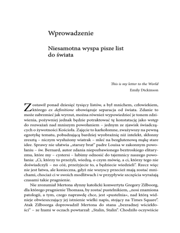 WPROWADZENIE 7 Wprowadzenie Niesamotna wyspa pisze list do świata This is my letter to the World Emily Dickinson Z ostawił ponad dziesięć tysięcy listów, a był mnichem, człowiekiem, którego ex definitione obowiązuje separacja od świata. Zdanie to może zabrzmieć jak wyrzut, można również wypowiedzieć je tonem zdziwienia, pożywniej jednak będzie potraktować tę konstatację jako wstęp do rozważań nad mniszym powołaniem – jednym ze zjawisk świadczących o żywotności Kościoła. Zajęcie to karkołomne, zważywszy na pewną egzotykę tematu, pobudzającą bardziej wyobraźnię niż intelekt, skłonny zresztą – niczym wysłużony wiatrak – mleć na bezglutenową mąkę stare idee. Sprawy nie ułatwia „starszy brat” padre Louisa w zakonnym powołaniu – św. Bernard, autor zdania niepozbawionego beztroskiego elitaryzmu, które my – cystersi – lubimy odnosić do tajemnicy naszego powołania: „Ci, którzy to przeżyli, wiedzą, o czym mówię, a ci, którzy tego nie doświadczyli – no cóż, przeżyjecie to, a będziecie wiedzieli”. Rzecz więc nie jest łatwa, ale konieczna, gdyż nie wszyscy przecież mają zostać mnichami, chociaż ci w swoich modlitwach i w przypływie szczęścia wyrażają czasami takie pragnienie. Nie zrozumiał Mertona słynny katolicki konwertyta Gregory Zilboorg, dla którego pragnienie Thomasa, by zostać pustelnikiem, „nosi znamiona patologii, a tym, czego naprawdę chce, jest »pustelnia«, nad którą widnieje obwieszczający jej istnienie wielki napis, stojący na Times Square”. Atak Zilboorga doprowadził Mertona do stanu „bezradnej wściekłości” – ze łzami w oczach powtarzał: „Stalin, Stalin”. Chodziło oczywiście 8 WPROWADZENIE o Zilboorga i jego metody „przyjaznego sporu”. Biorąc poprawkę na melodramatyczne skłonności Mertonowskiego ducha, reakcja ojca Louisa odzwierciedla nie tyle beznadziejność każdej próby zakomunikowania innym, co się dzieje w sercu mnicha (był przecież człowiekiem otwartym i miał świetne pióro), co niemoc przebijania się przez ekran edukacyjny, chroniący pewien gatunek ludzi gotowych odebrać ostatnią iskrę życia Tradycji i w odwoływaniach się do początków monastycyzmu (a także Kościoła) odrzucających absolutnie jakiekolwiek napomnienia ze strony socjologii, nie wspominając już o teologii. Nie bardzo wiem, jak ludzie z ideowej rodziny Zilboorga radzą sobie choćby z historią powstania cystersów, ale mogę przypuszczać, że radzą sobie jak najgorzej. Bo przecież cystersi, dziś szacowni mnisi, uważający dominikanów i jezuitów za „nowe, rewolucyjne wspólnoty”, sami niegdyś wystąpili przeciwko uświęconym wielowiekową praktyką mniszym zwyczajom, zwyczajom – jak uważano nawet – wyrażającym tożsamość tego powołania. Chodziło o życie – i to nie tylko klasztornych społeczności, ale i całej feudalnej konstrukcji. Proponowali bowiem coś, co – z pewnymi niuansami – współcześni im klerkowie, wyprzedzając nieco czas, mogliby określić jako reklamującą się na Times Square pustelnię – a właściwie świetnie prosperujący duchowo i ekonomicznie archipelag pustelni, bo w chwili śmierci św. Bernarda było ich już trzysta! Nie należy więc lekko traktować polemicznych pism kursujących z Cluny do Clairvaux, bo gęste były od zarzutów zdrady, te zaś nadchodzące z cysterskich dolin były odważne w reinterpretacji mniszego vocatio, ale wciąż jeszcze nie posiadały ciężaru udanego doświadczenia, bo do tego zawsze potrzebny jest czas. I choć odwoływały się do wzorów („integralnych” i „czystych”) z Reguły św. Benedykta, musiały bronić raczej eksperymentu en course, narażając się na celne i dowcipne ciosy historyków epoki oraz „czarnych mnichów”, bo ci „białych” podziwiali, ale i punktowali bezlitośnie: „biali mnisi porzucili duchowe zajęcie pasterzy na rzecz fizycznej pracy pastuchów. […] W dobrach cysterskich słychać dzwonienie tak licznych owiec, baranów, wołów i krów, że człowiek aż jest przerażony tym hałasem” – cystersi bowiem, rezygnując z donacji, a co za tym idzie zależności od możnych tego świata, próbowali zarabiać na życie pracą własnych rąk. O św. Bernardzie mówiło się nawet, że „przekształcił mnichów w kopaczy i przewoźników gnoju”. Prawdziwie mentalną rewolucją była praca fizyczna mnichów z rycerskich rodów (gdyby ówczesny WPROWADZENIE 9 świat znał to słowo, określiłby to niewątpliwie mianem patologii): „Kiedy ich widzę w ogrodzie z motyką, na łące z widłami albo grabiami, w polu z sierpem, w lesie z siekierą i w jeszcze innych miejscach przy innych pracach, gdy pomyślę, czym byli, i rozważę ich obecną sytuację, pracę, narzędzia, podłe szaty, nędzną osobę, wydają mi się nie ludźmi, lecz rasą szaleńców, niemych i pozbawionych języka, zakałą ludzkości i wzgardą ludu. Ale zdrowy rozsądek podpowiada mi, że ich życie w Chrystusie jest ukryte w niebie”. Wprawne oko historyka rozpozna w tym cytacie nie ironiczny dokument „czarnych” komentatorów epoki, ale fragment listu szlachcica Pierre’a z Roye, nowicjusza cysterskiego z czasów św. Bernarda. Wystarczy jednak odrzucić ostatnie, apologetyczne zdanie, żeby otrzymać nieprzyjazną klasykę wypowiedzi o cystersach tamtych czasów. Ale to nie wszystko: „Kiedy tylko zaczyna się wiosna, w całej krainie widać bociany zmierzające do Citeaux” (to o bardzo licznych podróżach opatów cysterskich odzianych przepisowo w białe kukulle, zobowiązanych udawać się corocznie na kapitułę generalną do Citeaux, przypominającą w obradach nowoczesny parlament). Wisienką na torcie są opinie o fundatorach Citeaux, którym delikatnie przypisywano „niespokojność i niestałość ducha”, gdyż próbowali pogodzić pragnienie życia w samotności z życiem wspólnotowym. Jeśli pragnienia można dziedzicz