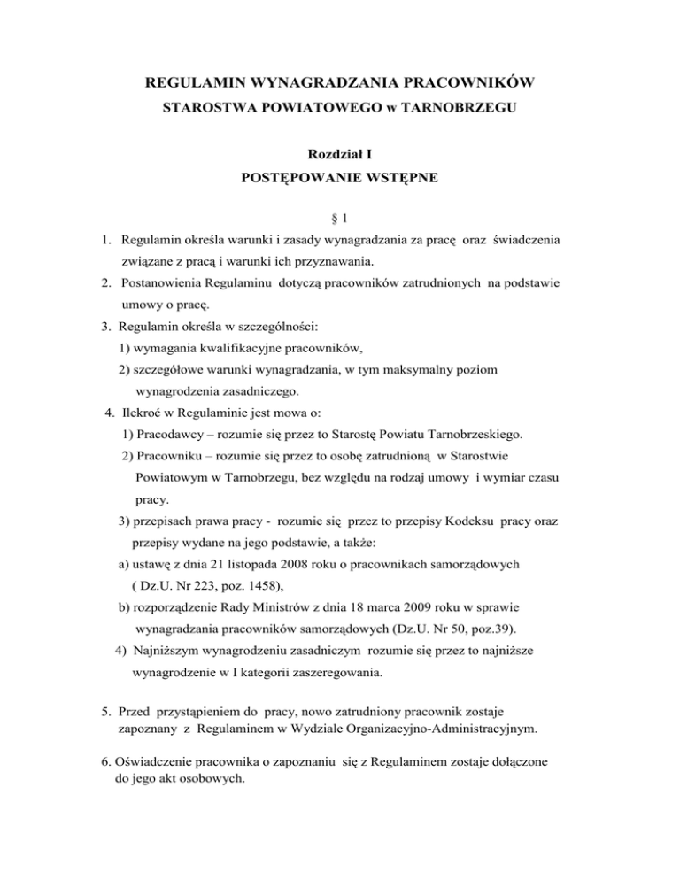 REGULAMIN WYNAGRADZANIA PRACOWNIKÓW STAROSTWA POWIATOWEGO w TARNOBRZEGU Rozdział I POSTĘPOWANIE WSTĘPNE §1 1. Regulamin określa warunki i zasady wynagradzania za pracę oraz świadczenia związane z pracą i warunki ich przyznawania. 2. Postanowienia Regulaminu dotyczą pracowników zatrudnionych na podstawie umowy o pracę. 3. Regulamin określa w szczególności: 1) wymagania kwalifikacyjne pracowników, 2) szczegółowe warunki wynagradzania, w tym maksymalny poziom wynagrodzenia zasadniczego. 4. Ilekroć w Regulaminie jest mowa o: 1) Pracodawcy – rozumie się przez to Starostę Powiatu Tarnobrzeskiego. 2) Pracowniku – rozumie się przez to osobę zatrudnioną w Starostwie Powiatowym w Tarnobrzegu, bez względu na rodzaj umowy i wymiar czasu pracy. 3) przepisach prawa pracy - rozumie się przez to przepisy Kodeksu pracy oraz przepisy wydane na jego podstawie, a takŜe: a) ustawę z dnia 21 listopada 2008 roku o pracownikach samorządowych ( Dz.U. Nr 223, poz. 1458), b) rozporządzenie Rady Ministrów z dnia 18 marca 2009 roku w sprawie wynagradzania pracowników samorządowych (Dz.U. Nr 50, poz.39). 4) NajniŜszym wynagrodzeniu zasadniczym rozumie się przez to najniŜsze wynagrodzenie w I kategorii zaszeregowania. 5. Przed przystąpieniem do pracy, nowo zatrudniony pracownik zostaje zapoznany z Regulaminem w Wydziale Organizacyjno-Administracyjnym. 6. Oświadczenie pracownika o zapoznaniu się z Regulaminem zostaje dołączone do jego akt osobowych. Rozdział II PRZEPISY OGÓLNE §2 Wynagrodzenie za pracę ustala się miedzy Pracodawcą a Pracownikiem w wysokości odpowiadającej rodzajowi wykonywanej pracy, stosownie do zajmowanego przez Pracownika stanowiska oraz posiadanych kwalifikacji zawodowych. §3 1. Wynagrodzenie przysługuje tylko za pracę wykonaną. Za czas niewykonywania pracy Pracownik zachowuje prawo do wynagrodzenia tylko wówczas, gdy przepisy prawa pracy oraz niniejszego Regulaminu tak stanowią. 2. W przypadku zawieszenia stosunku pracy z powodu tymczasowego aresztowania, wysokość naleŜnego Pracownikowi wynagrodzenia ulega zmniejszeniu do połowy wynagrodzenia przysługującego Pracownikowi do dnia tymczasowego aresztowania. Wysokość wypłaconego w tym czasie wynagrodzenia zostaje wyrównana z chwilą umorzenia postępowania karnego albo wydania wyroku uniewinniającego. Pracownik nie ma roszczenia o przedmiotowe wyrównanie wynagrodzenia w przypadku warunkowego umorzenia postępowania karnego. §4 Pracownikowi zatrudnionemu w niepełnym wymiarze czasu pracy przysługuje wynagrodzenie zasadnicze i inne składniki wynagrodzenia w wysokości proporcjonalnej do wymiaru czasu pracy, ustalonego w umowie o pracę. Rozdział III WYNAGRODZENIE ZA PRACĘ §5 1. W Starostwie Powiatowym w Tarnobrzegu obowiązuje czasowy system wynagradzania, polegający na ustaleniu dla poszczególnych pracowników kategorii zaszeregowania, stawek wynagrodzenia zasadniczego, oraz dodatku funkcyjnego i dodatku specjalnego. 2. Podstawą ustalania zaszeregowania pracownika są: 1) tabela maksymalnych kwot wynagrodzenia zasadniczego dla pracowników samorządowych zatrudnionych na podstawie umowy o pracę, stanowiąca Załącznik nr 1 do Regulaminu, 2) tabela procentowych stawek dodatku funkcyjnego, stanowiąca Załącznik nr 2 do Regulaminu, 3) tabela stanowisk, zaszeregowania i kwalifikacji pracowników zatrudnionych w Starostwie Powiatowym w Tarnobrzegu, stanowiąca załącznik nr 3 do Regulaminu. § 6. wynagrodzenie zasadnicze 1. Decyzję o zastosowaniu dla danego pracownika stawki osobistego zaszeregowania podejmuje Pracodawca. 2. Wynagrodzenie zasadnicze ustala się z uwzględnieniem kategorii zaszeregowania obowiązującej na zajmowanym stanowisku pracy. 3. Zmiana wysokości wynagrodzenia zasadniczego moŜe nastąpić w związku: 1) ze zmianą stanowiska pracy, 2) z istotną zmianą zakresu obowiązków na zajmowanym stanowisku, 3) z aktualizacją stawek wynagrodzeń zasadniczych w tabeli płac, 4) ze zmianą przepisów ogólnie obowiązujących. 4. W uzasadnionych przypadkach Pracodawca moŜe skrócić Pracownikowi okres pracy zawodowej wymagany na danym stanowisku, z wyłączeniem stanowisk, dla których wymagany okres pracy zawodowej określają odrębne przepisy oraz art.5 ust.2 art. 6 ust. 4 ustawy z dnia 21 listopada 2008 r. o pracownikach samorządowych. 5. Pracownicy, którzy w dniu wejścia w Ŝycie regulaminu nie posiadają wymaganych kwalifikacji w zakresie wykształcenia, zachowują dotychczas zajmowane stanowisko i mogą być przeszeregowani tylko w ramach tego stanowiska. §7 Dodatek za wieloletnia pracę 1. Pracownikom przysługuje dodatek za wieloletnią pracę. 2. Dodatek za wieloletnią pracę wynosi 5 % miesięcznego wynagrodzenia zasadniczego po pięciu latach pracy i wzrasta o 1 % za kaŜdy dalszy rok pracy aŜ do osiągnięcia 20 % miesięcznego wynagrodzenia zasadniczego. 3. Do okresów pracy uprawniających do dodatku wlicza się wszystkie poprzednie zakończone okresy zatrudnienia oraz inne okresy, jeŜeli z mocy odrębnych przepisów podlegają one wliczeniu do okresu pracy, od którego zaleŜą uprawnienia pracownicze. 4. Do okresu pracy uprawniającego do dodatku zalicza się równieŜ następujące okresy nie świadczenia pracy: a) okres przebywania na urlopie wychowawczym, b) okres pobierania zasiłku dla bezrobotnych oraz stypendiów zgodnie z ustawą o promocji zatrudnienia i instytucjach rynku pracy, c) okres pracy w gospodarstwie rolnym na podstawie ustawy o wliczaniu okresów pracy w indywidualnym gospodarstwie rolnym do pracowniczego staŜu pracy. 5. W przypadku gdy praca stanowi dodatkowe zatrudnienie, prawo do dodatku ustala się odrębnie dla kaŜdego stosunku pracy. Do okresu dodatkowego zatrudnienia nie zalicza się okresu zatrudnienia podstawowego. 6. Pracownikowi, który wykonuje pracę w Starostwie w ramach urlopu bezpłatnego udzielonego przez Pracodawcę w celu wykonywania tej pracy, do okresu dodatkowego zatrudnienia podlegają 