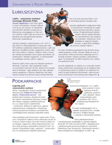 CIEKAWOSTKI Z POLSKI WSCHODNIEJ LUBELSZCZYZNA Lublin – wizytówka wielokulturowego Wschodu Polski niej w UE oraz promocji Polski i Unii za wschodnią granicą naszego kraju. Jarmark Jagielloński w tym roku zaprosi swych entuzjastów i nowych odkrywców już po raz czwarty. To najważniejsza kulturalna atrakcja turystyczna Lubelszczyzny, przyciągająca co roku rzesze turystów. Lublin staje się centrum regionalnej oraz transgranicznej wymiany kulturowej i gospodarczej. Jarmark Jagielloński to połączenie tradycji historycznych Jarmarków ze współczesną wymianą kulturalną i gospodarczą. W pięciodniowych prezentacjach oferuje wyroby rękodzieła i rzemieślnictwa oraz wydarzenia kulturalne i artystyczne, firmy działające w regionie transgranicznym, a także NGO działające dla rozwoju turystyki regionu. Jarmarki Lubelskie, organizowane w XV i XVI w. były sławne w Rzeczpospolitej i Europie jako wielkie handlowe wydarzenia międzynarodowe. Lublin był głównym ośrodkiem handlu: węgierskim winem, zbożem oraz wołami z Ukrainy i Wołynia. Wraz z rozwojem handlu powstawało coraz więcej warsztatów rzemieślniczych i składów kupieckich, co doprowadziło do szybkiego rozwoju Lublina i regionu. W części handlowo-wystawienniczej Jarmarku biorą udział wystawcy z Polski, Ukrainy i Białorusi oraz innych państw. Podczas Jarmarku odbywają się m.in.: turnieje rycerskie i pokazy rytuałów z poprzednich epok. To wydarzenie nie tylko kupieckie, ale i platforma spotkania kultur. Obecnie Lublin znowu staje się miejscem spotkania Wschodu i Zachodu. Jako największe miasto na wschodnich krańcach UE jest „Bramą Unii Europejskiej na Wschód”. Jego zadaniem jest więc odbudowanie współpracy z Ukrainą i Białorusią. Jest także świetną okazją do promocji kultury Europy Wschod- Jarmark Jagielloński w Lublinie to w swej idei manifestacja odmienności wywodzącej się ze wspólnej historii, prezentacja kultury ze źródłem we wspólnym korzeniu Europy Środkowo-Wschodniej i całym jej społeczno-kulturowym oraz historycznym bogactwie. Źródło: http://www.rzeszow.pl/ Fot. Bogdan Szczupaj PODKARPACKIE Legendy pod rzeszowskim rynkiem historyczno-edukacyjna, m.in. repliki zbroi rycerskich, broni, wystawa ceramiki użytkowej, ceramicznych zabawek. Obraz rzeszowskiego rynku z przełomu XIX i XX w. przedstawiają fotografie blisko wejścia. Jedną z największych atrakcji turystycznych Rzeszowa jest Podziemna Trasa Turystyczna „Rzeszowskie piwnice”. Sieć podziemnych korytarzy, zbudowana przez lata rękami mieszkańców Rzeszowa, służyła jako sklepy, magazyny, zakłady produkcyjne, a w czasie wojen i kataklizmów – schronienie. Obecnie te tajemnicze, pięknie odrestaurowane, wzbogacone o ekspozycję historyczną piwnice świadczą o pomysłowości i przedsiębiorczości dawnych obywateli miasta. Trasa przebiega pod kamienicami i płytą rynku. Piwnicom i korytarzom nadano nazwy odnoszące się do ich funkcji w historii miasta. Na trasie można znaleźć liczne atrakcje i tajemnice; relikty średniowiecznych murów, ślady pożarów, pozostałości żelaznych krat i zawiasów, kilkusetletnie cegły „palcówki”, ukryte przejścia. Ich atrakcyjności dopełnia ekspozycja W latach sześćdziesiątych XX w. zapadła się powierzchnia i osiadły kamienice. Podjęto decyzję o ratowaniu rzeszowskiej starówki. Prace zabezpieczeniowe i rewaloryzacyjne przebiegały w czterech etapach, od lat 60. XX wieku do końca 2007 r. Zabezpieczone i odrestaurowane piwnice posłużyły do utworzenia Podziemnej Trasy Turystycznej „Rzeszowskie piwnice”, którą udostępniono zwiedzającym w 2001 r. 34 Nr 1 (2)/2010 CIEKAWOSTKI Z POLSKI WSCHODNIEJ ŚWIĘTOKRZYSKIE W muzeum można się nieźle bawić... Muzeum Zabawek i Zabawy działa w Kielcach od 1979 r. Najcenniejszą częścią zbiorów są zabawki historyczne, ale muzeum prezentuje też „zabawowe” wystawy stałe: Popołudniowa herbatka. Na babcinym strychu, Misie w lesie i czasowe, np.: Made in Poland – kultowe zabawki z PRL, Lalki z całego świata, Chorwackie tradycyjne zabawki dziecięce. bombonierki ze zdjęciami gwiazd kina, opakowania czekolad z ilustracjami Jana Szancera do baśni Andersena oraz reklamowe tablice i gadżety. Wśród zabawek z przeszłości można znaleźć lalki z XIX i XX w., żołnierzyki ołowiane, rzutnik na szklane przezrocza, pokoiki dla lalek z mebelkami, klocki. Najstarszym eksponatem w Muzeum jest niemiecka lalka woskowa z XVIII w. Made in Poland... plastikowe maskotki, misie o dziwnych kolorach i fakturze, lalki z małą ilością włosów, metalowe autka, kultowy rzutnik Ania z bajkami, drewniane klocki ABC... Atrakcją wystawy jest archiwalny dokument „Kronika spółdzielczości pracy” o spółdzielniach zabawkarskich. Po jego emisji w 1985 r. dzieci zasypały redakcję listami; prosiły o przysłanie zabawek, narzekały na ich brak w sklepach i kolejki... „Słodka” wystawa Czekoladowa mieszanka E. Wedla (do 31 maja 2010 r.) to nietypowe opakowania na słodycze Wedla, blaszane i kartonowe pudełka ozdobione ilustracjami Mai Berezowskiej, Zofii Stryjeńskiej, Andrzeja Heinricha i Karola Śliwki. A także Chorwackie tradycyjne zabawki dziecięce to część oferty etnograficznej Muzeum: klepaki, karuzelki, koniki, bryczki, zaprzęgi, meble dla lalek i drewniane fujarki przyjechały tu z Muzeum Etnograficznego w Zagrzebiu. WARMIŃSKO-MAZURSKIE Mrongoville Mrągowo jest znane na świecie od ponad 25 lat jako miasto Festiwalu Piknik Country. Na przełomie lipca i sierpnia każdego roku przybywają na Mazury rzesze miłośników tej muzyki, tradycji Dzikiego Zachodu i niepowtarzalnej atmosfery, panującej wtedy w mieście. Władze miasta i organizatorzy festiwalu zastanawiali się nad możliwością zatrzymania gości festiwalu na dłużej i uatrakcyjnienia ich pobytu w Mrągowie. Tak zrodził się pomysł budowy miasteczka westernowego, promującego muzykę country i poszerzającego