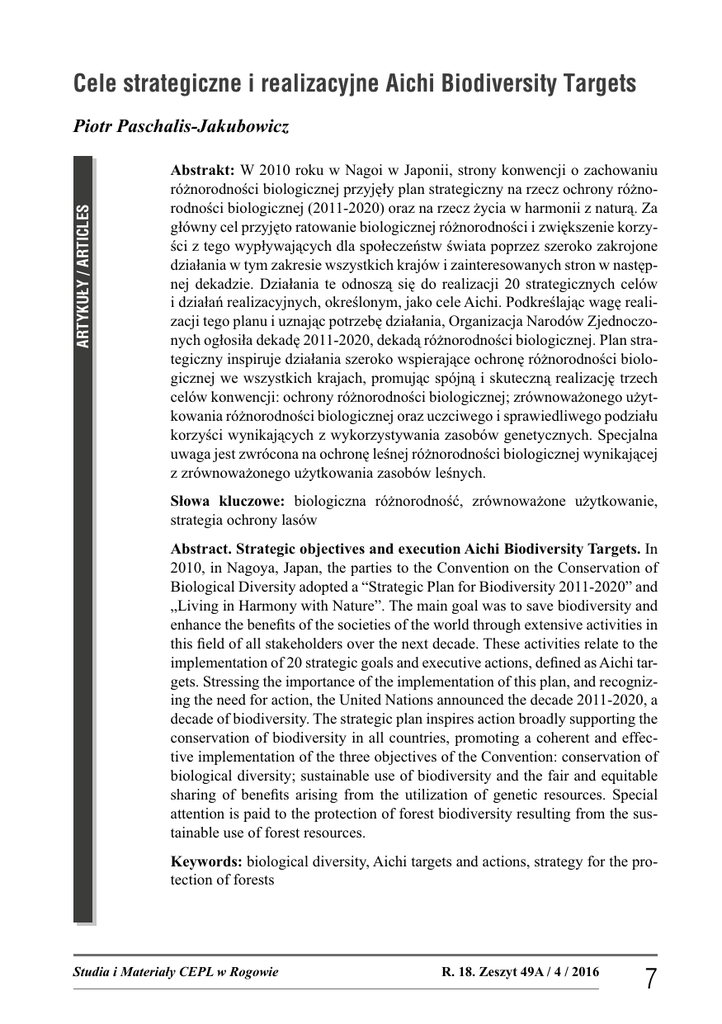Cele strategiczne i realizacyjne Aichi Biodiversity Targets ARTYKUŁY / ARTICLES Piotr Paschalis-Jakubowicz Abstrakt: W 2010 roku w Nagoi w Japonii, strony konwencji o zachowaniu różnorodności biologicznej przyjęły plan strategiczny na rzecz ochrony różnorodności biologicznej (2011-2020) oraz na rzecz życia w harmonii z naturą. Za główny cel przyjęto ratowanie biologicznej różnorodności i zwiększenie korzyści z tego wypływających dla społeczeństw świata poprzez szeroko zakrojone działania w tym zakresie wszystkich krajów i zainteresowanych stron w następnej dekadzie. Działania te odnoszą się do realizacji 20 strategicznych celów i działań realizacyjnych, określonym, jako cele Aichi. Podkreślając wagę realizacji tego planu i uznając potrzebę działania, Organizacja Narodów Zjednoczonych ogłosiła dekadę 2011-2020, dekadą różnorodności biologicznej. Plan strategiczny inspiruje działania szeroko wspierające ochronę różnorodności biologicznej we wszystkich krajach, promując spójną i skuteczną realizację trzech celów konwencji: ochrony różnorodności biologicznej; zrównoważonego użytkowania różnorodności biologicznej oraz uczciwego i sprawiedliwego podziału korzyści wynikających z wykorzystywania zasobów genetycznych. Specjalna uwaga jest zwrócona na ochronę leśnej różnorodności biologicznej wynikającej z zrównoważonego użytkowania zasobów leśnych. Słowa kluczowe: biologiczna różnorodność, zrównoważone użytkowanie, strategia ochrony lasów Abstract. Strategic objectives and execution Aichi Biodiversity Targets. In 2010, in Nagoya, Japan, the parties to the Convention on the Conservation of Biological Diversity adopted a “Strategic Plan for Biodiversity 2011-2020” and „Living in Harmony with Nature”. The main goal was to save biodiversity and enhance the benefits of the societies of the world through extensive activities in this field of all stakeholders over the next decade. These activities relate to the implementation of 20 strategic goals and executive actions, defined as Aichi targets. Stressing the importance of the implementation of this plan, and recognizing the need for action, the United Nations announced the decade 2011-2020, a decade of biodiversity. The strategic plan inspires action broadly supporting the conservation of biodiversity in all countries, promoting a coherent and effective implementation of the three objectives of the Convention: conservation of biological diversity; sustainable use of biodiversity and the fair and equitable sharing of benefits arising from the utilization of genetic resources. Special attention is paid to the protection of forest biodiversity resulting from the sustainable use of forest resources. Keywords: biological diversity, Aichi targets and actions, strategy for the protection of forests Studia i Materiały CEPL w Rogowie R. 18. Zeszyt 49A / 4 / 2016 7 Wstęp Konwencja o różnorodności biologicznej wprowadziła nową jakość w myśleniu o ochronie przyrody, rozumianej bardzo często wyłącznie, jako ochrona gatunków i siedlisk. W ten sposób do prawa międzynarodowego po raz pierwszy wprowadzono pojęcie ochrony ekosystemowej. Zwrócono w niej również uwagę na fakt, że szczególna odpowiedzialność za tę ochronę ciąży na państwach, na terytorium, których znajdują się dane zasoby przyrodnicze. Celem pracy jest przedstawienie odniesień i długofalowego wpływu przyjętych celów strategicznych i realizacyjnych programu Aichi na użytkowanie lasów na świecie. Biologiczna różnorodność i zasoby genetyczne lasów świata a użytkowanie lasu Różnorodność biologiczna jest utożsamiana z bogactwem form życiowych występujących na Ziemi oraz z gwarancją trwałości ekosystemów. Zmniejszanie się różnorodności biologicznej na świecie postrzegane jest jako skutek degradacji biosfery. Dlatego, aby zachować dziedzictwo przyrodnicze i zabezpieczyć trwałość rozwoju ludzkiego, należy rozpoznać, co ulega zanikaniu, jakie krajobrazy, ekosystemy, gatunki, oraz, które z nich należy objąć ochroną częściową lub ścisłą. Różnorodność biologiczna jest także rozumiana, jako zróżnicowanie organizmów, rozpatrywane na wszystkich poziomach organizacji przyrody, od odmian genetycznych należących do tego samego gatunku, poprzez gatunki, rodzaje, rodziny i wyższe jednostki taksonomiczne, a także, jako rozmaitość ekosystemów, które składają się z organizmów żyjących w określonych siedliskach, czy samych warunków fizycznych, w których żyją (Wilson 1992). Przekształcenie naturalnych ekosystemów przez człowieka spowodowało utratę mozaikowatości krajobrazów i jednocześnie zubożenie różnorodności biologicznej. Największe leśne zróżnicowanie biologiczne jest na Madagaskarze, w Indonezji, Chinach, Indiach, Zairze, Brazylii, Kolumbii, Ekwadorze, Peru, Meksyku i Stanach Zjednoczonych Ameryki Północnej. Najniższy wskaźnik biologicznej różnorodności jest w przypadku Grenlandii, Europy i Azji. Również różnorodność gatunkowa drzew, istotna ze względu na zasoby drzewne, w skali globu jest ogromnie zróżnicowana (Report of the Secretary-General… on Forests and climate change 2009), na przykład w Islandii są tylko 3 rodzime gatunki drzewiaste, a w Brazylii – 7780. Stabilność ekosystemów leśnych, a także liczba gatunków drzew zagrożonych wyginięciem, zależą od przyjętego sposobu użytkowania zasobów leśnych oraz od różnych czynników antropogenicznych i naturalnych. Rozwiązania problemu stabilności lasów i ochrony zagrożonych gatunków upatruje się w odpowiednim połączeniu wzrostu zapotrzebowania na drewno i na inne pożytki leśne ze wzrostem popytu na ochronę bioróżnorodności. Stały trend powiększania powierzchni lasów gospodarczych, zakładany w każdym z rozpatrywanych scenariuszu zdarzeń, pomimo przestrzegania wszelkich zasad prowadzenia zrównowa