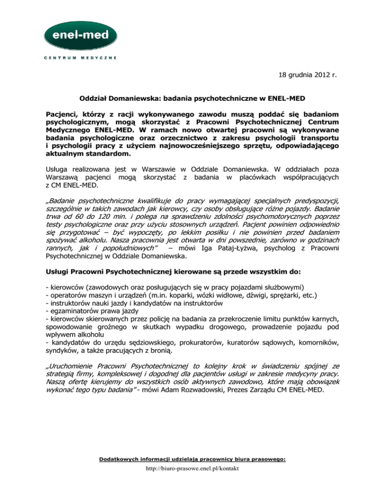 18 grudnia 2012 r. Oddział Domaniewska: badania psychotechniczne w ENEL-MED Pacjenci, którzy z racji wykonywanego zawodu muszą poddać się badaniom psychologicznym, mogą skorzystać z Pracowni Psychotechnicznej Centrum Medycznego ENEL-MED. W ramach nowo otwartej pracowni są wykonywane badania psychologiczne oraz orzecznictwo z zakresu psychologii transportu i psychologii pracy z użyciem najnowocześniejszego sprzętu, odpowiadającego aktualnym standardom. Usługa realizowana jest w Warszawie w Oddziale Domaniewska. W oddziałach poza Warszawą pacjenci mogą skorzystać z badania w placówkach współpracujących z CM ENEL-MED. „Badanie psychotechniczne kwalifikuje do pracy wymagającej specjalnych predyspozycji, szczególnie w takich zawodach jak kierowcy, czy osoby obsługujące różne pojazdy. Badanie trwa od 60 do 120 min. i polega na sprawdzeniu zdolności psychomotorycznych poprzez testy psychologiczne oraz przy użyciu stosownych urządzeń. Pacjent powinien odpowiednio się przygotować – być wypoczęty, po lekkim posiłku i nie powinien przed badaniem spożywać alkoholu. Nasza pracownia jest otwarta w dni powszednie, zarówno w godzinach rannych, jak i popołudniowych” – mówi Iga Pataj-Łyżwa, psycholog z Pracowni Psychotechnicznej w Oddziale Domaniewska. Usługi Pracowni Psychotechnicznej kierowane są przede wszystkim do: - kierowców (zawodowych oraz posługujących się w pracy pojazdami służbowymi) - operatorów maszyn i urządzeń (m.in. koparki, wózki widłowe, dźwigi, sprężarki, etc.) - instruktorów nauki jazdy i kandydatów na instruktorów - egzaminatorów prawa jazdy - kierowców skierowanych przez policję na badania za przekroczenie limitu punktów karnych, spowodowanie groźnego w skutkach wypadku drogowego, prowadzenie pojazdu pod wpływem alkoholu - kandydatów do urzędu sędziowskiego, prokuratorów, kuratorów sądowych, komorników, syndyków, a także pracujących z bronią. „Uruchomienie Pracowni Psychotechnicznej to kolejny krok w świadczeniu spójnej ze strategią firmy, kompleksowej i dogodnej dla pacjentów usługi w zakresie medycyny pracy. Naszą ofertę kierujemy do wszystkich osób aktywnych zawodowo, które mają obowiązek wykonać tego typu badania” - mówi Adam Rozwadowski, Prezes Zarządu CM ENEL-MED. Dodatkowych informacji udzielają pracownicy biura prasowego: http://biuro-prasowe.enel.pl/kontakt Informacje o firmie: Centrum Medyczne ENEL-MED S.A. (www.enel.pl) istnieje od 1993 roku. Obecnie na sieć medyczną ENEL-MED składa się kilkaset placówek medycznych w całej Polsce. Wśród nich są własne oddziały Centrum zlokalizowane w Warszawie (Atrium, Arkadia, Blue City, Domaniewska, Puławska, Zacisze), Gdańsku (Grunwaldzka), Łodzi (Manufaktura), Krakowie (Galeria Krakowska), Poznaniu (Kupiec Poznański) i Wrocławiu (Arkady Wrocławskie) oraz wielospecjalistyczny szpital (na warszawskim Zaciszu) funkcjonujący od 1998 roku i otwarty w 2012 roku Szpital Centrum. ENEL-MED może się także poszczycić własnymi oddziałami i pracowniami diagnostycznymi (Bielany, Oddział Centrum i Zacisze w Warszawie, Lublin, Łomża, Mielec, Poznań, Wołomin, Konin, Gdańsk). ENEL-MED oferuje pełną obsługę medyczną, prowadzi pacjenta od konsultacji, przez diagnostykę, hospitalizację, operację, aż po rehabilitację - czyli przez cały zamknięty cykl leczenia. Usługi świadczone są w następujących zakresach: - przychodnie specjalistyczne (lekarze wszystkich specjalności) kliniki stomatologiczne diagnostyka obrazowa (tomograf komputerowy, rezonans magnetyczny, RTG, mammograf, USG i inne) szpital rehabilitacja centrum psychologiczne teleradiologia i outsourcing szkoła rodzenia autorskie programy profilaktyczne wysokospecjalistyczna poradnia okulistyczna ENEL-MED posiada w ofercie produkty zarówno dla klientów korporacyjnych – system abonamentowej opieki medycznej dla firm Enel-Care, jak i klientów indywidualnych – program komercyjnych ubezpieczeń zdrowotnych medi-care, który realizowany jest wspólnie z InterRisk S.A. Vienna Insurance Group. Zespół ENEL-MED liczy obecnie ok. 2000 osób, w tym ok. 1000 lekarzy i ok. 470 pracowników personelu medycznego nielekarskiego. 95% kadry medycznej posiada II stopień specjalizacji. Z usług ENEL-MED korzysta ponad 300 tys. pacjentów. W ramach programu Enel-Care, Centrum obsługuje blisko 119 tys. (dane z lipca 2012 r.). W 2004 roku Centrum uzyskało Certyfikat Systemu Zarządzania Jakością zgodnie z wymogami normy ISO 9001:2000, a re-certyfikacja przeprowadzona w styczniu 2010 roku zakończyła się rekomendacją do wydania certyfikatu na zgodność z normą ISO 9001:2008. Dodatkowych informacji udzielają pracownicy biura prasowego: http://biuro-prasowe.enel.pl/kontakt