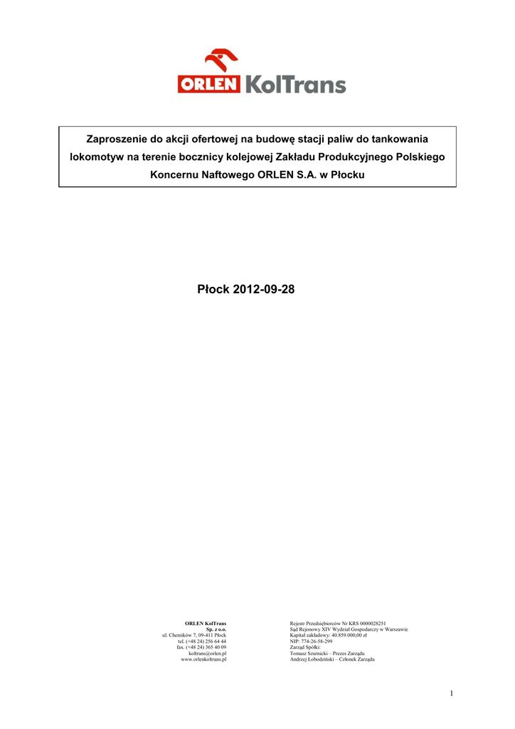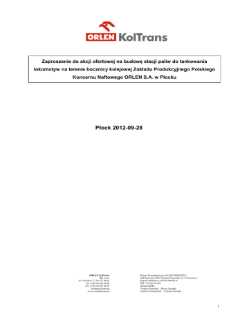 Zaproszenie do akcji ofertowej na budowę stacji paliw do tankowania lokomotyw na terenie bocznicy kolejowej Zakładu Produkcyjnego Polskiego Koncernu Naftowego ORLEN S.A. w Płocku Płock 2012-09-28 ORLEN KolTrans Sp. z o.o. ul. Chemików 7, 09-411 Płock tel. (+48 24) 256 64 44 fax. (+48 24) 365 40 09 [email protected] www.orlenkoltrans.pl Rejestr Przedsiębiorców Nr KRS 0000028251 Sąd Rejonowy XIV Wydział Gospodarczy w Warszawie Kapitał zakładowy: 40.859.000,00 zł NIP: 774-26-58-299 Zarząd Spółki: Tomasz Szurnicki – Prezes Zarządu Andrzej Łobodziński – Członek Zarządu 1 I. Zlecający: ORLEN KolTrans Sp. z o.o. 09-411 Płock Ul. Chemików 7 NIP: 774-26-58-299 http://www.orlenkoltrans.pl, e-mail: [email protected], tel. 24 256 64 44, fax. 24 365 40 09 II. Informacje o postępowaniu ofertowym: Postępowanie ofertowe prowadzone jest według wewnętrznych procedur obowiązujących w ORLEN KolTrans Sp. z o.o. III. Przedmiot zlecenia: 1. Budowa stacji paliw do tankowania lokomotyw na terenie bocznicy Zakładu Produkcyjnego Polskiego Koncernu Naftowego ORLEN S.A. w Płocku zgodnie z projektem budowlanym „Przebudowa stacji paliw dla tankowania lokomotyw” wykonanym przez firmę Biuro Projektowe ARCHITEKT BielskoBiała (do wglądu u Zleceniodawcy) oraz na podstawie otrzymanego pozwolenia na budowę. 2. Szczegółowy zakres prac według branż: 2.1 Drogi wraz z odwodnieniem. 2.1.1 Prace rozbiórkowe: - istniejącego placu betonowego (434 m2) i powierzchni wybetonowanych zlokalizowanych na trasie kanalizacji (ok. 100 m2), - fundamentów po rozebranej suszarni piasku (64 m2), - studni kanalizacyjnych: Ø 1000 – 3 szt., - studni ściekowych: Ø 500 – 3 szt., - kolektora drenażowego Ø 200 - 50 mb, 2.1.2 Zabudowa nowej, szczelnej nawierzchni betonowej placu o powierzchni 434 m2 oraz odbudowa powierzchni betonowych po zabudowie kanalizacji (ok. 80 m2). 2.1.3 Wykonanie odwodnienia w formie kanalizacji deszczowej z włączeniem do kanalizacji ścieków przemysłowych. Budowa kolektora Ø 250 o długości 144 mb i przykanalików Ø 200 o długości 50 mb, 9 szt. studni kanalizacyjnych Ø 1000 i trzech studni wpustowych Ø 500. Włączenie do istniejącej kanalizacji przemysłowej poprzez zabudowę separatora. 2.1.4 Zabudowa prefabrykowanych, żelbetowych wanien szczelnych w istniejącym torze nr 212 o łącznej długości 15 m i szerokości 3,8 m w miejscu tankowania lokomotyw wraz z odpływami do kanalizacji. 2.1.5 Wykonanie niezbędnych zabezpieczeń ścian wykopów w czasie prowadzenia prac ziemnych. 2.2 Płyta fundamentowa zbiornika naziemnego – płyta żelbetowa o wymiarach 15 m x 3,5 m x 0,4 m wraz z podbudową. Parametry płyty do przeliczenia pod konkretny zbiornik. 2.3 Wykonanie instalacji elektrycznych. 2.3.1 Zasilanie obiektu z rozdzielni kablem 4x 70 mm2 o długości ok. 200 mb ułożonym w wykonanym korytku kablowym zamontowanym na istniejącej estakadzie. 2 2.3.2 Zasilanie pompy rozładunkowej i dwóch dystrybutorów. 2.3.3 Instalacje kontroli przecieków ze zbiornika i pomiaru poziomu paliwa i oparów. 2.3.4 Instalacja uziemiająca zbiornika, dystrybutorów i rurociągów. 2.3.5 Szafa rozdzielcza i szafa dystrybucyjna zabudowane w istniejącym budynku magazynu paliw. 2.3.6 Oświetlenie placu. 2.4 Montaż instalacji paliwowych. 2.4.1 Stanowisko spustowe autocysternowe (jedna pompa rozładunkowa). 2.4.2 Zbiornik naziemny magazynowy dwupłaszczowy, jednokomorowy, o pojemności 90 m3 z kontrolą przeciekania i pomiarem ilości paliwa i oparów. Kolor zbiornika biały z logo firmy ORLEN Koltrans. 2.4.3 Stanowisko wydawania paliwa - dwa dystrybutory do tankowania ON o wydajności 400 l/min. 2.4.4 Zabudowa aparatury pomiarowej i kontrolnej oraz wdrożenie systemu monitoringu poziomu paliwa w zbiorniku i dystrybucji paliwa. System wydawania paliwa dla 40-tu lokomotyw i 100-tu użytkowników na podstawie kart kontrolnych lub podobnych urządzeń. 2.5 System informatyczny obsługujący i monitorujący wydawanie paliw. - Aplikacja działająca w środowisku klient – serwer, z relacyjną bazą danych opartą na MS SQL, z możliwością udostępnienia danych dla innych systemów odbiorczych (np. Symfonia Handel) - Definiowanie płynów i zbiorników; - Konfiguracja urządzeń pracujących w systemie; - Zarządzanie kartotekami odbiorców i dostawców (dodawanie, usuwanie i edycja, przypisywanie identyfikatorów); - Ewidencjonowanie tankowań i kalibracji zbiorników; - Możliwość zdefiniowania ręcznych tankowań oraz tankowań awaryjnych z wykorzystaniem jednorazowych kodów dostępu; - Podgląd bieżących stanów zbiorników; - Generowanie raportów tankowań oraz innych raportów na podstawie zbieranych zdarzeń w systemie. - Możliwość eksportowania danych do liczących się na rynku formatów (np. Excel, Access, PDF) 3. Zakres prac dodatkowych związanych z budową: 3.1 Sprawowanie funkcji Kierownika Budowy. 3.2 Sporządzenie planu BIOZ. 3.3 Zweryfikowanie na budowie podanych w projekcie rozwiązań i wymiarów oraz uzgodnienie wszelkich rozbieżności i zmian wynikłych w trakcie budowy z projektantem pełniącym nadzór autorski. 3.4 Uzupełnienie projektu budowlanego o niezbędną dokumentację wykonawczą. 3.5 Wykonanie próby ciśnieniowej zbiornika i rurociągów. 3.6 Płukanie instalacji i dystrybutorów oraz pobranie próbek paliw. 3.7 Wykonanie sprawdzenia wydawania dystrybutorów. 3.8 Litrażowanie zbiornika oraz rozliczenie paliwa w dniu przekazania stacji służbom handlowym - ostatecznej parametryzacji systemu kontrolnopomiarowego. 3 3.9 Uzyskanie i dostarczenie Zamawiającemu decyzji odbiorowych UDT i UM oraz niezbędnych protokołów odbiorowych i prób. 3.10 Zlecenie do Planu Generalnego PKN ORLEN wykonania inwentaryzacji wszystkich obiektów naziemnych stacji oraz instalacji podziemnych. 3.11 Wykonanie kompletnej dokumentacji powykonawczej. 3.12 Skompletowanie i przedstawienie Zamawiającemu dokumentów pozwalających na ocenę prawidłowości w
