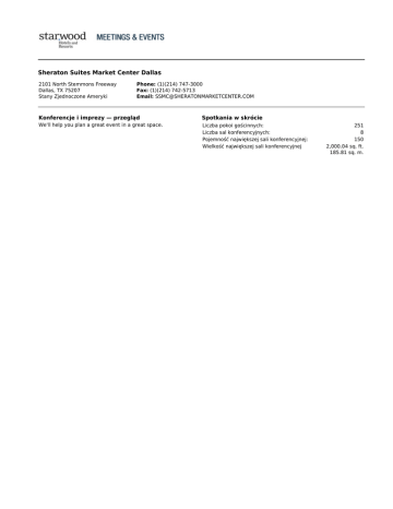 Sheraton Suites Market Center Dallas 2101 North Stemmons Freeway Dallas, TX 75207 Stany Zjednoczone Ameryki Phone: (1)(214) 747-3000 Fax: (1)(214) 742-5713 Email: [email protected] Konferencje i imprezy — przegląd Spotkania w skrócie We'll help you plan a great event in a great space. Liczba pokoi gościnnych: Liczba sal konferencyjnych: Pojemność największej sali konferencyjnej: Wielkość największej sali konferencyjnej 251 8 150 2,000.04 sq. ft. 185.81 sq. m. Sheraton Suites Market Center Dallas 2101 North Stemmons Freeway Dallas, TX 75207 Stany Zjednoczone Ameryki Phone: (1)(214) 747-3000 Fax: (1)(214) 742-5713 Email: [email protected] Specyfikacja szczegółowa Nieruchomości Typ obiektu Suburban Airport Liczba sal konferencyjnych 8 Rok budowy 1990 Całkowita wielkość sal konferencyjnych 357.68 sq. m. 3,850.04 sq. ft. Liczba budynków 1 Wielkość największej sali konferencyjnej 185.81 sq. m. 2,000.04 sq. ft. Liczba pięter 11 Pojemność największej sali konferencyjnej 150 Pojemność najmniejszej sali konferencyjnej 18.58 sq. m. Pojemność najmniejszej sali konferencyjnej 10 199.99 sq. ft. Pokoje gościnne Data zameldowania 3:00 PM Internet w pokoju Data wymeldowania 12:00 PM Liczba pokoi gościnnych 251 Udogodnienia Basen Yes Indoor Whirlpool Outdoor Pool Indoor Heated Pool Nazwa basenu Lokalne & atrakcje Strefa czasowa C Pobliskie lotniska Love Field Kod lotniska DAL Odległość od lotniska 4.83 Kilometers 3.00 Miles Obszar lokalny Leave time to explore the sights! Transport & parkowanie Advance Search: There is an Airport Shuttle Dowóz na lotnisko i z lotniska service on-site from the hotel to the nearest airport. Consider only courtesy shuttle services. Opłaty za parkowanie Opłaty & podatki Waluta lokalna United States Dollars Kod waluty USD Minimum Fee:7.95,Maximum Fee:7.95 Metody płatności • DISCOVER NETWORK • DINERS/SUNDIN/AMOCO • JAPAN CREDIT BUREAU • AMEX / OPTIMA • MASTER CARD • VISA Sheraton Suites Market Center Dallas 2101 North Stemmons Freeway Dallas, TX 75207 Stany Zjednoczone Ameryki Phone: (1)(214) 747-3000 Fax: (1)(214) 742-5713 Email: [email protected] Capacity Charts Room Name Key Dim. (l x w) Area Height Banq. Thtr. Executive Boardroom - 5.49 m. x 8.23 m.18.01 ft. x 27.00 ft. 45.15 sq. m. 485.99 sq. ft. 2.74 m. 8.99 ft. - - Hospitality Suites (2) - - 69.68 sq. m. 750.03 sq. ft. 2.74 m. 8.99 ft. - - Live Oak - 7.01 m. x 8.23 m.23.00 ft. x 27.00 ft. 57.69 sq. m. 620.97 sq. ft. 3.05 m. 10.01 ft. 50 50 Live/ Red Oak - 7.01 m. x 16.46 m.23.00 ft. x 54.00 ft. 115.39 sq. m. 1,242.05 sq. ft. 3.05 m. 10.01 ft. - - Magnolia - 5.79 m. x 8.84 m.19.00 ft. x 29.00 ft. 153.29 sq. m. 1,650.00 sq. ft. 3.05 m. 10.01 ft. 130 120 Oaks Ballroom - 8.23 m. x 21.03 m.27.00 ft. x 69.00 ft. 173.08 sq. m. 1,863.02 sq. ft. 3.05 m. 10.01 ft. 130 150 Red Oak - 7.01 m. x 8.23 m.23.00 ft. x 27.00 ft. 57.69 sq. m. 620.97 sq. ft. 3.05 m. 10.01 ft. 50 50 White Oak 7.01 m. x 8.23 m.23.00 ft. x 27.00 ft. - 57.69 sq. m. 620.97 sq. ft. 3.05 m. 10.01 ft. 50 50 Room Name Conf. Rec. Class U-Shp. H. Sq. Dinner Dance White Oak 14 - - - - - White Oak 8 25 - - - - White Oak 20 50 25 20 - - White Oak 14 - - - - - White Oak 30 150 70 25 - - White Oak 60 120 80 60 - - White Oak 20 50 25 20 - - White Oak 20 50 25 20 - -