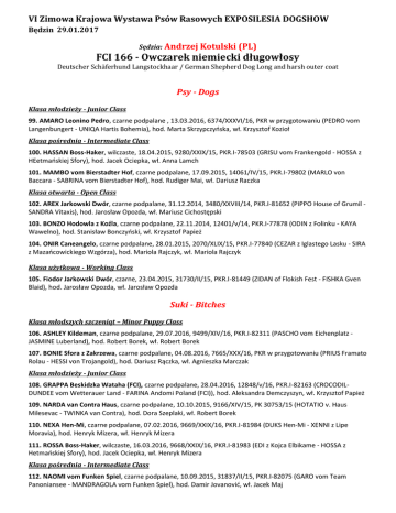 VI Zimowa Krajowa Wystawa Psów Rasowych EXPOSILESIA DOGSHOW Będzin 29.01.2017 Sędzia: Andrzej Kotulski (PL) FCI 166 - Owczarek niemiecki długowłosy Deutscher Schäferhund Langstockhaar / German Shepherd Dog Long and harsh outer coat Psy - Dogs Klasa młodzieży - Junior Class 99. AMARO Leonino Pedro, czarne podpalane , 13.03.2016, 6374/XXXVI/16, PKR w przygotowaniu (PEDRO vom Langenbungert - UNIQA Hartis Bohemia), hod. Marta Skrzypczyńska, wł. Krzysztof Kozioł Klasa pośrednia - Intermediate Class 100. HASSAN Boss-Haker, wilczaste, 18.04.2015, 9280/XXIX/15, PKR.I-78503 (GRISU vom Frankengold - HOSSA z HEetmańskiej Sfory), hod. Jacek Ociepka, wł. Anna Lamch 101. MAMBO vom Bierstadter Hof, czarne podpalane, 17.09.2015, 14061/IV/15, PKR.I-79802 (MARLO von Baccara - SABRINA vom Bierstadter Hof), hod. Rudiger Mai, wł. Dariusz Raczka Klasa otwarta - Open Class 102. AREX Jarkowski Dwór, czarne podpalane, 31.12.2014, 3480/XXVIII/14, PKR.I-81652 (PIPPO House of Grumil SANDRA Vitaxis), hod. Jarosław Opozda, wł. Mariusz Cichostępski 103. BONZO Hodowla z Koźla, czarne podpalane, 22.11.2014, 12401/v/14, PKR.I-77878 (ODIN z Folinku - KAYA Wawelno), hod. Stanisław Bonczyński, wł. Krzysztof Papież 104. ONIR Caneangelo, czarne podpalane, 28.01.2015, 2070/XLIX/15, PKR.I-77840 (CEZAR z Iglastego Lasku - SIRA z Mazańcowickiego Wzgórza), hod. Mariola Rajczyk, wł. Mariola Rajczyk Klasa użytkowa - Working Class 105. Fiodor Jarkowski Dwór, czarne, 23.04.2015, 31730/II/15, PKR.I-81449 (ZIDAN of Flokish Fest - FISHKA Gven Blaid), hod. Jarosław Opozda, wł. Jarosław Opozda Suki - Bitches Klasa młodszych szczeniąt – Minor Puppy Class 106. ASHLEY Kildeman, czarne podpalane, 29.07.2016, 9499/XIV/16, PKR.I-82311 (PASCHO vom Eichenplatz JASMINE Luberland), hod. Robert Borek, wł. Robert Borek 107. BONIE Sfora z Zakrzewa, czarne podpalane, 04.08.2016, 7665/XXX/16, PKR w przygotowaniu (PRIUS Framato Rolau - HESSI von Trojangold), hod. Dariusz Rączka, wł. Agnieszka Marczak Klasa młodzieży - Junior Class 108. GRAPPA Beskidzka Wataha (FCI), czarne podpalane, 28.04.2016, 12848/v/16, PKR.I-82163 (CROCODILDUNDEE vom Wetterauer Land - FARINA Andomi Poland (FCI)), hod. Aleksandra Demczyszyn, wł. Krzysztof Papież 109. NARDA van Contra Haus, czarne podpalane, 10.10.2015, 9166/XIV/15, PK 30753/15 (HOTATIO v. Haus Milesevac - TWINKA van Contra), hod. Dora Szeplaki, wł. Robert Borek 110. NEXA Hen-Mi, czarne podpalane, 07.02.2016, 9669/XXIX/16, PKR.I-81984 (DUKS Hen-Mi - XENNI z Lipe Moravia), hod. Henryk Mizera, wł. Henryk Mizera 111. ROSSA Boss-Haker, wilczaste, 16.03.2016, 9668/XXIX/16, PKR.I-81983 (EDI z Kojca Elbikame - HOSSA z Hetmańskiej Sfory), hod. Jacek Ociepka, wł. Henryk Mizera Klasa pośrednia - Intermediate Class 112. NAOMI vom Funken Spiel, czarne podpalane, 10.09.2015, 31837/II/15, PKR.I-82075 (GARO vom Team Panoniansee - MANDRAGOLA vom Funken Spiel), hod. Damir Jovanović, wł. Jacek Maj 113. ZOE VOM Treuenbrietzener Land, czarne podpalane, 27.04.2015, 3496/XXVIII/15, PKR.I-81673 (PIPPO House of Grumil - ELFI zum Turmacker), hod. Mirko Kadach, wł. Mariusz Cichostępski Klasa otwarta – Open Class 114. AMELIE Z Kojca Sosnowa Górka, czarne podpalane, 15.06.2015, 9329/XIV/15, PKR.I-80663 (HARRY Mavic Poland – COCA Wadera Kristo), hod. Stanisław Szyszka, wł. Stanisław Szyszka 115. BRI de Tierratoni, czarne podpalane, 19.06.2015, 1928/XXXIX/15, PKR.I-79022 (PEDRO vom Langenbungert ESPRIT von Tronje), hod. Cezary Kubicki, wł. Aleksandra Dębska-Dudek Sędzia: Andrzej Kotulski (PL) FCI 166 - Owczarek niemiecki krótkowłosy Deutscher Schäferhund Stockhaar / German Shepherd Dog Short coat Psy – Dogs Klasa młodszych szczeniąt – Minor Puppy Class 116. HOBBIT Darkaro, czarne podpalane, 31.08.2016, 9856/XXIX/16, PKR w przygotowaniu (ZIDAN of Flokish Fest - HENNA Tensor), hod. Karolina Ciosek, wł. Karolina Ciosek Klasa szczeniąt – Puppy Class 117. DOCCO von der Freiheit Westerholt, czarne podpalane, 02.07.2016, 9738/XXIX/16, PKR w przygotowaniu (GONDOR von Regina Pacis - FEE von Regina Pacis), hod. Ralf Lang, wł. Andrzej Rybarczyk 118. PAKO spod Gichty FCI, czarne podpalane, 24.07.2016, 6444/XXXVI/16, PKR w przygotowaniu (WATSON vom Fichtenschlag - OTI Asarko Lordana), hod. Adam Głowacki, wł. Adam Głowacki, Agnieszka Głowacka Klasa młodzieży - Junior Class 119. HILL Pajęcze sieci, czarne podpalane, 07.03.2016, 31945/II/16, PKR w przygotowaniu (GARO vom Team Panoniansee - DHERBY Hexenland), hod. Krzysztof Mirek, wł. Krzysztof Mirek Klasa pośrednia – Intermediate Class 120. BAKO z Rodu Tytana, czarne podpalane, 14.03.2015, 31464/II/15, PKR.I-80028 (CHAMPION vom Kapellenberg - OKLAHOMA Padaroko FCI), hod. Jacek Maj, wł. Jacek Maj 121. FLORENT Vom Winnloh, czarne podpalane, 05.07.2015, SZ-Nr.2318573 (GARY vom Hühnegrab - MEITE vom Wlnnloh), hod. Anton Tepling, wł. Mirosław Świątek 122. GARU z Cholerzyna, czarne podpalane, 21.06.2015, 31779/II/15, PKR.I-81716 (WALLABY Avax Hof - AMBRA od Basiora), hod. Janusz Chyla, wł. Małgorzata Chodacka Klasa otwarta – Open Class 123. KASPER vom Lamorak, czarne podpalane, 12.11.2012, 15166/XV/12, PKR.I-76196 (PACCO vom Langenbungert - DUFTE vom Lamorak), hod. Silke Bretschneider, wł. Bernard Famuła 124. MIKADO MAXI Spod Gichty, czarne podpalane, 27.06.2015, 6148//XXXVI//15, PKR.I-78961 (HIRO Smiłowickie Wilki - OTI Asarko Lordana), hod. Adam Głowacki, wł. Seweryna Szymiczek 125. ZOHAN vom Haus Tchorz, czarne podpalane, 12.05.2015, 29757/VII/15, PKR.I-79835 (CRONOS del Seprio BRENDA vom Trompetersprung), hod. Mirosław Tchorz, wł. Mirosław Tchorz Klasa użytkowa – Working Class 126. GAIUS Tensor, czarne podpalane, 16.08.2014, 13901/IV/14, PKR.I-76418 LC (Team Leiksaid KAPITAN ROXANNE Tensor), hod. Joanna i Adam Domańscy, wł. Joanna i Adam Domańscy 127. TECKO vom Finkenschlag, czarne podpalane, 10.11.2013, 5889/XXXVI/13, PKR.I-75734 (SCHUMANN von Tronje - IWANA vom Hersbusch), hod. Hans Peter Fetten, wł. Ja