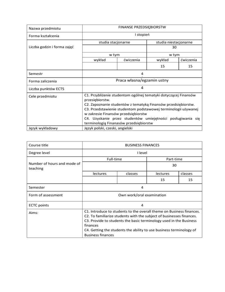 Nazwa przedmiotu FINANSE PRZEDSIĘBIORSTW Forma kształcenia I stopień studia stacjonarne studia niestacjonarne 30 w tym w tym Liczba godzin i forma zajęć wykład ćwiczenia wykład ćwiczenia 15 Semestr 15 4 $ Praca własna/egzamin ustny Forma zaliczenia 4 Liczba punktów ECTS Cele przedmiotu Język wykładowy C1. Przybliżenie studentom ogólnej tematyki dotyczącej Finansów przesiębiorstw. C2. Zapoznanie studentów z tematyką Finansów przedsiębiorstw. C3. Przedstawienie studentom podstawowej terminologii używanej w zakresie Finansów przedsiębiorstw C4. Uzyskanie przez studentów umiejętności posługiwania się terminologią Finanasów przedsiębiorstw Język polski, czeski, angielski Course title BUSINESS FINANCES Degree level I level Full-time Part-time Number of hours and mode of teaching 30 lectures classes lectures 15 Semester Form of assessment ECTC points Aims: classes 15 4 Own work/oral examination 4 C1. Introduce to students to the overall theme on Business finances. C2. To familiarize students with the subject of businesses finances. C3. Provide to students the basic terminology used in the Business finances C4. Getting the students the ability to use business terminology of Business finances