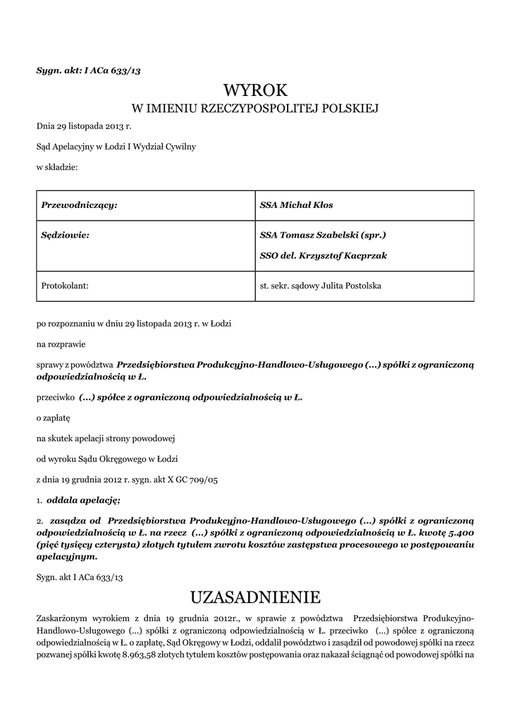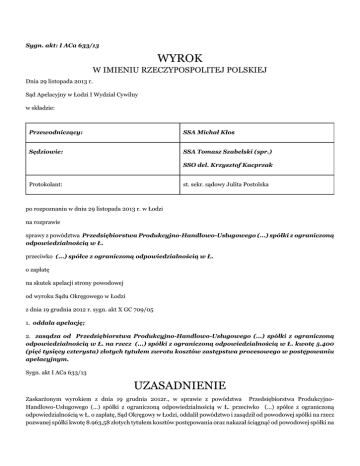 Sygn. akt: I ACa 633/13 WYROK W IMIENIU RZECZYPOSPOLITEJ POLSKIEJ Dnia 29 listopada 2013 r. Sąd Apelacyjny w Łodzi I Wydział Cywilny w składzie: Przewodniczący: SSA Michał Kłos Sędziowie: SSA Tomasz Szabelski (spr.) SSO del. Krzysztof Kacprzak Protokolant: st. sekr. sądowy Julita Postolska po rozpoznaniu w dniu 29 listopada 2013 r. w Łodzi na rozprawie sprawy z powództwa Przedsiębiorstwa Produkcyjno-Handlowo-Usługowego (...) spółki z ograniczoną odpowiedzialnością w Ł. przeciwko (...) spółce z ograniczoną odpowiedzialnością w Ł. o zapłatę na skutek apelacji strony powodowej od wyroku Sądu Okręgowego w Łodzi z dnia 19 grudnia 2012 r. sygn. akt X GC 709/05 1. oddala apelację; 2. zasądza od Przedsiębiorstwa Produkcyjno-Handlowo-Usługowego (...) spółki z ograniczoną odpowiedzialnością w Ł. na rzecz (...) spółki z ograniczoną odpowiedzialnością w Ł. kwotę 5.400 (pięć tysięcy czterysta) złotych tytułem zwrotu kosztów zastępstwa procesowego w postępowaniu apelacyjnym. Sygn. akt I ACa 633/13 UZASADNIENIE Zaskarżonym wyrokiem z dnia 19 grudnia 2012r., w sprawie z powództwa Przedsiębiorstwa ProdukcyjnoHandlowo-Usługowego (...) spółki z ograniczoną odpowiedzialnością w Ł. przeciwko (...) spółce z ograniczoną odpowiedzialnością w Ł. o zapłatę, Sąd Okręgowy w Łodzi, oddalił powództwo i zasądził od powodowej spółki na rzecz pozwanej spółki kwotę 8.963,58 złotych tytułem kosztów postępowania oraz nakazał ściągnąć od powodowej spółki na rzecz Skarbu Państwa – Sądu Okręgowego w Łodzi kwotę 729,66 złotych tytułem wydatków poniesionych na biegłego sądowego oraz nakazał zwrócić ze Skarbu Państwa – Sądu Okręgowego w Łodzi tytułem nadpłaconej zaliczki na koszty biegłego sądowego powodowej spółce kwotę 297,69 złotych, a pozwanej spółce kwotę 251,42 złote. Powyższy wyrok zapadł na podstawie poczynionych przez Sąd Okręgowy ustaleń faktycznych, które Sąd Apelacyjny co do zasady podzielił i przyjął za własne, a z których wynika, że w dniu 14 stycznia 2005r. między stronami została zawarta mowa najmu pomieszczeń warsztatu mechanicznego w kompleksie budynku o nr inw. 102-28, usytuowanego w części północnej tego budynku na terenie dawnych Zakładów (...) w Ł.. Pomieszczenia te zostały wynajęte od dnia 1 lutego 2005r. na czas nieokreślony, z możliwością wypowiedzenia umowy przez każdą ze stron z miesięcznym okresem wypowiedzenia. Najemca na własny koszt miał dokonać przystosowania pomieszczeń do własnych potrzeb, a wynajmujący nie miał obowiązku zwracać najemcy tych kosztów w przypadku rozwiązania umowy z jakichkolwiek przyczyn. Pismem z dnia 27 kwietnia 2005r., skierowanym do powodowej spółki, pozwana wypowiedziała umowę najmu pomieszczeń warsztatu mechanicznego, wnosząc o zwrot pomieszczenia i kluczy dnia 31 maja 2005r., proponując jednocześnie po tym terminie zawarcie umowy najmu innego obiektu w Ł. lub w O. na nowych warunkach W pomieszczeniu warsztatu mechanicznego strona powodowa prowadziła hurtownię odzieży używanej. Zawierając umowę najmu pomieszczenia warsztatu mechanicznego powodowa Spółka nie wiedziała, że będzie musiała opuścić lokal do końca czerwca 2005r., z uwagi na prace rozbiórkowe tego pomieszczenia. Pozwany zaproponował powódce inny lokal w O., ale powódka odmówiła. W dniu 27 maja 2005r. strony zawarły kolejną umowę najmu, na podstawie której pozwany wynajął powodowej spółce halę dawnej czesalni w kompleksie budynku o nr inw. 102-23 i pomieszczenie socjalne w budynku nr inw. 101-15, o łącznej powierzchni 1.023,55 m2. W pomieszczeniach tych powódka miała prowadzić działalność gospodarczą, polegającą na prowadzeniu hurtowni odzieży używanej. Pomieszczenia zostały wynajęte od dnia 1 czerwca 2005r. na czas nieokreślony, z możliwością wypowiedzenia umowy przez każdą ze stron z miesięcznym okresem wypowiedzenia. Wynajmujący powiadomił najemcę, że budynek, w którym znajdują się pomieszczenia będące przedmiotem najmu przeznaczony jest do rozbiórki w niedalekiej przyszłości, z uwagi na przyszłą budowę osiedla mieszkaniowego. Najemca na własny koszt miał dokonać przystosowania pomieszczeń do swoich potrzeb. Wynajmujący nie miał obowiązku zwracać tych kosztów w przypadku rozwiązania umowy z jakiejkolwiek przyczyny. Pozwany w pomieszczeniu czesalni pomalował ściany, wykonał łazienkę, zabezpieczył strop folią, wybudował kantorek. Po wykonaniu przez pozwanego w pomieszczeniu czesalni prac, które umożliwiały powódce rozpoczęcie działalności, powódka rozpoczęła przewożenie odzieży z pomieszczenia warsztatu mechanicznego do pomieszczenia czesalni, samochodami wynajętymi przez pozwanego, przy czym opóźniała wywóz odzieży do nowego pomieszczenia. Pismem z dnia 24 czerwca 2005r. pozwany wypowiedział umowę najmu dawnej hali czesalni nr 3 z miesięcznym okresem wypowiedzenia, prosząc o zwrot pomieszczenia i kluczy w dniu 31 lipca 2005r. W dniu 15 czerwca 2005r. pozwany odciął kłódkę znajdującą się na drzwiach pomieszczenia warsztatu, nie pozwolił nic zabrać z tego pomieszczenia i nie wpuścił pracowników powódki do budynku. Pracownicy pozwanego weszli do pomieszczenia warsztatu i rozpoczęli wywożenie odzieży powódki do magazynu depozytowego znajdującego się na tym samym terenie. Przewożona odzież powódki była pakowana przez pozwanego w worki foliowe i samochodami ciężarowymi przewożona do magazynu depozytowego. W czasie przewożenia odzieży przez pozwanego była obecna firma ochroniarska. W momencie przewozu odzieży do innego pomieszczenia nie była ona ważona przez pozwanego i nie uczestniczył przy jej przewożeniu przedstawiciel firmy powodowej. Magazyn depozytowy, do którego została przewieziona odzież powódki był zdewastowanym pomieszczeniem przemysłowym z zawilgoconymi i zagrzybionymi ścianami. Dach