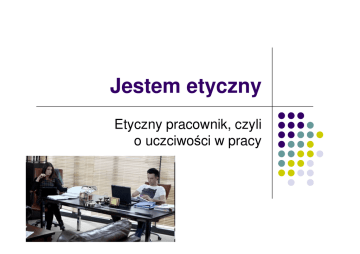 Jestem etyczny Etyczny pracownik, czyli o uczciwości w pracy Czy zastanawialiście się: Co oznacza pojęcie etyczny pracownik? Czy opłaca się być w pracy bezwzględnie uczciwym? Jak ocenić, czy dane zachowanie jest etyczne? Pytanie Czy w życiu codziennym zdarzało się Wam z przejawami nierzetelnego wykonywania pracy? Podajcie przykłady takich zachowań. „Postępuj według takiej zasady, którą mógłbyś uczynić prawem powszechnym” Immanuel Kant- niemiecki filozof Etyka Dziedzina wiedzy, która zajmuje się problemem uczciwości w życiu codziennym jak i zawodowym, Etyka biznesu dotyczy zagadnień związanych z prowadzeniem działalności gospodarczej: współpracowników, przełożonych, właścicieli przedsiębiorstwa, dostawców klientów „Czy pracujemy uczciwie?” - ćwiczenie Zapoznajcie się z tekstem „Studium przypadku” Wskażcie wszystkie przykłady nieetycznych zachowań pracowników, opisane w tekstach. Nieetyczne zachowanie Nierzetelne, niesumienne wykonywanie pracy pracy (malarz, stolarz, kucharka, sprzątaczka…), Wyłudzanie zasiłków dla bezrobotnych w urzędzie pracy, Okradanie zlecającego pracę (drewno, in. materiały, paliwo, części maszyn, narzędzia), Rezygnowanie z pracy, bo za ciężka… Wyłudzanie zwolnień lekarskich.. Nieetyczne zachowanie cd. Obraźliwe gesty i słowa skierowane wobec współpracowników i przełożonych, klientów, Przemoc fizyczna i psychiczna, Dyskryminacja pracowników ze względu na rasę, kolor skóry, płeć, orientację seksualną, religię, stan cywilny, status społ., narodowość, opinie polityczną, Korzystanie z pojawiających się możliwości zarobkowych (praca dla konkurencji), Proponowanie lub przyjmowanie łapówek, Korzystanie z bazy technicznej przedsiębiorstwa dla prywatnych celów- ksero, prywatne rozmowy telefoniczne, używanie poczty elektronicznej „Skutki nieetycznych zachowań pracowników – ćwiczenie (wypełnij tabelkę) Dla pracodawców: trudność w wywiązywaniu się z kontraktów, szkody materialne, podwyższenie kosztów prowadzonej działalności, Dla firmy: niszczy zaufanie klientów i kontrahentów, przynoszą straty finansowe, obniża efektywność, czyli sprawność działania, Dla klientów firmy: niższa jakość- mniejsze zadowolenie z zakupu, straty materialne, mniejsze zaufanie Dlaczego postawy nieetyczne są tak bardzo rozpowszechnione w naszym społeczeństwie? Zdaniem wielu socjologów i ekonomistów, negatywny stosunek do pracy ma swoje źródła w systemie gospodarczym i politycznym, który kształtował postawy Polaków przed 1989 rokiem „Źródła degradacji etosu pracy”przeczytaj materiał pomocniczy i odpowiedz na pytania: Jakie nieetyczne zachowania pracowników w zakładach pracy opisują te teksty? Dlaczego pracownicy nie przestrzegali norm etycznych? Jakie są zdaniem autorów tekstów, historyczne źródła negatywnych postaw wobec pracy i własności prywatnej? Jakie cechy systemu politycznego i gospodarczego w Polsce sprzed 1989 roku miały wpływ na postawy pracowników? „Jakich wartości i norm powinien przestrzegać dobry pracownik?” Jakie wartości i normy powinny być przestrzegane przez dobrego pracownika? Odpowiedz na pytania: Do jakich celów powinien dążyć dobry pracownik? Jakie wartości są ważne dla pracownika? Jakimi środkami powinny być realizowane wybrane cele? Jakie normy powinny obowiązywać w pracy? Etyczne reguły Zasady uniwersalne, które obowiązują każdego, niezależnie od tego czym się zajmuje (uczciwość, przyzwoite traktowanie innych, liczenie się z dobrem innych); zgodne z istniejącym prawem lub niepisanymi normami moralnymi. Najważniejsze wartości, którym powinna być podporządkowana etyka biznesu to: własność, wolność, sprawiedliwość, uczciwość, odpowiedzialność. Etyczne zachowania to: Dbałość o dobrą atmosferę w pracy- unikanie sporów, życzliwe nastawienie do współpracowników, Szacunek wobec współpracowników, przełożonych, klientów- traktowanie innych ludzi z poszanowaniem ich godności, przekonań i poglądów, Zachowanie tajemnicy służbowej- nieujawnianie tajemnic firmy dot. Finansów, planów rozwoju, czy informacji technicznych Etyczne zachowania to, cd: Przestrzeganie poufności danych- np. pracowników czy klientów przedsiębiorstwa, Wywiązywanie się ze swoich obowiązków, Przekładanie słusznych zachowań nad korzyści finansowe- np. rezygnacja z wykonania wątpliwego etycznie zadania wiążąca się z brakiem podwyżki w danym miesiącu, Brak przyzwolenia na zło- informowanie przełożonych o wszystkich przejawach nieetycznego postępowania w przedsiębiorstwie. Bibliografia Scenariusz lekcji z nbportal.pl: „Etyka biznesu” Krystyna Brząkalik „Czas na przedsiębiorczość”- Katarzyna Garbacik, Magdalena Żmiejko, wyd. PWN