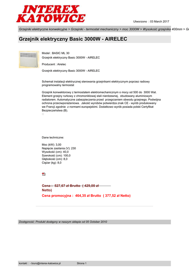 Utworzono : 03 March 2017 Grzejniki elektryczne konwekcyjne > Grzejniki - termostat mechaniczny > moc 3000W > Wysokość grzejnika 400mm > Gr Grzejnik elektryczny Basic 3000W - AIRELEC Model : BASIC ML 30 Grzejnik elektryczny Basic 3000W - AIRELEC Producent : Airelec Grzejnik elektryczny Basic 3000W - AIRELEC Schemat instalacji elektrycznej sterowania grzejnikami elektrycznym poprzez radiowy programowalny termostat Grzejnik konwektorowy z termostatem elektromechanicznym o mocy od 500 do 3000 Wat. Element grzejny rurkowy z chromoniklowej stali nierdzewnej, obudowany aluminiowym radiatorem. Automatyczne zabezpieczenia przed przegrzaniem obwodu grzejnego. Podwójna ochrona przeciwporażeniowa. Jakość wyrobów potwierdza znak CE - wyrób produkowany we Francji zgodnie z normami europejskimi. Dodatkowo wyrób posiada polski Certyfikat Bezpieczeństwa (B). � Dane techniczne: Moc (kW): 3,00 Napięcie zasilania (V): 230 Wysokość (cm): 40,0 Szerokość (cm): 100,0 Głębokość (cm): 8,0 Ciężar (kg): 8,0 Cena : 527,67 zł Brutto ( 429,00 zł Netto) Cena promocyjna : 464,35 zł Brutto ( 377,52 zł Netto) Dostępność: Produkt dostępny w naszym sklepie od 05 October 2010 kontakt : - [email protected] Strona 1
