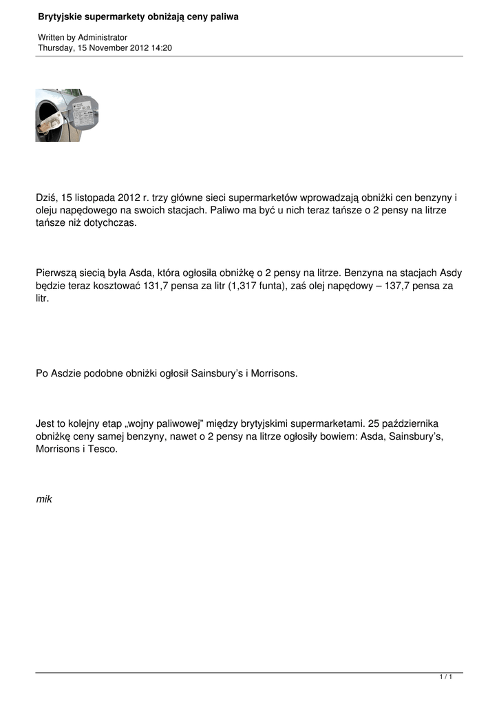 Brytyjskie supermarkety obniżają ceny paliwa Written by Administrator Thursday, 15 November 2012 14:20 Dziś, 15 listopada 2012 r. trzy główne sieci supermarketów wprowadzają obniżki cen benzyny i oleju napędowego na swoich stacjach. Paliwo ma być u nich teraz tańsze o 2 pensy na litrze tańsze niż dotychczas. Pierwszą siecią była Asda, która ogłosiła obniżkę o 2 pensy na litrze. Benzyna na stacjach Asdy będzie teraz kosztować 131,7 pensa za litr (1,317 funta), zaś olej napędowy – 137,7 pensa za litr. Po Asdzie podobne obniżki ogłosił Sainsbury’s i Morrisons. Jest to kolejny etap „wojny paliwowej” między brytyjskimi supermarketami. 25 października obniżkę ceny samej benzyny, nawet o 2 pensy na litrze ogłosiły bowiem: Asda, Sainsbury’s, Morrisons i Tesco. mik 1/1