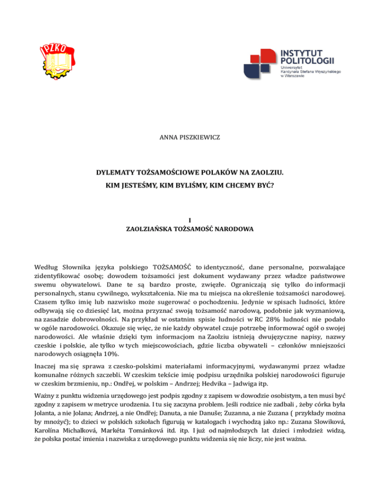 ANNA PISZKIEWICZ DYLEMATY TOŻSAMOŚCIOWE POLAKÓW NA ZAOLZIU. KIM JESTEŚMY, KIM BYLIŚMY, KIM CHCEMY BYĆ? I ZAOLZIAŃSKA TOŻSAMOŚĆ NARODOWA Według Słownika języka polskiego TOŻSAMOŚĆ to identyczność, dane personalne, pozwalające zidentyfikować osobę; dowodem tożsamości jest dokument wydawany przez władze państwowe swemu obywatelowi. Dane te są bardzo proste, zwięzłe. Ograniczają się tylko do informacji personalnych, stanu cywilnego, wykształcenia. Nie ma tu miejsca na określenie tożsamości narodowej. Czasem tylko imię lub nazwisko może sugerować o pochodzeniu. Jedynie w spisach ludności, które odbywają się co dziesięć lat, można przyznać swoją tożsamość narodową, podobnie jak wyznaniową, na zasadzie dobrowolności. Na przykład w ostatnim spisie ludności w RC 28% ludności nie podało w ogóle narodowości. Okazuje się więc, że nie każdy obywatel czuje potrzebę informować ogół o swojej narodowości. Ale właśnie dzięki tym informacjom na Zaolziu istnieją dwujęzyczne napisy, nazwy czeskie i polskie, ale tylko w tych miejscowościach, gdzie liczba obywateli – członków mniejszości narodowych osiągnęła 10%. Inaczej ma się sprawa z czesko-polskimi materiałami informacyjnymi, wydawanymi przez władze komunalne różnych szczebli. W czeskim tekście imię podpisu urzędnika polskiej narodowości figuruje w czeskim brzmieniu, np.: Ondřej, w polskim – Andrzej; Hedvika – Jadwiga itp. Ważny z punktu widzenia urzędowego jest podpis zgodny z zapisem w dowodzie osobistym, a ten musi być zgodny z zapisem w metryce urodzenia. I tu się zaczyna problem. Jeśli rodzice nie zadbali , żeby córka była Jolanta, a nie Jolana; Andrzej, a nie Ondřej; Danuta, a nie Danuše; Zuzanna, a nie Zuzana ( przykłady można by mnożyć); to dzieci w polskich szkołach figurują w katalogach i wychodzą jako np.: Zuzana Slowiková, Karolína Michalková, Markéta Tománková itd. itp. I już od najmłodszych lat dzieci i młodzież widzą, że polska postać imienia i nazwiska z urzędowego punktu widzenia się nie liczy, nie jest ważna. Zaolzie i Zaolziacy. Genius loci, genius populi I do kogo tu mieć pretensje?! Nauczyciel musi prowadzić ewidencję dziecka w myśl rozporządzeń ministerstwa spraw wewnętrznych, a więc w postaci zapisanej w metryce urodzenia czy dowodzie osobistym rodziców. Rodzice przeszli przez tę samą procedurę, więc raczej się niczemu nie dziwią. O ile absolwent kontynuuje dalszą naukę w polskiej placówce edukacyjnej (w chwili obecnej tylko jedynej – w Gimnazjum z Polskim Językiem Nauczania w Czeskim Cieszynie ), nie traci kontaktu z językiem i kulturą polską. Jeśli jednak znajdzie się w środowisku innym, a tak jest w większości wypadków, bo dwujęzyczne czesko-polskie klasy praktycznie przestały istnieć w szkołach ponadpodstawowych. Polska klasa zachowała się jeszcze w Akademii Handlowej w Czeskim Cieszynie. Jeśli chodzi o organizacje pozaszkolne, to stan jest następujący: Harcerstwo Polskie w RC liczy obecnie 6 drużyn harcerskich i 5 drużyn zuchowych, Stowarzyszenie Młodzieży Polskiej w RC liczy 76 rejestrowanych członków, fanów od 200 do 500 osób. Według słów prezesa SMP, dra Michała Przywary, dzisiejsza młodzież nie przykłada specjalnej wagi do zarejestrowanego członkostwa. Nowoczesne środki komunikacji umożliwiają łączność i kontakt bez względu na czas, miejsce i wiek. Najliczniejszą organizacją polską w RC jest stale Polski Związek Kulturalno-Oświatowy, który liczy obecnie do 12000 członków ( było ± 23000 ). PZKO dba o rozwój i szerzenie kultury polskiej w najszerszym tego słowa znaczeniu, organizuje także życie towarzyskie bez względu na przynależność narodową. Wiele naszych rodzin bowiem to przecież rodziny mieszane narodowościowo i nie wyobrażamy sobie działania bez zasad tolerancji i poszanowania godności człowieka bez względu na jego przekonania, wyznanie i narodowość. Dlatego też nie budzą entuzjazmu wśród większości naszych autochtonów polskie programy kabaretowe, wyśmiewające Czechów, a pojawia się ich coraz więcej.Trudno też zrozumieć spikerów radiowych i prezenterów TV, którym zabrakło dobrej woli, żeby chociaż częściowo zaznajomić się z językiem południowego sąsiada. Ciągle słyszymy, że był wielki czeski pisarz Capek (a nie Czapek), nowy model samochodu skoda (a nie szkoda) itp. A wystarczyłoby tylko zajrzeć do słownika i douczyć się, że č = cz, ř = rz, š = sz, ž = ż, ň = ń, ě = ie itd. Z drugiej strony nie zgadzamy się z różnymi teoriami na temat spolszczonych Morawców, o tysiącach zniemczonych i spolszczonych Czechów, o których pisze czeski poeta Petr Bezruč ( czytaj Bezrucz ). Strona Na terenie Zaolzia działały w okresie międzywojennym dziesiątki polskich organizacji społecznych, religijnych, spółek gospodarczych i klubów sportowych. Nie wszystkie przetrwały czy miały możliwość kontynuować działalność po II wojnie światowej. Wyżej wspomniane PZKO powstało w 1947 roku i miało zastąpić prawie wszystkie przedwojenne związki i organizacje. Drugą najliczniejszą organizacją jest Macierz Szkolna w RC. Liczba jej członków jest zależna od ilości dzieci w polskich szkołach, ponieważ członkowie to rodzice uczniów, a członkostwo w MSz zaczyna się zapisem dziecka do przedszkola lub szkoły i przeważnie kończy się z ukończeniem obowiązku szkolnego dziecka. Poszczególne Koła MSz przy szkołach organizują imprezy dla dzieci, dla rodziców, współpracują ściśle 2 My jednak kochamy ziemię przodków, ale szanujemy wszystkich, którzy tu mieszkają i też uważają ją za swoją ziemię ojczystą. Cieszy nas, że skończyły się czasy, kiedy pod byle jakim pretekstem mieliśmy pakować „kufry”, czyli walizki, i ruszać tam, skąd przyszliśmy. Nasi przodkowie znikąd nie przyszli, urodzili się tu, jeszcze w Monarchii Austro-Węg
