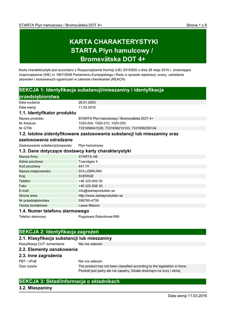 STARTA Plyn hamulcowy / Bromsvätska DOT 4+ Strona 1 z 6 KARTA CHARAKTERYSTYKI STARTA Plyn hamulcowy / Bromsvätska DOT 4+ Karta charakterystyki jest accordanc z Rozporządzenie Komisji (UE) 2015/830 z dnia 28 maja 2015 r. zmieniające rozporządzenie (WE) nr 1907/2006 Parlamentu Europejskiego i Rady w sprawie rejestracji, oceny, udzielania zezwoleń i stosowanych ograniczeń w zakresie chemikaliów (REACH) SEKCJA 1: Identyfikacja substancji/mieszaniny i identyfikacja przedsiębiorstwa Data wydania Data wersji 28.01.2003 11.03.2016 1.1. Identyfikator produktu Nazwa produktu Nr Artykułu Nr GTIN STARTA Plyn hamulcowy / Bromsvätska DOT 4+ 1020-204, 1020-210, 1020-255 7331656041028, 7331656210103, 7331656255104 1.2. Istotne zidentyfikowane zastosowania substancji lub mieszaniny oraz zastosowania odradzane Zastosowanie substancji/preparatu Płyn hamulcowy 1.3. Dane dotyczące dostawcy karty charakterystyki Nazwa firmy Adres pocztowy Kod pocztowy Nazwa miejscowości Kraj Telefon Faks E-mail Strona www Nr przedsiębiorstwa Osoba kontaktowa STARTA AB Torpvägen 4 441 74 SOLLEBRUNN SVERIGE +46 322-832 00 +46 322-836 30 [email protected] http://www.startaprodukter.se 556795-4739 Lasse Nilsson 1.4. Numer telefonu alarmowego Telefon alarmowy Pogotowie Ratunkowe:999 SEKCJA 2: Identyfikacja zagrożeń 2.1. Klasyfikacja substancji lub mieszaniny Klasyfikacja CLP, komentarze Nie ma zaleceń. 2.2. Elementy oznakowania 2.3. Inne zagrożenia PBT / vPvB Opis ryzyka Nie ma zaleceń. The product has not been classified according to the legislation in force. Produkt jest palny ale nie zapalny. Działa drażniąco na oczy i skórę SEKCJA 3: Skład/informacja o składnikach 3.2. Mieszaniny Data wersji 11.03.2016 STARTA Plyn hamulcowy / Bromsvätska DOT 4+ Nazwa komponentu 2-[2-(2-Butoksyetoksy)etoksy]etanol 2,2'-Oksybisetanol 2-(2-metoxietoxi)etanol 2-(2-Butoksyetoksy)etanol Komentarze o komponentach Strona 2 z 6 Identyfikacja Klasyfikacja Zawartość Nr CAS: 143-22-6 Eye Dam. 1; H318 < 20 % Nr EC: 205-592-6 Nr indeksu: 603-183-00-0 Nr CAS: 111-46-6 Acute tox. 4; H302 < 10 % Nr EC: 203-872-2 Nr indeksu: 603-140-00-6 Synonimy: 2,2'-Oksydietanol, aerozol Nr CAS: 111-77-3 Repr. 2;H361d; <3% Nr EC: 203-906-6 Nr indeksu: 603-096-00-8 Nr CAS: 112-34-5 Eye Irrit. 2; H319 <3% Nr EC: 203-961-6 Nr indeksu: 603-096-00-8 Synonimy: 2-(2Butoksyetoksy)etanol Pełen tekst wszystkich oświadczeń dotyczących zagrożenia został przedstawiony w sekcji 16. SEKCJA 4: Środki pierwszej pomocy 4.1. Opis środków pierwszej pomocy Wdychanie Kontakt ze skórą Kontakt z oczami Połykanie Niezwłocznie wynieść/wyprowadzić osobę narażoną na wdychanie na świeże powietrze. W przypadku utrzymującego się dyskomfortu skontaktować się z lekarzem. Zdjąć zanieczyszczoną odzież. Dokładnie umyć skórę wodą z mydłem. W przypadku utrzymującego się podrażnienia skontaktować się z lekarzem. Natychmiast płukać do 15 minut dużą ilością wody. Wyjąć ew. soczewki kontaktowe i szeroko otworzyć powieki. Jeśli podrażnienie nie znika: Udać się do lekarza, zabierając ze sobą niniejszą kartę charakterystyki preparatu. NIE WYWOŁYWAĆ WYMIOTÓW! Dokładnie wypłukać usta. Wypić dużą ilość wody. Zapewnić opiekę lekarską. Nie wolno podawać płynów osobom nieprzytomnym. 4.2. Najważniejsze ostre i opóźnione objawy oraz skutki narażenia Informacje dla pracowników służby zdrowia Najważniejsze objawy i skutki są opisane w punktach 2 i 11. 4.3. Wskazania dotyczące wszelkiej natychmiastowej pomocy lekarskiej i szczególnego postępowania z poszkodowanym Inne informacje Nie ma określonego sposobu leczenia nadmiernej ekspozycji powinna być skoncentrowana na monitorowanie objawów i stanu klinicznego pacjenta. SEKCJA 5: Postępowanie w przypadku pożaru 5.1. Środki gaśnicze Właściwe środki gaśnicze Nieprawidłowe środki gaśnicze Gasić pożar gaśnicą pianową (pianą alkoholoodporną), śniegową CO2, proszkową albo mgłą wodną. Nie gasić pożaru strumieniem wody, gdyż spowoduje to rozprzestrzenienie się ognia. 5.2. Szczególne zagrożenia związane z substancją lub mieszaniną Ryzyko pożaru i wybuchu Wskutek pożaru mogą wydzielać się gazy stanowiące zagrożenie dla zdrowia. 5.3. Informacje dla straży pożarnej Procedury przeciwpożarowe Nie podano żadnych szczególnych procedur gaszenia pożaru. Data wersji 11.03.2016 STARTA Plyn hamulcowy / Bromsvätska DOT 4+ Strona 3 z 6 SEKCJA 6: Postępowanie w przypadku niezamierzonego uwolnienia do środowiska 6.1. Indywidualne środki ostrożności, wyposażenie ochronne i procedury w sytuacjach awaryjnych Środki ochrony osobistej W sprawie indywidualnych środków ochrony - patrz pkt 8. 6.2. Środki ostrożności w zakresie ochrony środowiska Środki bezpieczeństwa dotyczące środowiska Unikać odprowadzania do kanalizacji, gruntu lub cieków wodnych. Ograniczyć wyciek piaskiem, ziemią albo innym materiałem chłonnym. O wycieku i niekontrolowanym zrzucie do cieków wodnych należy NATYCHMIAST poinformować odpowiedni organ nadzoru rzecznego albo inne właściwe władze. 6.3. Metody i materiały zapobiegające rozprzestrzenianiu się skażenia i służące do usuwania skażenia Metody czyszczenia Materiał rozsypany lub rozlany zasypać piaskiem, ziemią lub inną substancją niepalną, co ograniczy jego rozprzestrzenianie. Przenieść do pojemnika do usunięcia. Spłukać teren wodą. 6.4. Odniesienia do innych sekcji Dodatkowe informacje Zobacz pkt 13 zarządzania odpadami. SEKCJA 7: Postępowanie z substancjami i mieszaninami oraz ich magazynowanie 7.1. Środki ostrożności dotyczące bezpiecznego postępowania Przemieszczanie Unikać wdychania mgły aerozoli oraz kontaktu ze skórą i oczami. 7.2. Warunki bezpiecznego magazynowania, łącznie z informacjami dotyczącymi wszelkich wzajemnych niezgodności Magazynowanie Przechowywać w szczelnie zamkniętym oryginalnym opakowaniu. 7.3. Szczególne zastosowanie(-a) końcowe SEKCJA