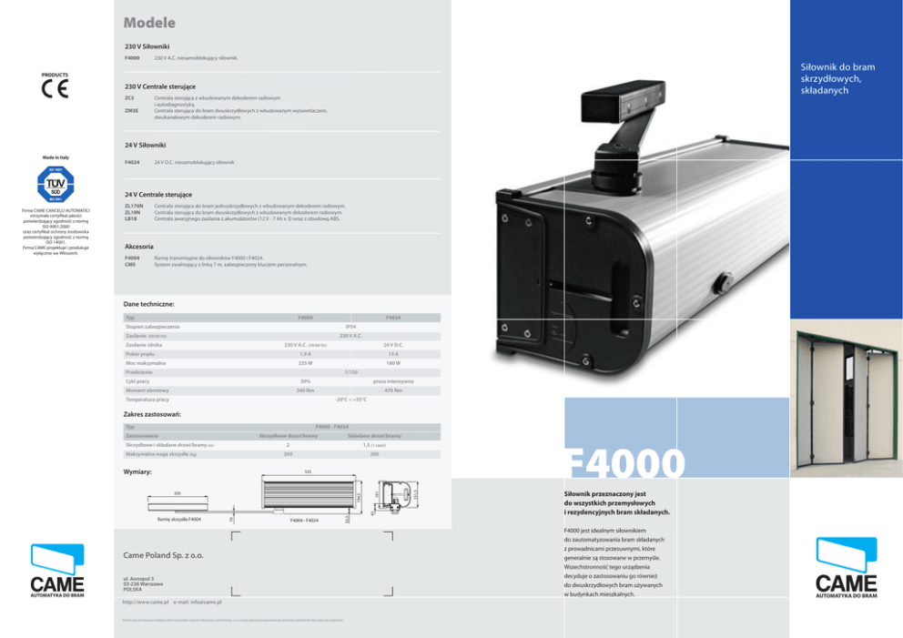 Modele 230 V Siłowniki F4000 230 V A.C. niesamoblokujący siłownik. Siłownik do bram skrzydłowych, składanych PRODUCTS 230 V Centrale sterujące ZC3 Centrala sterująca z wbudowanym dekoderem radiowym i autodiagnostyką. Centrala sterująca do bram dwuskrzydłowych z wbudowanym wyświetlaczem, dwukanałowym dekoderem radiowym. ZM3E 24 V Siłowniki Made in Italy F4024 24 V D.C. niesamoblokujący siłownik 24 V Centrale sterujące Firma CAME CANCELLI AUTOMATICI otrzymała certyfikat jakości potwierdzający zgodność z normą ISO 9001:2000 oraz certyfikat ochrony środowiska potwierdzający zgodność z normą ISO 14001. Firma CAME projektuje i produkuje wyłącznie we Włoszech. ZL170N ZL19N LB18 Centrala sterująca do bram jednoskrzydłowych z wbudowanym dekoderem radiowym. Centrala sterująca do bram dwuskrzydłowych z wbudowanym dekoderem radiowym. Centrala awaryjnego zasilania z akumulatorów (12 V - 7 Ah x 3) wraz z obudową ABS. Akcesoria F4004 CMS Ramię transmisyjne do siłowników F4000 i F4024. System zwalniający z linką 7 m, zabezpieczony kluczem personalnym. Dane techniczne: Typ F4000 F4024 Stopień zabezpieczenia Zasilanie IP54 230 V A.C. (50/60 Hz) Zasilanie silnika 24 V D.C. 230 V A.C. (50/60 Hz) Pobór prądu 1,9 A 15 A Moc maksymalna 235 W 180 W Przełożenie 1/150 Cykl pracy 30% Moment obrotowy praca intensywna 340 Nm 470 Nm Temperatura pracy -20°C ÷ +55°C Zakres zastosowań: Typ F4000 - F4024 Zastosowanie Skrzydłowe i składane drzwi/bramy (m) Maksymalna waga skrzydła (kg) Wymiary: Skrzydłowe drzwi/bramy Składane drzwi/bramy 2 1,5 (1 część) 300 200 F4000 F4004 - F4024 Came Poland Sp. z o.o. ul. Annopol 3 03-236 Warszawa POLSKA AUTOMATYKA DO BRAM http://www.came.pl e-mail: [email protected] Wszelkie dane prezentowane w niniejszej ulotce mają charakter wyłącznie informacyjny. Came Poland Sp. z o.o. zastrzega sobie prawo wprowadzania bez uprzedzenia jakichkolwiek zmian, które uzna za konieczne. 151,5 Siłownik przeznaczony jest do wszystkich przemysłowych i rezydencyjnych bram składanych. 33,5 Ramię skrzydła F4004 10 42 194,5 350 161 555 F4000 jest idealnym siłownikiem do zautomatyzowania bram składanych z prowadnicami przesuwnymi, które generalnie są stosowane w przemyśle. Wszechstronność tego urządzenia decyduje o zastosowaniu go również do dwuskrzydłowych bram używanych w budynkach mieszkalnych. AUTOMATYKA DO BRAM F4000 Kompaktowy siłownik o dużej mocy 230 V Elektronika Nowa technologia zastosowana w centralach sterujących przeznaczonych do siłowników serii F zapewnia specjalne polecenia oraz funkcje bezpieczeństwa już w podstawowej wersji. Jednakże dostępne są dodatkowe centrale sterujące które umożliwiają uzyskanie szerszej możliwości regulacji i większej ilości funkcji ułatwiających obsługę. Przykładowo: Seria siłowników F to idealne rozwiązanie do zautomatyzowania bram składanych z prowadnicami przesuwnymi. Przymocowane, w zależności od dostępnej przestrzeni, do nadproża lub skrzydła bramy, siłowniki serii F zapewniają bezpieczny, liniowy ruch bram średniej lub dużej wielkości. Produkty z tej serii mogą być również stosowane do bram skrzydłowych używanych w budynkach mieszkalnych. Słowa klucze: Duża Moc! Eleganckie i kompaktowe. Siłowniki serii F zostały tak zaprojektowane aby można je było łatwo i szybko zainstalować nie kolidując z estetyką bramy i urządzenia. Łatwa w użyciu płyta montażowa. Siłowniki F4000 i F4024 wyposażone są w wykonaną ze stopu aluminium płytę montażową, która zapewnia szybką instalację na skrzydle bramy lub nadprożu. > Testy funkcji bezpieczeństwa aktywowane w systemie automatyki przed każdym ruchem bramy: otwarciem lub zamknięciem. > Funkcja FURTKI Dzięki otwarciu częściowemu tylko jednej części bramy możliwe jest przejście pieszych. > Pełna kontrola bramy z zastosowaniem pilota umożliwia natychmiastowe zatrzymanie bramy. Zalety 24 V elektroniki Kiedy wymagany jest maksymalny poziom komfortu i bezpieczeństwa, 24 V technologia dostarcza wielu dodatkowych możliwości, w szczególności: > Brak przerw w zasilaniu Zasilana 24 V elektronika automatycznie wykrywa przerwy w zasilaniu i aktywuje baterie awaryjnego zasilania, gwarantując w każdej chwili możliwość otwarcia bramy lub jej zamknięcia (opcjonalnie). > Wzmożony ruch Niskonapięciowy siłownik gwarantuje sprawną i pewną pracę, zarówno w systemach dla wielu użytkowników, jak i przeznaczonych do obiektów przemysłowych. > Szybkie otwieranie W trosce o najdrobniejsze szczegóły, 24 V elektronika umożliwia regulację szybkości pracy systemu z opcją miękkiego, łagodnego domykania. > Wykrywanie przeszkód Specjalna płyta sterująca stale analizuje właściwy ruch skrzydeł bramy, zatrzymując lub cofając ją, w momencie wykrycia przeszkody. Standardowa instalacja: Jeden model prawo lub lewostronny. Siłowniki F4000 i F4024 zostały tak zaprojektowane aby instalacja była możliwa zarówno z prawej jak i z lewej strony. Oznacza to, że siłowniki mają po dwa wejścia dla ramienia przenoszącego napęd. Puszka na połączenia elektryczne Ramię uchylne Siłownik F4000 - F4024 Lampa ostrzegawcza Antena Centrala sterująca Stacyjka kluczykowa Silne wewnętrznie i zewnętrznie. Siłowniki F4000 i F4024 zostały zaprojektowane tak aby były łatwe w instalacji bez żadnych kompromisów jeżeli chodzi o estetykę. Nawet do zewnętrznej instalacji. Siłowniki F4000 i F4024 zostały zaprojektowane również do użytku zewnętrznego. Posiadają odpowiednie uszczelnienia i są odporne na niekorzystne działanie sił natury. Puszka na połączenia elektryczne Specjalne ramię transmisyjne. Zaprojektowane z myślą o bramach składanych. Daje się bardzo łatwo przymocować zarówno do skrzydła bramy jak i do nadproża w zależności od specyfiki instalacji. Wysprzęglenie z zewnątrz Mechaniczne listwy zabezpieczające Fotokomórki Kolumna pod fotokomórki Fotokom