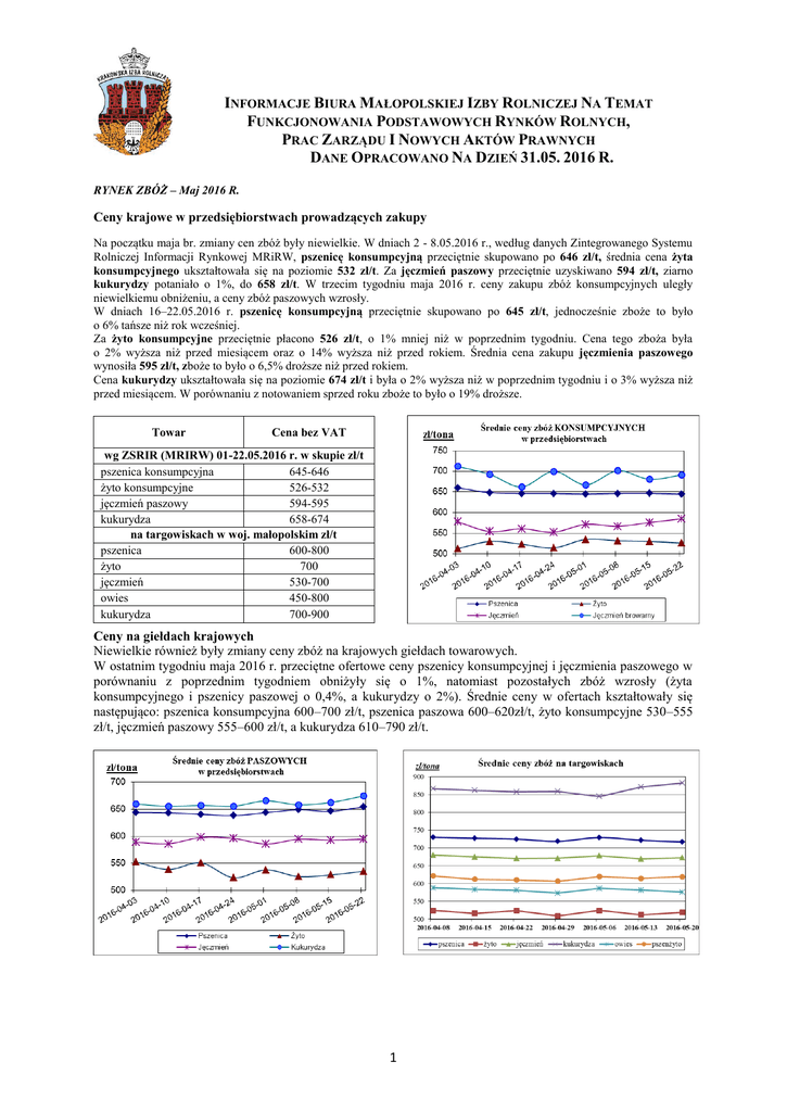 INFORMACJE BIURA MAŁOPOLSKIEJ IZBY ROLNICZEJ NA TEMAT FUNKCJONOWANIA PODSTAWOWYCH RYNKÓW ROLNYCH, PRAC ZARZĄDU I NOWYCH AKTÓW PRAWNYCH DANE OPRACOWANO NA DZIEŃ 31.05. 2016 R. RYNEK ZBÓŻ – Maj 2016 R. Ceny krajowe w przedsiębiorstwach prowadzących zakupy Na początku maja br. zmiany cen zbóż były niewielkie. W dniach 2 - 8.05.2016 r., według danych Zintegrowanego Systemu Rolniczej Informacji Rynkowej MRiRW, pszenicę konsumpcyjną przeciętnie skupowano po 646 zł/t, średnia cena żyta konsumpcyjnego ukształtowała się na poziomie 532 zł/t. Za jęczmień paszowy przeciętnie uzyskiwano 594 zł/t, ziarno kukurydzy potaniało o 1%, do 658 zł/t. W trzecim tygodniu maja 2016 r. ceny zakupu zbóż konsumpcyjnych uległy niewielkiemu obniżeniu, a ceny zbóż paszowych wzrosły. W dniach 16–22.05.2016 r. pszenicę konsumpcyjną przeciętnie skupowano po 645 zł/t, jednocześnie zboże to było o 6% tańsze niż rok wcześniej. Za żyto konsumpcyjne przeciętnie płacono 526 zł/t, o 1% mniej niż w poprzednim tygodniu. Cena tego zboża była o 2% wyższa niż przed miesiącem oraz o 14% wyższa niż przed rokiem. Średnia cena zakupu jęczmienia paszowego wynosiła 595 zł/t, zboże to było o 6,5% droższe niż przed rokiem. Cena kukurydzy ukształtowała się na poziomie 674 zł/t i była o 2% wyższa niż w poprzednim tygodniu i o 3% wyższa niż przed miesiącem. W porównaniu z notowaniem sprzed roku zboże to było o 19% droższe. Towar Cena bez VAT wg ZSRIR (MRIRW) 01-22.05.2016 r. w skupie zł/t pszenica konsumpcyjna 645-646 żyto konsumpcyjne 526-532 jęczmień paszowy 594-595 kukurydza 658-674 na targowiskach w woj. małopolskim zł/t pszenica 600-800 żyto 700 jęczmień 530-700 owies 450-800 kukurydza 700-900 Ceny na giełdach krajowych Niewielkie również były zmiany ceny zbóż na krajowych giełdach towarowych. W ostatnim tygodniu maja 2016 r. przeciętne ofertowe ceny pszenicy konsumpcyjnej i jęczmienia paszowego w porównaniu z poprzednim tygodniem obniżyły się o 1%, natomiast pozostałych zbóż wzrosły (żyta konsumpcyjnego i pszenicy paszowej o 0,4%, a kukurydzy o 2%). Średnie ceny w ofertach kształtowały się następująco: pszenica konsumpcyjna 600–700 zł/t, pszenica paszowa 600–620zł/t, żyto konsumpcyjne 530–555 zł/t, jęczmień paszowy 555–600 zł/t, a kukurydza 610–790 zł/t. 1 RYNEK TRZODY CHLEWNEJ I ŻYWCA WOŁOWEGO W trzecim tygodniu maja br. odnotowano dalszy wzrost krajowych cen zakupu trzody chlewnej, bydła i kurcząt oraz cen zbytu półtusz wieprzowych i tuszek kurcząt. Ceny skupu indyków oraz zbytu tuszek indyczych ukształtowały się na poziomie z poprzedniego tygodnia. Trzoda chlewna Ceny zakupu żywca W dniach 16–22.05.2016 r. zakłady mięsne objęte Zintegrowanym Systemem Rolniczej Informacji Rynkowej MRiRW kupowały żywiec wieprzowy przeciętnie po 4,62 zł/kg, o 3% drożej niż tydzień wcześniej i o 13% drożej przed miesiącem. Jednocześnie żywiec ten był o 8% droższy niż w analogicznym okresie 2015 r. Krajowe ceny zbytu mięsa W trzecim tygodniu miesiąca zakłady mięsne zbywały półtusze wieprzowe przeciętnie po 6,70 zł/kg, o 4% drożej niż w po przednim tygodniu. W ciągu miesiąca półtusze te podrożały o 11%, a w ciągu roku o 9%. Towar Cena VAT bez Zmiana tyg. Wg ZSRJR (MRiRW) 16-22.05.2016 r. w skupie zł/kg żywiec wieprzowy 4,62 żywiec wołowy 6,21 kurczęta typu brojler 3,48 indyki 5,22 w zbycie zł/kg półtusze wieprzowe 6,70 ćwierćtusze wołowe 12,27 tuszki kurcząt 6,00 „65%” tuszki indyków 8,85 na targowiskach zł/szt. prosięta 149,80 Klasa półtusz wieprzowych wg SEUROP CENA [zł/tonę] [MPS] 01.05. 2016 29.05. 2016 [MPC] 01.05. 2016 29.05. 2016 POLSKA klasa S 5 585 6 299 5 476 6 175 klasa E 5 521 6 200 5 413 6 079 klasa U 5 114 5 754 5 014 5 641 klasa R 4 681 5 275 4 589 5 171 klasa O 4 155 4 648 4 073 4 557 klasa P 3 483 3 647 3 415 3 576 mmpc – masa poubojowa ciepła, poubojowa schłodzona mps – masa Utrzymujące się od dłuższego czasu niekorzystne dla producentów żywca wieprzowego relacje cen spowodowały redukcję krajowego pogłowia świń. Według wstępnych danych GUS opublikowanych 20 maja 2016 r., na początku marca krajowe pogłowie trzody chlewnej liczyło niecałe 10,2 mln sztuk, o 11,5% (tj. o 1,3 mln sztuk) mniej niż przed rokiem. Ograniczenie pogłowia odnotowano we wszystkich województwach, najmniejsze (o niecałe 5%) w woj. lubelskim, a największe (o ponad 16%) w woj. lubuskim i warmińsko -mazurskim. W woj. wielkopolskim, w którym jest utrzymywane ponad 35% krajowego pogłowia świń, spadek tak jak średnio w kraju wyniósł 11,5%. Zmniejszenie liczebności nastąpiło we wszystkich grupach produkcyjno-użytkowych, a największe w przypadku loch (o 16,1%), zwłaszcza loch prośnych (16,6%). Biorąc pod uwagę zmiany liczebności poszczególnych grup oraz strukturę stada, analitycy ARR oceniają, że w kolejnych miesiącach w Polsce można spodziewać się pogłębienia spadku pogłowia świń. Zmiany w pogłowiu zapowiadają zmniejszenie krajowej produkcji żywca wieprzowego w 2016 Ceny prosiąt za parę na wybranych targowiskach w Małopolsce (15-21.05.2016 r.) Miejscowość Cena/para Wadowice 300 Krościenko 440 Łącko 440 Proszowice 320 Bydło Za żywiec wołowy w trzecim tygodniu miesiąca (według ZSRIR MRiRW) płacono przeciętnie 6,21 zł/kg, o 1% więcej niż tydzień wcześniej i o 4% więcej niż przed miesiącem. Jednocześnie cena ta była o 0,5% wyższa niż w porównywalnym okresie ubiegłego roku. Średnia unijna cena bydła rzeźnego klasy R3 ukształtowała się na poziomie 360,71 EUR za 100 kg masy poubojowej schłodzonej i była zbliżona do notowanej tydzień wcześniej, ale o 5% niższa niż przed rokiem. W Polsce w przeliczeniu na walutę unijną bydło rzeźne klasy R3 kupowano po 300,78 EUR za 100 kg. Niższe niż w naszym kraju ceny bydła tej klasy odnotowano jedynie na Łotwie, w Rumunii i na Litwie