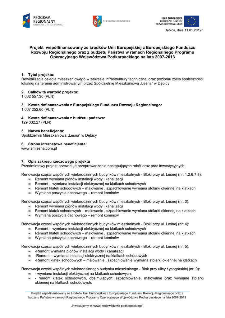 Dębica, dnia 11.01.2012r. Projekt współfinansowany ze środków Unii Europejskiej z Europejskiego Funduszu Rozwoju Regionalnego oraz z budżetu Państwa w ramach Regionalnego Programu Operacyjnego Województwa Podkarpackiego na lata 2007-2013 1. Tytuł projektu: Rewitalizacja osiedla mieszkaniowego w zakresie infrastruktury technicznej oraz poziomu życia społeczności lokalnej na terenie administrowanym przez Spółdzielnię Mieszkaniową „Leśna” w Dębicy 2. Całkowita wartość projektu: 1 662 557,30 (PLN) 3. Kwota dofinansowania z Europejskiego Funduszu Rozwoju Regionalnego: 1 067 252,60 (PLN) 4. Kwota dofinansowania z budżetu państwa: 129 332,27 (PLN) 5. Nazwa beneficjenta: Spółdzielnia Mieszkaniowa „Leśna” w Dębicy 6. Strona internetowa beneficjenta: www.smlesna.com.pl 7. Opis zakresu rzeczowego projektu Przedmiotowy projekt przewiduje przeprowadzenie następujących robót oraz prac inwestycyjnych: Renowacja części wspólnych wielorodzinnych budynków mieszkalnych - Bloki przy ul. Leśnej (nr: 1,2,6,7,8): • Remont wymiana pionów instalacji wody i kanalizacji • Remont – wymiana instalacji elektrycznej na klatkach schodowych • Remont klatek schodowych – malowanie , szpachlowanie wymiana stolarki okiennej na klatkach • Wymiana poszycia dachowego – remont kominów Renowacja części wspólnych wielorodzinnych budynków mieszkalnych - Bloki przy ul. Leśnej (nr: 3): • Remont wymiana pionów instalacji wody i kanalizacji • Remont klatek schodowych – malowanie , szpachlowanie wymiana stolarki okiennej na klatkach • Wymiana poszycia dachowego – remont kominów Renowacja części wspólnych wielorodzinnych budynków mieszkalnych - Bloki przy ul. Leśnej (nr: 4): • Remont – wymiana instalacji elektrycznej na klatkach schodowych • Remont klatek schodowych – malowanie , szpachlowanie wymiana stolarki okiennej na klatkach • Wymiana poszycia dachowego – remont kominów Renowacja części wspólnych wielorodzinnych budynków mieszkalnych - Bloki przy ul. Leśnej (nr: 5): • -Remont wymiana pionów instalacji wody i kanalizacji • -Remont – wymiana instalacji elektrycznej na klatkach schodowych • -Remont klatek schodowych – malowanie , szpachlowanie wymiana stolarki okiennej na klatkach Renowacja części wspólnych wielorodzinnego budynku mieszkalnego - Blok przy ulicy Łysogórskiej (nr: 9): • - wymiana instalacji elektrycznej na klatkach schodowych; • - remont klatek schodowych, obejmujących: szpachlowanie, malowanie oraz wymianę stolarki okiennej na klatkach schodowych. Projekt współfinansowany ze środków Unii Europejskiej z Europejskiego Funduszu Rozwoju Regionalnego oraz z budżetu Państwa w ramach Regionalnego Programu Operacyjnego Województwa Podkarpackiego na lata 2007-2013 „Inwestujemy w rozwój województwa podkarpackiego” Renowacja części wspólnych wielorodzinnego budynku mieszkalnego - Blok przy ulicy Łysogórskiej (nr: 11): • - wymiana instalacji wewnętrznych (pionów wodno-kanalizacyjnych); • - wymiana instalacji elektrycznej w częściach wspólnych (na klatkach schodowych); • - remont klatek schodowych tj. wymiana stolarki okiennej na klatkach, szpachlowanie i malowanie. Poprawa bezpieczeństwa obiektów wraz z otoczeniem na wypadek zagrożeń: • montaż instalacji monitoringu i zabezpieczenia terenu osiedla; • kontrola pożarów poprzez montaż czujników dymu w częściach wspólnych wielorodzinnych budynków mieszkalnych; • odpowiednie oznakowanie obiektów i całego terenu, w tym dostosowanie do potrzeb osób niepełnosprawnych. Wprowadzenie udogodnień dla użytkowników poprzez poprawę jakości infrastruktury komunikacyjnej: • remont traktów pieszych (w tym wymiana chodników) obejmujący: usuniecie starej nawierzchni, przygotowanie • podłoża, położenie nowego chodnika; • remont wewnętrznych dróg dojazdowych (wymiana nawierzchni); • wykonanie miejsc postojowych z wydzieleniem specjalnych, oznakowanych miejsc dla osób niepełnosprawnych. Poprawa infrastruktury sportowo-rekreacyjnej – renowacja osiedlowego boiska (pow. 1 168 m2) 8. Data rozpoczęcia realizacji projektu: 2010-03-15 9. Planowana data zakończenia rzeczowej realizacji projektu: 2012-11-14 10. Planowana data przedstawienia końcowego wniosku o płatność: 2013-01-31 Projekt współfinansowany ze środków Unii Europejskiej z Europejskiego Funduszu Rozwoju Regionalnego oraz z budżetu Państwa w ramach Regionalnego Programu Operacyjnego Województwa Podkarpackiego na lata 2007-2013 „Inwestujemy w rozwój województwa podkarpackiego”