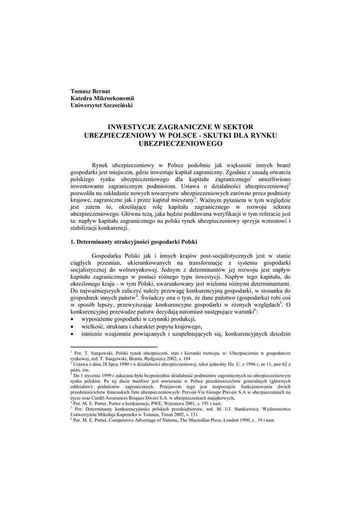 Tomasz Bernat Katedra Mikroekonomii Uniwersytet Szczeciński INWESTYCJE ZAGRANICZNE W SEKTOR UBEZPIECZENIOWY W POLSCE - SKUTKI DLA RYNKU UBEZPIECZENIOWEGO Rynek ubezpieczeniowy w Polsce podobnie jak większość innych branż gospodarki jest miejscem, gdzie inwestuje kapitał zagraniczny. Zgodnie z zasadą otwarcia polskiego rynku ubezpieczeniowego dla kapitału zagranicznego1 umożliwiono inwestowanie zagranicznym podmiotom. Ustawa o działalności ubezpieczeniowej2 pozwoliła na zakładanie nowych towarzystw ubezpieczeniowych zarówno przez podmioty krajowe, zagraniczne jak i przez kapitał mieszany3. Ważnym pytaniem w tym względzie jest zatem to, określające rolę kapitału zagranicznego w rozwoju sektora ubezpieczeniowego. Główna tezą, jaka będzie poddawana weryfikacji w tym referacie jest ta: napływ kapitału zagranicznego na polski rynek ubezpieczeniowy sprzyja wzrostowi i stabilizacji konkurencji. 1. Determinanty atrakcyjności gospodarki Polski Gospodarka Polski jak i innych krajów post-socjalistycznych jest w stanie ciągłych przemian, ukierunkowanych na transformacje z systemu gospodarki socjalistycznej do wolnorynkowej. Jednym z determinantów jej rozwoju jest napływ kapitału zagranicznego w postaci różnego typu inwestycji. Napływ tego kapitału, do określonego kraju - w tym Polski, uwarunkowany jest wieloma różnymi determinantami. Do najważniejszych zaliczyć należy przewagę konkurencyjną gospodarki, w stosunku do gospodarek innych państw4. Świadczy ona o tym, że dane państwo (gospodarka) robi coś w sposób lepszy, przewyższając konkurencyjne gospodarki w róznych względach5. O konkurencyjnej przewadze państw decydują natomiast następujące warunki6: • wyposażenie gospodarki w czynniki produkcji, • wielkość, struktura i charakter popytu krajowego, • istnienie wzajemnie powiązanych i uzupełniających się, konkurencyjnych dziedzin 1 Por. T. Sangowski, Polski rynek ubezpieczeń, stan i kierunki rozwoju, w: Ubezpieczenia w gospodarcze rynkowej, red. T. Sangowski, Branta, Bydgoszcz 2002, s. 184 2 Ustawa z dnia 28 lipca 1990 r o działalności ubezpieczeniowej, tekst jednolity Dz. U. z 1996 r, nr 11, poz 62 z późn. zm. 3 Do 1 stycznia 1999 r zakazana była bezpośrednia działalność podmiotów zagranicznych na ubezpieczeniowym rynku polskim. Po tej dacie możliwe jest otwieranie w Polsce przedstawicielstw generalnych (głównych oddziałów) podmiotów zagranicznych. Przejawem tego jest rozpoczęcie funkcjonowania dwóch przedstawicielstw francuskich firm ubezpieczeniowych: Prevoir-Vie Groupe Prevoir S.A w ubezpieczeniach na życie oraz Cardif-Assurances Risques Divers S.A. w ubezpieczeniach majątkowych. 4 Por. M. E. Porter, Porter o konkurencji, PWE, Warszawa 2001, s. 191 i nast. 5 Por. Determinanty konkurencyjności polskich przedsiębiorstw, red. M. UJ. Stankiewicz, Wydawnictwo Uniwersytetu Mikołaja Kopernika w Toruniu, Toruń 2002, s. 131 6 Por. M. E. Porter, Competetive Adventage of Nations, The Macmillan Press, London 1990, s . 19 i nast. 166 Państwo i rynek w gospodarce wytwórczości, strategie realizowane przez firmy krajowe oraz charakter rywalizacji na rynku krajowym. Bazując na powyższych założeniach konkurencyjności gospodarki polskiej, przytoczyć należy wyniki badań dotyczących motywacji inwestorów zagranicznych oraz barier inwestowania w krajach europy Środkowo-wschodniej7. W odniesieniu do Polski inwestorzy zagraniczni wyróżnili 5 najważniejszych motywów inwestycyjnych. Są to: 1. koszty czynnika pracy (relatywnie niższe niż w krajach Unii), 2. duży chłonny rynek (Polska to przecież prawie 40 milionów osób), 3. łatwość zdobycia lub powiększenia udziałów na rynkach lokalnych, 4. dostępność do wykwalifikowanej siły roboczej, przy stosunkowo niskich kosztach pracy (dodać należałoby tutaj stale i szybko rosnąca liczbę osób z wyższym wykształceniem), 5. położenie geograficzne (centrum Europy i jednocześnie bliskość do olbrzymiego, choć na razie biednego rynku rosyjskiego). Jak widać z powyższego porównanie Polska stanowi kraj mogący posiadać przewagę konkurencyjna w zdobywaniu dużych inwestycji zagranicznych8. Analiza głównych uwarunkowań funkcjonowania zagranicznych inwestycji bezpośrednich w Polsce prowadzi do wniosku, iż dla większego zaangażowania się kapitałów zagranicznych w Polsce konieczne są działania zwiększające konkurencyjność gospodarki na poziomie przedsiębiorstw, branż, regionów oraz ich makrootoczenia9. Obok wymienionych wyżej argumentów przemawiających za inwestowaniem w Polsce, do dodatkowych atutów naszego kraju i gospodarki zaliczyć należy: wyniki ekonomiczne gospodarki (względnie wysoki w ostatnich latach wzrost gospodarczy, malejącą inflację, wzmacniającą się złotówkę), konsekwentna politykę reform politykę otwarcia gospodarczego i liberalizację handlu oraz starania o wejście do Unii Europejskiej (niemalże sfinalizowane). Na potwierdzenie powyższych informacji, tabela 1 prezentuje najważniejsze dane dotyczące polski w ostatnich latach. • Tabela 1 Polska, wybrane dane gospodarcze Wskaźnik 1995 1996 1997 1998 1999 2000 2001 2002 PKB (% zmiana) 6.9 5.9 6.8 4.8 4.1 4.0 1.0 1.0 PKB w mld USD 126.6 142.8 143.1 157.5 154.1 158.8 176.4 187.8 PKB- per capita w USD 3,280.81 3,697.76 3,702.46 4,073.35 3,986.65 4,108.24 4,559 4,881 Średnia inflacja 25.4 12.4 12.2 7.3 5.7 7.8 1.6 1,4* Stopa bezrobocia (w %) 14.9 13.2 10.3 10.4 13.1 15.1 17.4 18.6* Saldo handlu -6.2 -12.7 -16.6 -18.8 -18.5 -17.3 -14.2 - 7,9* zagranicznego w mld USD Zagraniczne inwestycje 2.5 5.2 5.7 9.6 7.9 10.6 7.1 3,27** bezpośrednie w mld USD 7 Por. J. Witkowska, Motywacje inwestorów zagranicznych - aspekty porównawcze, w: Bezpośrednie inwestycje zagraniczne w Polsce, PWE, Warszawa 1998, s. 78-84 8 W wymienionych badaniach wykazano także istotne bariery inwestycyjne. Zaliczono do nich przede wszystkim dwie: trudności w znalezieniu lokaln