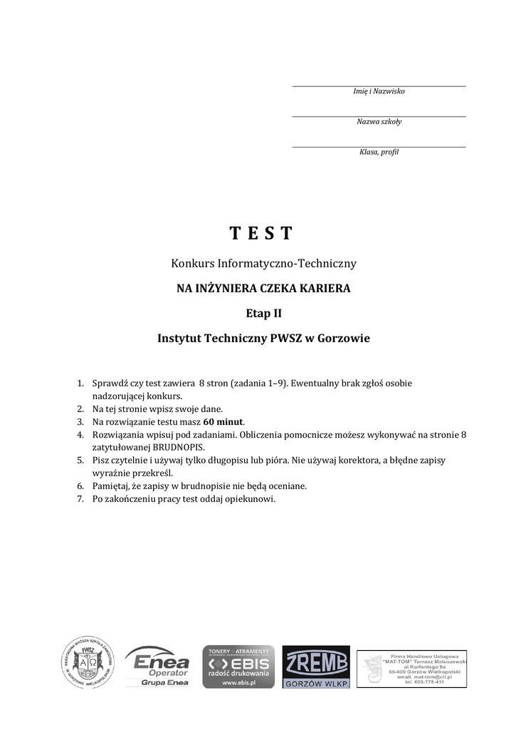 Imię i Nazwisko Nazwa szkoły Klasa, profil TEST Konkurs Informatyczno-Techniczny NA INŻYNIERA CZEKA KARIERA Etap II Instytut Techniczny PWSZ w Gorzowie 1. Sprawdź czy test zawiera 8 stron (zadania 1–9). Ewentualny brak zgłoś osobie nadzorującej konkurs. 2. Na tej stronie wpisz swoje dane. 3. Na rozwiązanie testu masz 60 minut. 4. Rozwiązania wpisuj pod zadaniami. Obliczenia pomocnicze możesz wykonywać na stronie 8 zatytułowanej BRUDNOPIS. 5. Pisz czytelnie i używaj tylko długopisu lub pióra. Nie używaj korektora, a błędne zapisy wyraźnie przekreśl. 6. Pamiętaj, że zapisy w brudnopisie nie będą oceniane. 7. Po zakończeniu pracy test oddaj opiekunowi. Zadania za 3 punkty 1. Mamy dwa czerpaki o pojemnościach m i n oraz pusty pojemnik o nieograniczonej objętości i nieograniczoną ilość wody. Podać sposób napełnienia pojemnika 5 litrami wody, gdy m = 7, a n = 3, przy czym można wlewać do pojemnika lub wylewać tylko pełnymi czerpakami. Podaj ogólny warunek rozwiązalności tego zadania dla m, n i k (niech k oznacza ilość wody, którą chcemy napełnić pojemnik). Rozwiązanie zadania 1: 2. Śpioch, mieszkający przy pętli tramwajowej, wybrał się w odwiedziny do przyjaciela, który mieszkał na przeciwległej pętli. Śpioch wsiadł do tramwaju, ale po przejechaniu siedmiu przystanków zmorzył go sen. Przespał połowę trasy, a kiedy się ocknął, tramwaj jechał już w kierunku powrotnym. Śpioch jął medytować nad uciążliwością natury śpiocha i tak minął czas do pętli, przy której mieszkał. Tramwaj zawrócił. Tym razem w drodze do przyjaciela Śpioch wytrzymał osiem przystanków i znów się zdrzemnął, bo był śpiochem. Przespał jedną trzecią trasy. Kiedy się obudził, stwierdził z ulgą, że tramwaj jeszcze nie dojechał do końcowej pętli. Ile przystanków dzieliło pętlę Śpiocha od pętli przyjaciela? 2|Strona Instytut Techniczny PWSZ w Gorzowie Wielkopolskim I Konkurs Informatyczno - Techniczny Na Inżyniera Czeka Kariera Rozwiązanie zadania 2: 3. Powszechnie wiadomo, że króliczą pasją jest chrupanie marchewek. Otóż, dwa króliki zjadają zwykle trzy marchewki w cztery minuty. Jeśli podnieść dane wyjściowe do kwadratu, pytanie brzmi: w jakim czasie czterech marchewkojadów spałaszuje dziewięć marchewek? Rozwiązanie zadania 3: Instytut Techniczny PWSZ w Gorzowie Wielkopolskim 3|Strona 4. Przed wynalezieniem przez Fenicjan pieniędzy, na targowiskach niepodzielnie panował handel wymienny. Zadanie dotyczy drobiowego wycinka tych wymiennych transakcji. I tak, dwie kury i indyka można było wymienić na gęś i kaczkę. Za gęś i dwie kaczki otrzymywało się dwa indyki. Jaki był parytet kura-gęś, tzn. za ile kur można było dostać jedną gęś? Rozwiązanie zadania 4: 5. Zaznacz na rysunku wektor prędkości protonu. Wektor indukcji pola magnetycznego ma zwrot za kartkę. Odpowiedź krótko uzasadnij, podając odpowiednią regułę/wzór. Rozwiązanie zadania 5: 4|Strona Instytut Techniczny PWSZ w Gorzowie Wielkopolskim I Konkurs Informatyczno - Techniczny 6. Na Inżyniera Czeka Kariera Skala temperatur Celsjusza i Fahrenheita. W 0° skali Celsjusza, termometr ze skalą Fahrenheita wskazuje 32°F , a w 100°C wskazuje 212°F. Czy i w jakiej temperaturze oba termometry wskażą tę samą temperaturę ? Rozwiązanie zadania 6: Instytut Techniczny PWSZ w Gorzowie Wielkopolskim 5|Strona 7. Nie tak dawno, w erze Wicherka (dawny Pan Kret), w prognozie pogody TV podawano wartość ciśnienia atmosferycznego w mmHg. W warunkach normalnych (bez niżu lub wyżu, na poziomie morza) była to wartość 760 mmHg, czyli tak wysoki słup rtęci umieszczony w rurce zanurzonej w rtęci równoważył ciśnienie atmosferyczne. DZIŚ NIE WOLNO BAWIĆ SIĘ RTĘCIĄ! Z tego powodu zbuduj miernik ciśnienia atmosferycznego wykorzystując po prostu wodę. Jak wysoki słup wody równoważy normalne ciśnienie atmosferyczne ? (gęstość Hg do gęstości H2O jest jak 13,6 :1). Rozwiązanie zadania 7: 8. Oszacuj przyspieszenie księżycowe porównując je z przyspieszeniem ziemskim (z takim przyspieszeniem spadają ciała na tych astronomicznych ciałach). Masa Ziemi M z jest 81 razy większa od masy Księżyca Mk, a ich promienie wynoszą Rk / Rz= 0,273. 6|Strona Instytut Techniczny PWSZ w Gorzowie Wielkopolskim I Konkurs Informatyczno - Techniczny Na Inżyniera Czeka Kariera Rozwiązanie zadania 8: 9. Poniżej podano algorytm w postaci listy kroków. Zmienne: n∊N+, a∊C. Przeanalizuj algorytm i napisz jaki problem rozwiązuje poniższa lista kroków. krok 1 wprowadź wartość zmiennej n, krok 2 nadaj wartość zmiennej: w:=0, krok 3 jeśli n=0, to przejdź do kroku 10, krok 4 wprowadź wartość zmiennej a, krok 5 jeśli a jest mniejsze od 0, to a:= –a, krok 6 jeśli a jest mniejsze od 2, to przejdź do kroku 8, krok 7 a:=a-2, przejdź do kroku 6, krok 8 jeśli a jest równe 0, to w:=w+1, krok 9 n:=n-1, przejdź do kroku 3, krok 10 wypisz wartość w. Rozwiązanie zadania 9: Instytut Techniczny PWSZ w Gorzowie Wielkopolskim 7|Strona BRUDNOPIS 8|Strona Instytut Techniczny PWSZ w Gorzowie Wielkopolskim I Konkurs Informatyczno - Techniczny Na Inżyniera Czeka Kariera ZADANIA PRAKTYCZNE Konkurs Informatyczno – Techniczny NA INŻYNIERA CZEKA KARIERA Etap II Instytut Techniczny PWSZ w Gorzowie 1. Utwórz na Pulpicie nowy plik arkusza kalkulacyjnego. Jako nazwy użyj swojego nazwiska i imienia. 2. W pliku przygotuj cztery arkusze o nazwach: zadanie 1, zadanie 2, zadanie 3 oraz dane. 3. W arkuszu dane wpisz swoje imię i nazwisko, szkołę, klasę oraz jej profil. 4. Na rozwiązanie zadań masz 60 minut. 5. Każde zadanie rozwiąż w innym arkuszu. 6. Po zakończeniu pracy test oddaj opiekunowi. Instytut Techniczny PWSZ w Gorzowie Wielkopolskim 9|Strona 1. Utwórz w arkuszu kalkulacyjnym zestawienie przedstawiające ilość upolowanej zwierzyny przez sześciu myśliwych z koła łowieckiego „Cyranka” w sezonie polowań