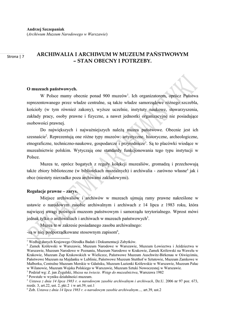 Andrzej Szczepaniak (Archiwum Muzeum Narodowego w Warszawie) ARCHIWALIA I ARCHIWUM W MUZEUM PAŃSTWOWYM – STAN OBECNY I POTRZEBY. Strona | 7 O muzeach państwowych. W Polsce mamy obecnie ponad 900 muzeów1. Ich organizatorem, oprócz Państwa reprezentowanego przez władze centralne, są także władze samorządowe różnego szczebla, kościoły (w tym również zakony), wyższe uczelnie, instytuty naukowe, stowarzyszenia, zakłady pracy, osoby prawne i fizyczne, a nawet jednostki organizacyjne nie posiadające osobowości prawnej. Do największych i najważniejszych należą muzea państwowe. Obecnie jest ich szesnaście2. Reprezentują one różne typy muzeów: artystyczne, historyczne, archeologiczne, etnograficzne, techniczno-naukowe, gospodarcze i przyrodnicze3. Są to placówki wiodące w muzealnictwie polskim. Wytyczają one standardy funkcjonowania tego typu instytucji w Polsce. Muzea te, oprócz bogatych z reguły kolekcji muzealiów, gromadzą i przechowują także zbiory biblioteczne (w bibliotekach muzealnych) i archiwalia - zarówno własne4 jak i obce (niestety nierzadko poza archiwami zakładowymi). Regulacje prawne – zarys. Miejsce archiwaliów i archiwów w muzeach ujmują ramy prawne nakreślone w ustawie o narodowym zasobie archiwalnym i archiwach z 14 lipca z 1983 roku, która najwięcej uwagi poświęca muzeom państwowym i samorządu terytorialnego. Wprost mówi jednak tylko o archiwaliach i archiwach w muzeach państwowych5. Muzea te w zakresie posiadanego zasobu archiwalnego: -są w niej podporządkowane stosownym zapisom6, 1 Według danych Krajowego Ośrodka Badań i Dokumentacji Zabytków. Zamek Królewski w Warszawie, Muzeum Narodowe w Warszawie, Muzeum Łowiectwa i Jeździectwa w Warszawie, Muzeum Narodowe w Poznaniu, Muzeum Narodowe w Krakowie, Zamek Królewski na Wawelu w Krakowie, Muzeum Żup Krakowskich w Wieliczce, Państwowe Muzeum Auschwitz-Birkenau w Oświęcimiu, Państwowe Muzeum na Majdanku w Lublinie, Państwowe Muzeum Stutthof w Sztutowie, Muzeum Zamkowe w Malborku, Centralne Muzeum Morskie w Gdańsku, Muzeum Łazienki Królewskie w Warszawie, Muzeum Pałac w Wilanowie, Muzeum Wojska Polskiego w Warszawie, Muzeum Sztuki Nowoczesnej w Warszawie. 3 Podział wg: Z. jun Żygulski, Muzea na świecie. Wstęp do muzealnictwa, Warszawa 1982 4 Powstałe w wyniku działalności muzeum. 5 Ustawa z dnia 14 lipca 1983 r. o narodowym zasobie archiwalnym i archiwach, Dz.U. 2006 nr 97 poz. 673, rozdz. 3, art.22, ust. 2, pkt.2 i w art.39, ust.1 6 Zob. Ustawa z dnia 14 lipca 1983 r. o narodowym zasobie archiwalnym…, art.39, ust.2 2 - prowadzą działalność archiwalną w zakresie państwowego zasobu archiwalnego7, - gromadząc i przechowując materiały archiwalne, pełnią funkcję jednostek państwowej sieci, archiwalnej w zakresie tych materiałów8, - mają określone prawa i obowiązki związane z gromadzeniem, ewidencjonowaniem, Strona | 8 przechowywaniem i zabezpieczaniem archiwaliów9, - są zobowiązane do zakładania i prowadzenia archiwów zakładowych - dotyczy to także muzeów samorządu terytorialnego, a także (w innych muzeach samorządowych) jednostek organizacyjnych, w których powstają materiały archiwalne10, - mają obowiązek przekazywania po 25 latach od daty wytworzenia zgromadzonych materiałów archiwalnych do właściwych archiwów państwowych11. Ustawa o narodowym zasobie archiwalnym i archiwach ze swej natury zawiera zasady dość ogólne i wiele bardzo ważnych kwestii pozostawia nierozstrzygniętych. W praktyce ich szczegółowe regulacje można znaleźć dopiero w muzealnych aktach normatywnych12. Są one określane arbitralnymi decyzjami poszczególnych władz muzealnych i bywa, że niektóre z nich niestety kolidują z prawem archiwalnym. Archiwalia i archiwa w muzeach oraz ich zróżnicowany status. Archiwalia w muzeach były gromadzone „od zawsze”. „Od zawsze” archiwalia w muzeach są także w nich przechowywane, mimo obowiązku jaki nakłada na nie Ustawa z 1983 roku. Dotyczy to zarówno archiwaliów pochodzenia własnego jak i obcego. Archiwalia własne związane z działalnością statutową, łączą się bezpośrednio z dziejami konkretnych muzeów i ich specyfiką zbiorów. Są one szczególnie ważne, ponieważ odzwierciedlają odrębność i niepowtarzalność każdego z muzeów. Najważniejszą i ilościowo największą jej część stanowią materiały archiwalne dokumentujące działalność merytoryczną, konserwatorską i wystawienniczą poszczególnych muzeów. Występują one najczęściej w postaci aktowej, ale także fotograficznej, filmowej, fonograficznej oraz coraz częściej elektronicznej. Archiwalia obce w muzeach pochodzą od bardzo różnych wytwórców. Związane są one najczęściej ze statutową działalnością określonego muzeum. Bywa jednak, że nie mają one bezpośrednio żadnego związku z muzeum i nierzadko są starsze niż samo muzeum. Materiały te są bardzo różnorodne pod względem treści i formy. Wśród nich można znaleźć 7 Ibidem art.22, ust.2, pkt.2 Pod tym względem stawia więc je na równi z archiwami państwowymi – zob. ibidem art.39, ust.1 9 Ustawa z dnia 14 lipca 1983 r. o narodowym zasobie archiwalnym…, art.45 10 Ibidem, art. 33 11 Zob. ibidem, art.34 12 W statutach, regulaminach organizacyjnych, zarządzeniach. 8 spuścizny13, materiały ikonograficzne14, rodowe15 i kartograficzne16, materiały dokumentujące życie artystyczne17, kulturalne18 i społeczno-gospodarcze19, dokumentację naukowotechniczną20, a także efemerydy i zbiory wycinków prasowych. Archiwa zakładowe, tzw. naukowe i inne (a właściwie muzea państwowe, w których Strona | 9 one funkcjonują), skutecznie uchylają się od obowiązku przekazywania zgromadzonych archiwaliów do właściwych archiwów państwowych. Robią to w różny sposób. Niektóre z nich w latach minionych zyskały status jednostek organizacyjnych z zasobem powierzonym21. Inne przechowują zasób historyczny